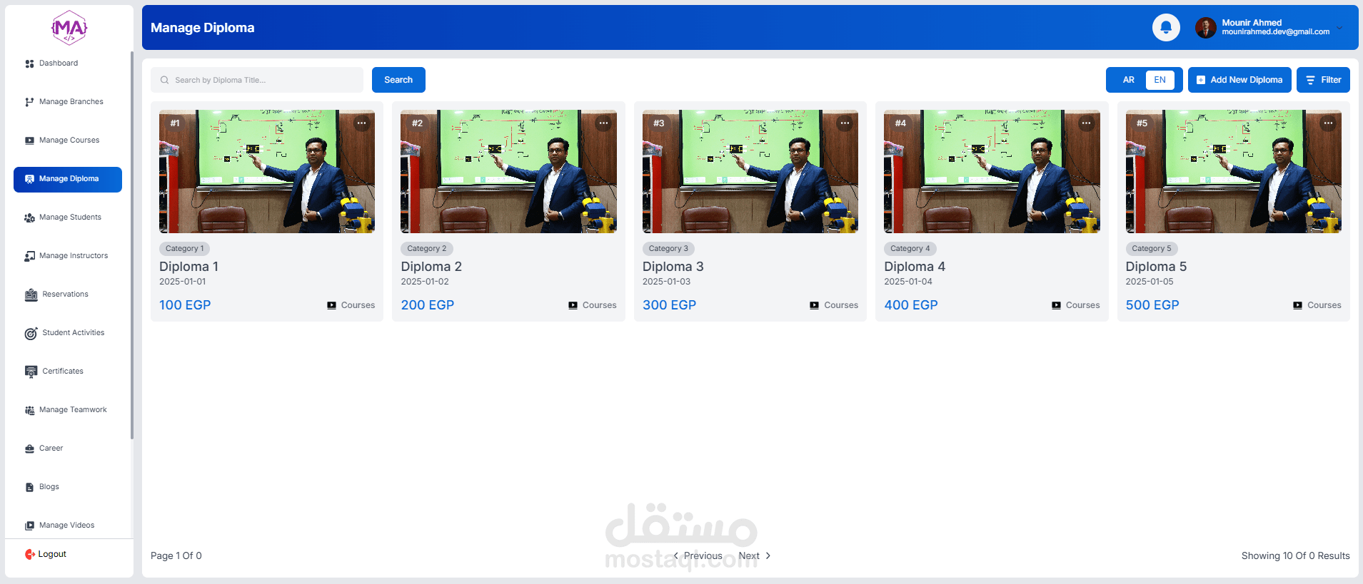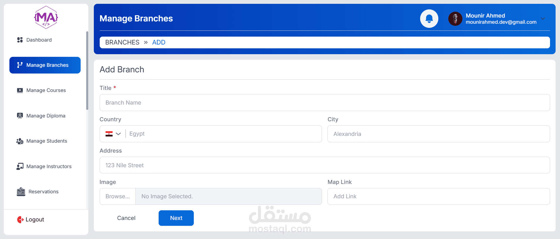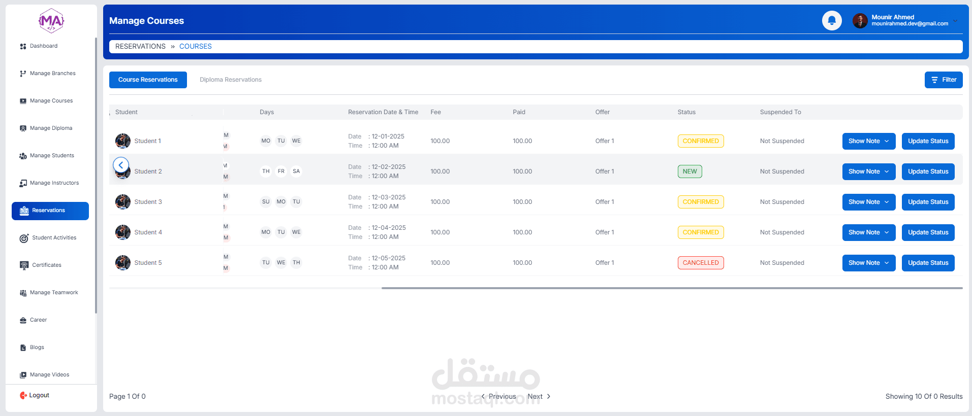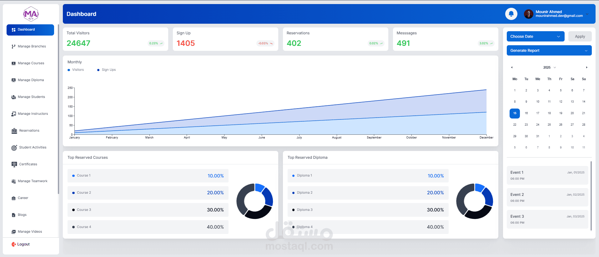 A full-featured educational management dashboard, role-based for managing courses, students, instructors, and operations. Includes student enrollment, course scheduling, reservations, certificates, analytics, and admin controls. Built with a responsive UI and real-time data management.