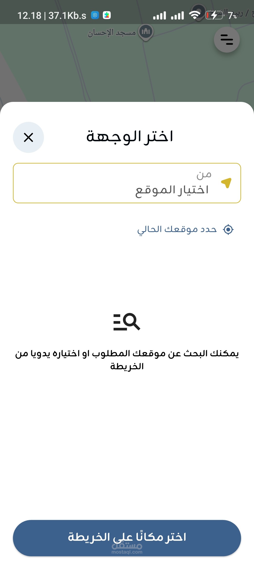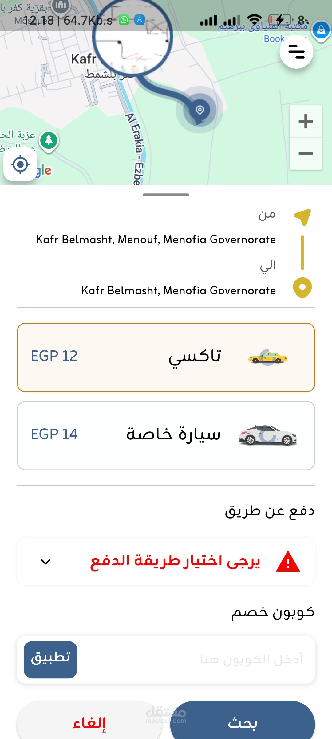 اختيار الرحلة من الخريطة: يمكن للمستخدم تحديد نقطة الانطلاق والوصول مباشرة عبر الخريطة أو البحث عن الوجهة.
