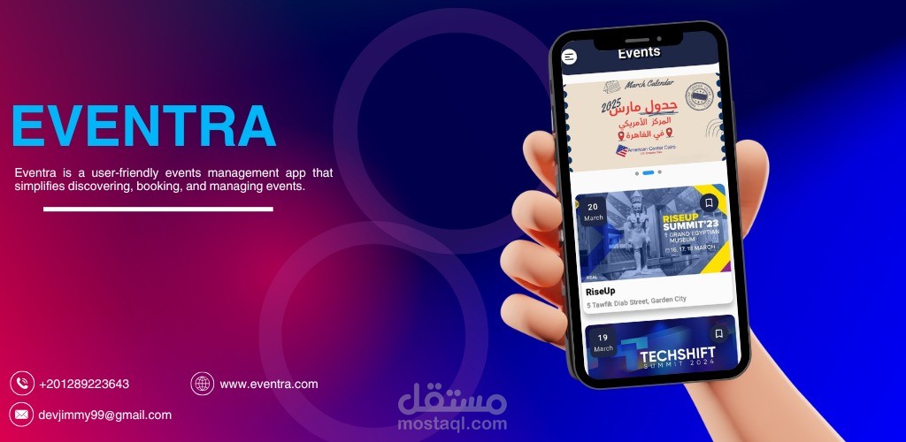 قمت بتطوير تطبيق Eventra كمنصة مركزية لإدارة وتجميع الفعاليات، تهدف إلى تسهيل اكتشاف الفعاليات، حجزها، وإدارتها من خلال تجربة استخدام سلسة وحديثة.