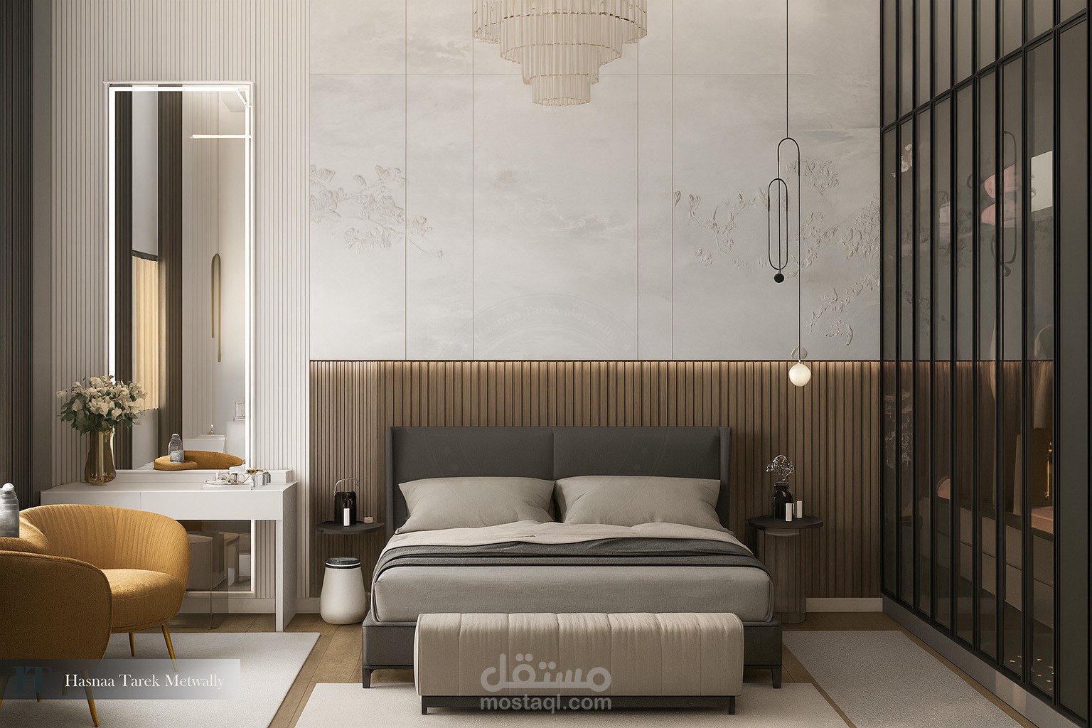 تصميم غرفة نوم عصرية يتميز بالهدوء والأناقة، مع الاعتماد على ألوان محايدة دافئة تعزز الإحساس بالراحة والاسترخاء.