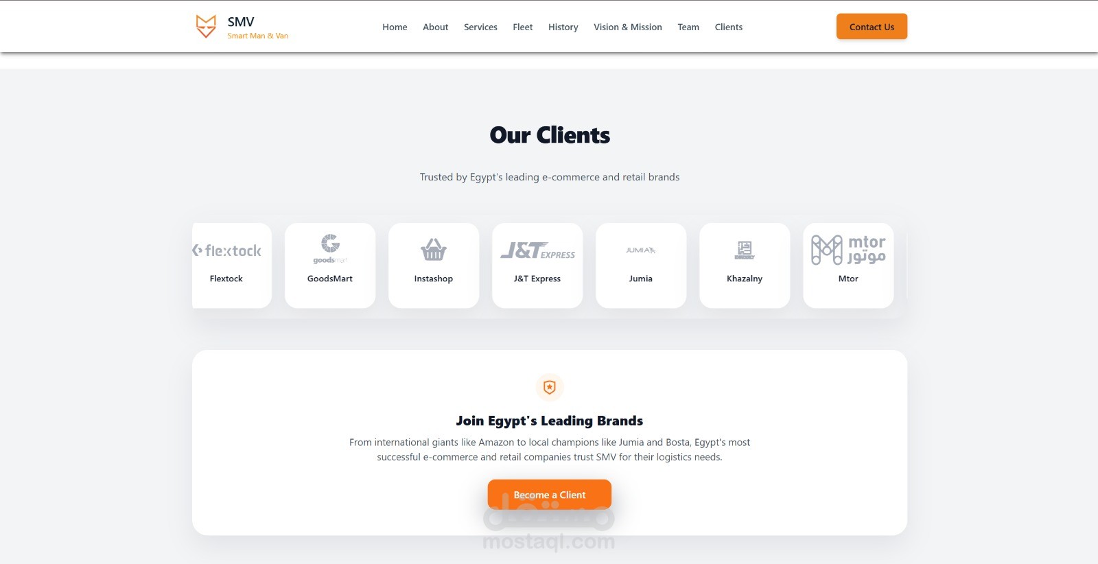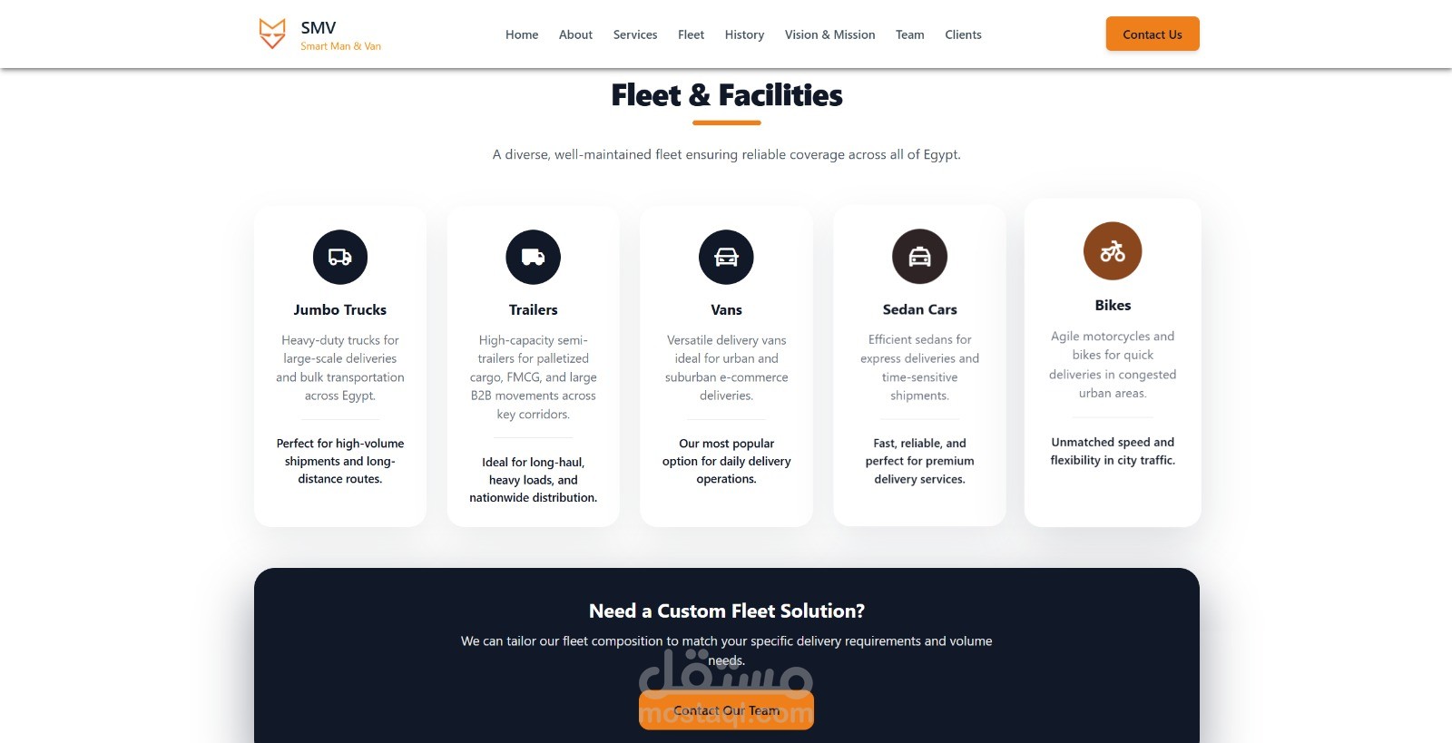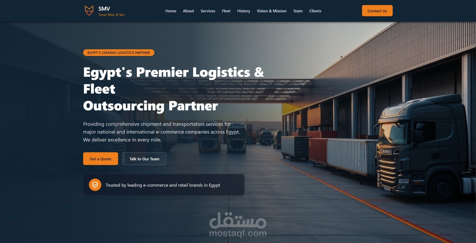 الموقع الرسمي لشركة SMV، الشريك الرائد في مصر لخدمات النقل وتعهيد الأساطيل (Fleet Outsourcing). تم تطوير المنصة لعرض حلول الشحن المتكاملة التي تقدمها الشركة لكبرى شركات التجارة الإلكترونية المحلية والدولية في جميع أنحاء مصر.