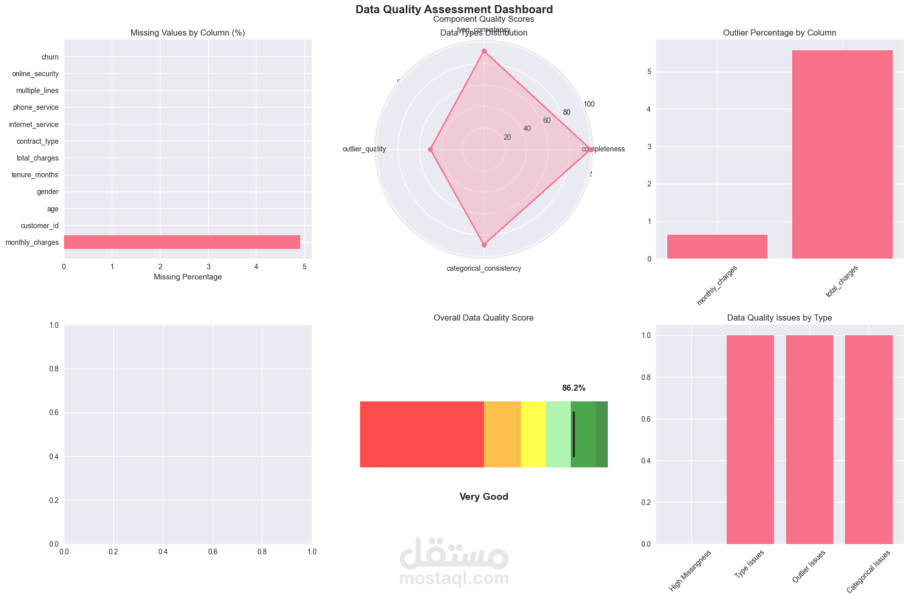 A synthetic dataset was designed to closely simulate real-world telecom data, including realistic data quality issues such as missing values, outliers, inconsistent data types, and categorical inconsistencies.