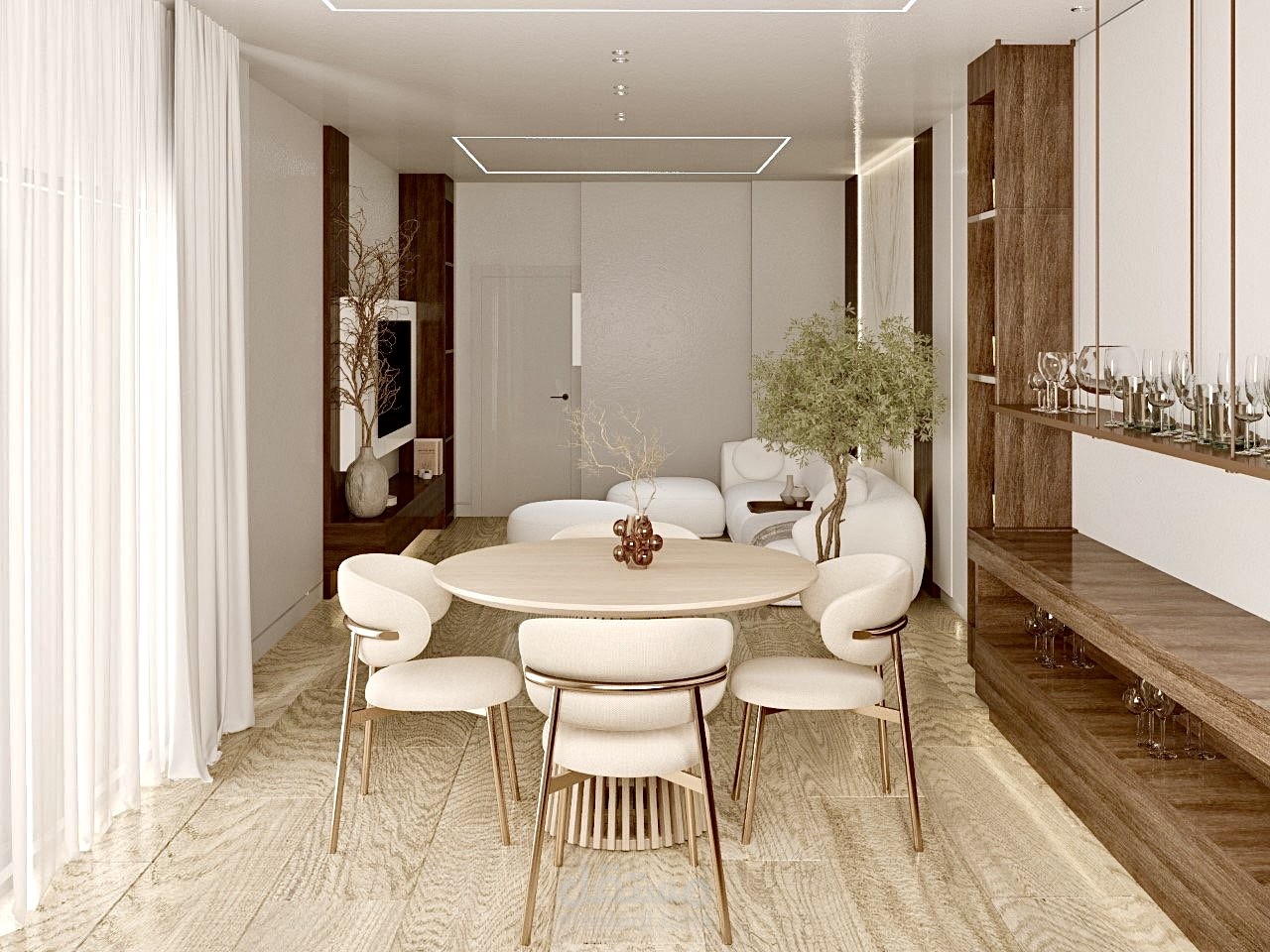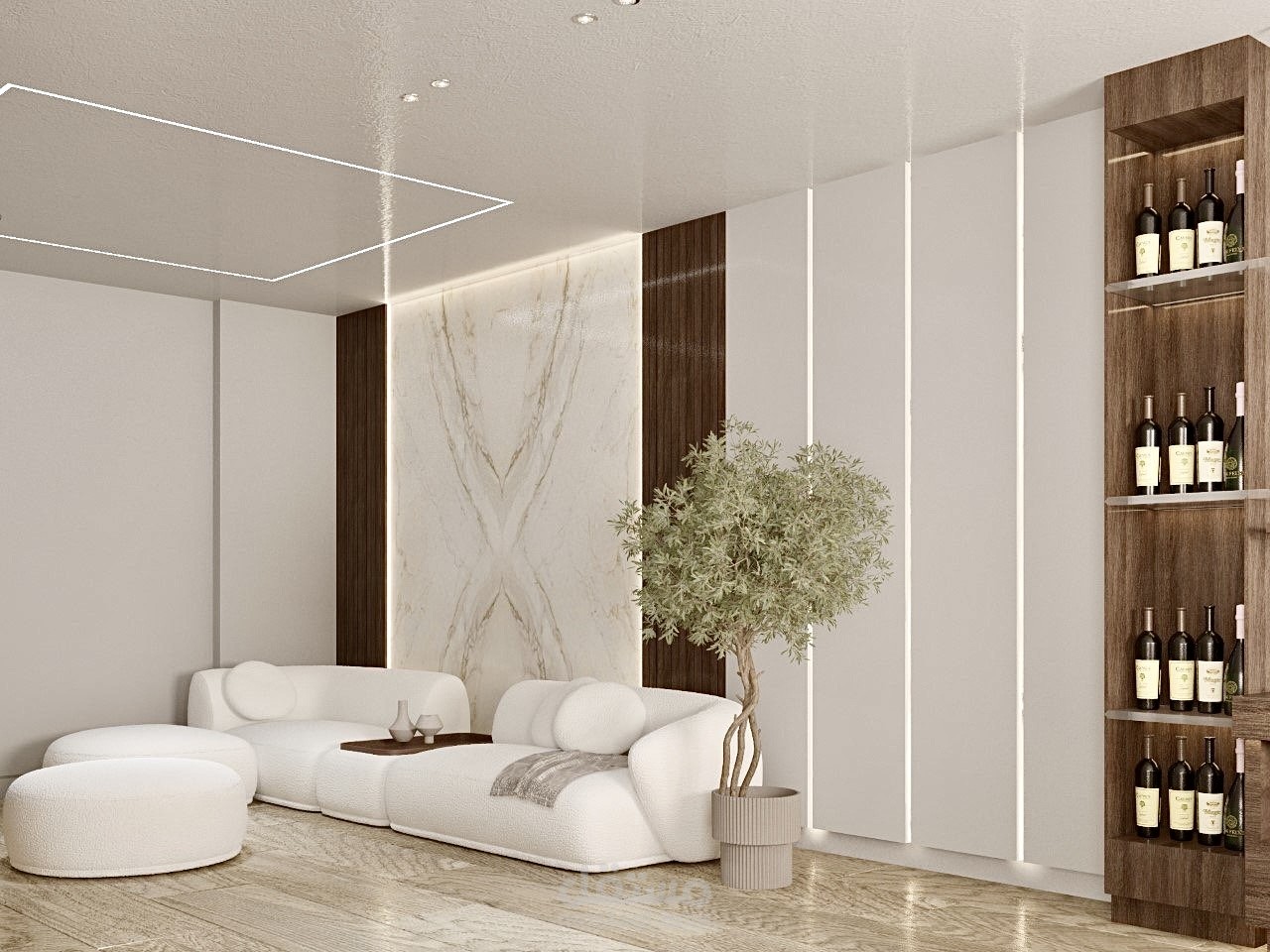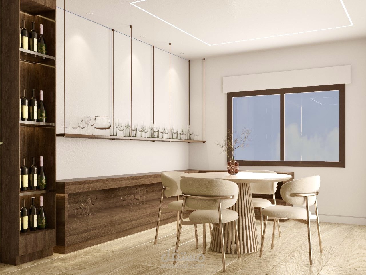 تم تصميم غرفة جلوس بنمط عصري مع ركن بار وجلوس خاص فيه باعتماد ألوان محايدة مريحة للعين