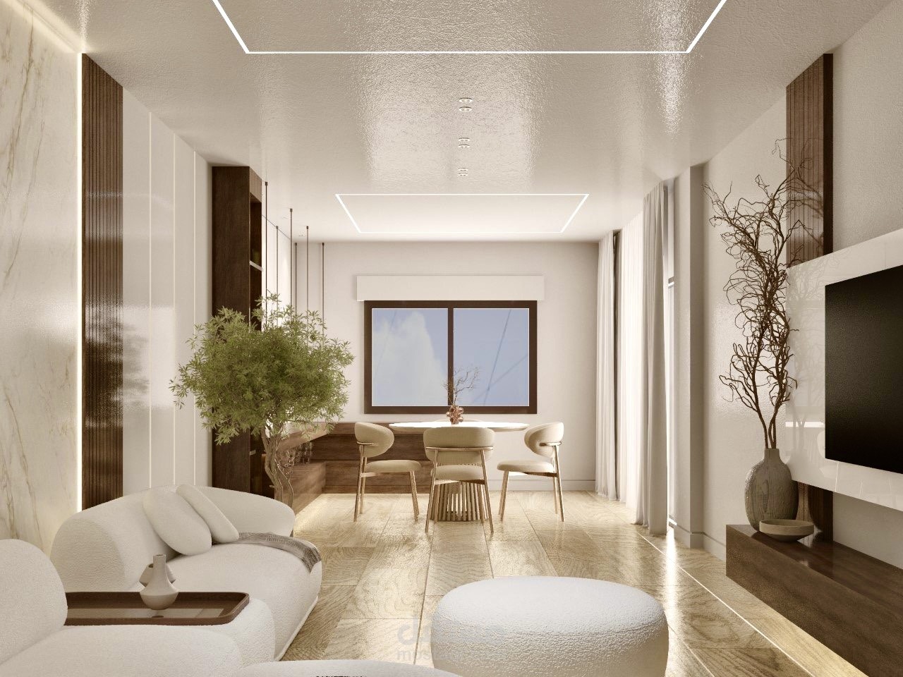 تم التنفيذ باستخدام الباركيه للأرضيات واستخدام الجبسن بورد للسقف أما بالنسبة للجدران تم استخدام الخشب وبديل الرخام