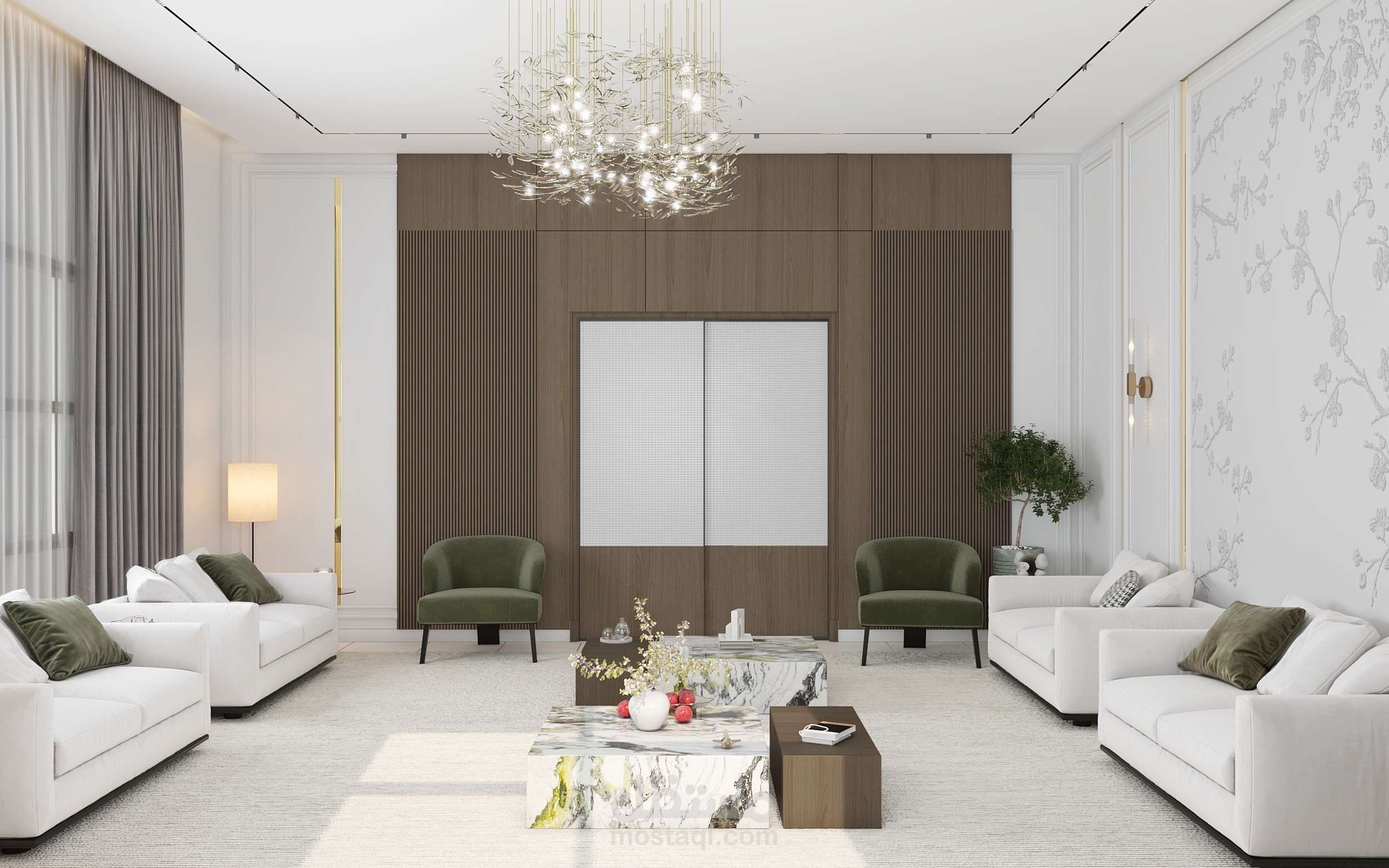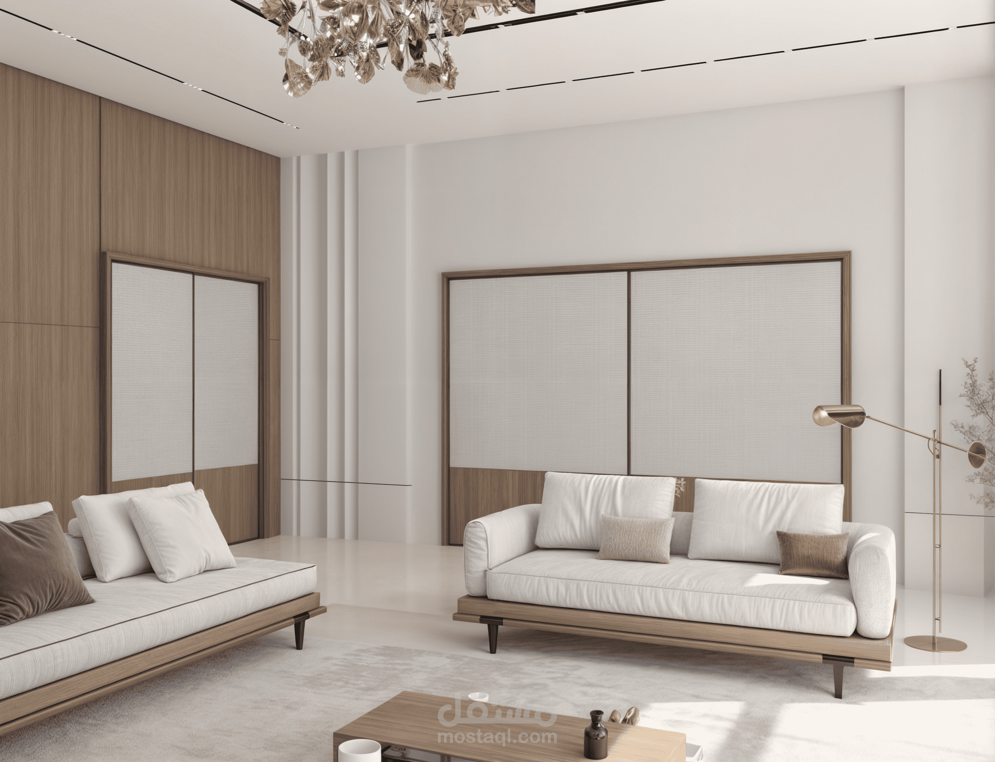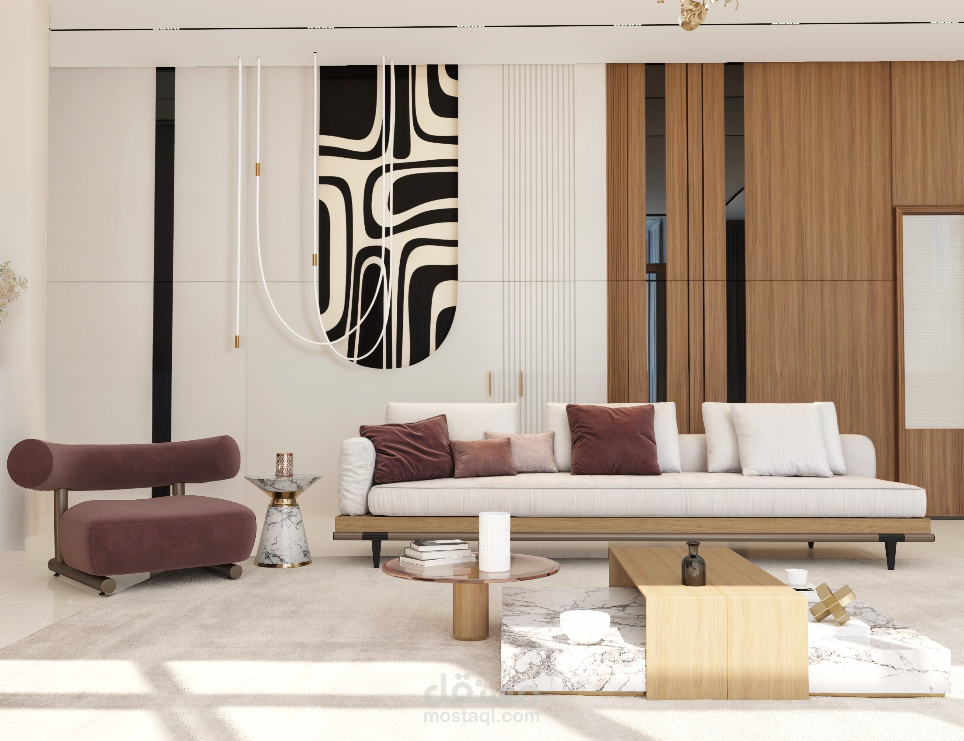 التصميم يعكس اهتمامًا واضحًا بـ التفاصيل، النِسَب، وتناسق الخامات، مع مراعاة سهولة الحركة ومرونة الاستخدام، ليكون الفراغ مناسبًا للاستخدام اليومي والاستقبال في آنٍ واحد.