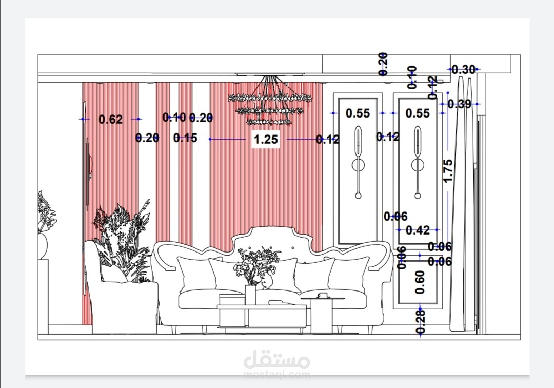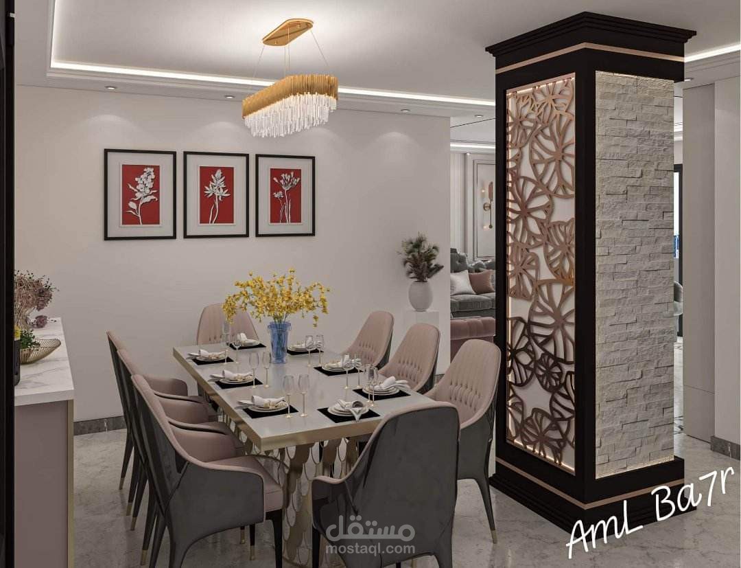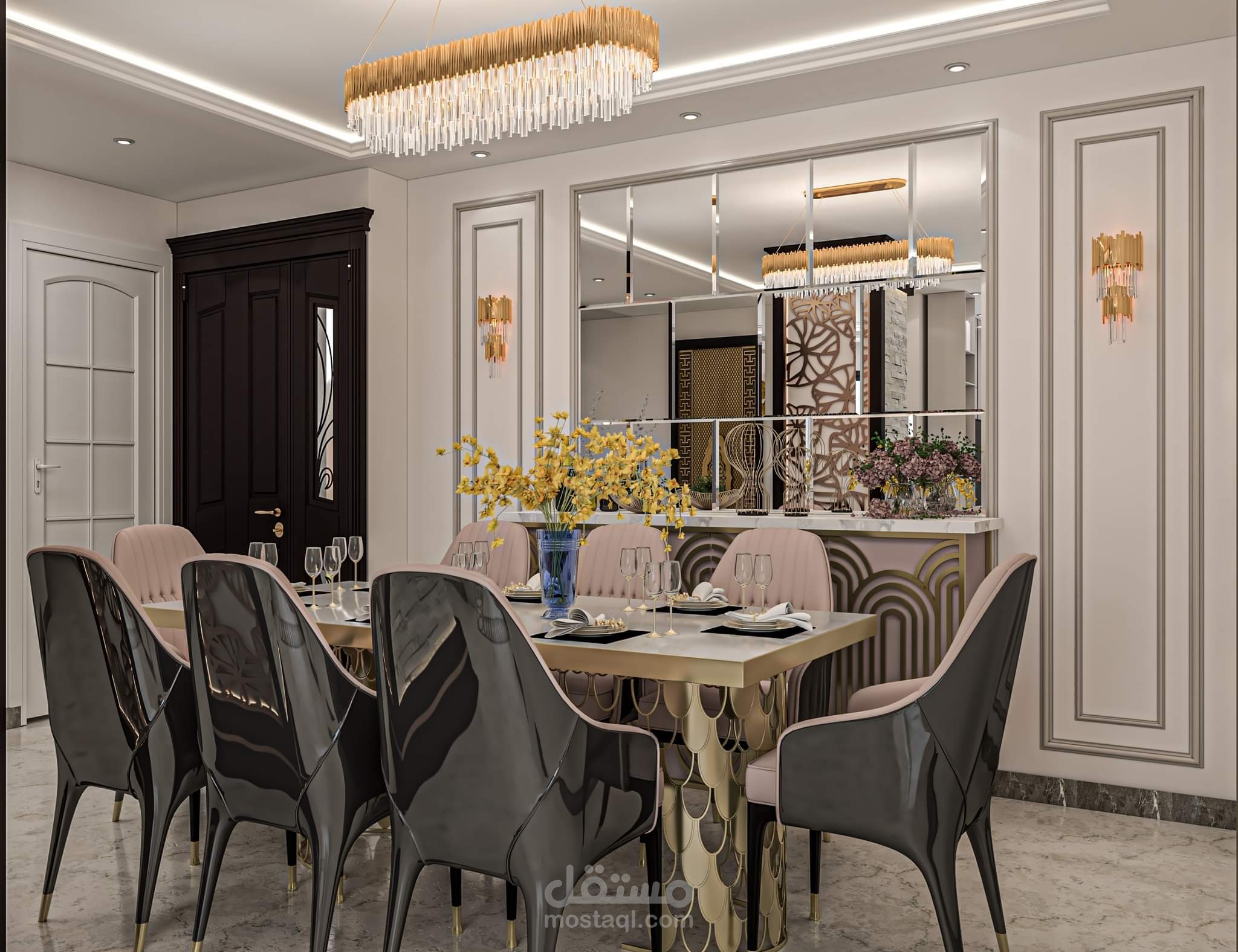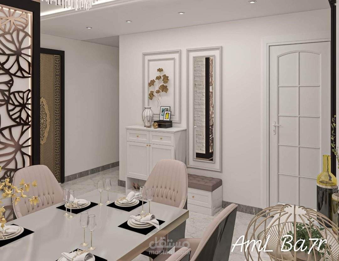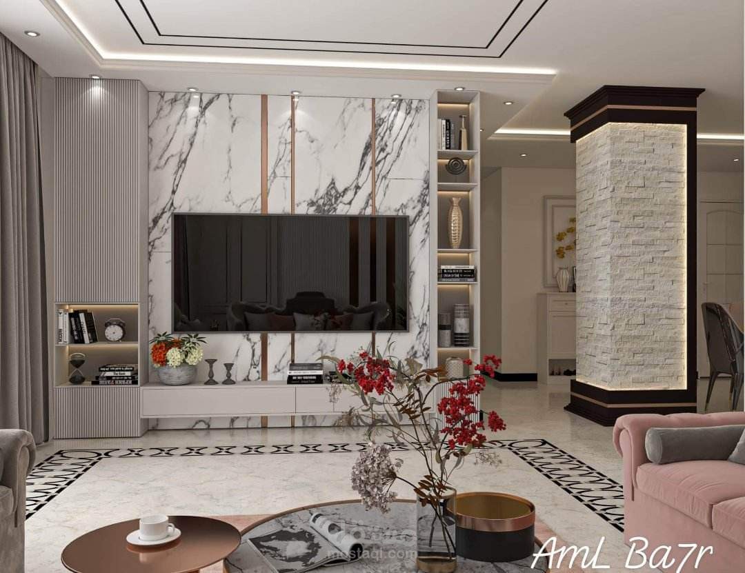 "تصميم داخلي بأسلوب 'النيو كلاسيك' يتميز بالمعالجات الجدارية الغنية والمتنوعة. يدمج الفراغ بين إطارات الحائط الكلاسيكية (البانوهات)، وتجاليد حديثة من بديل الرخام المطعم بشرائط الاستانلس الذهبي، بالإضافة إلى استخدام المرايا الهندسية لخلق عمق بصري. تلعب الإضاءة المخفية دوراً أساسياً في إبراز الأسقف المعلقة متعددة المستويات وتأكيد ملمس العمود الحجري البارز، بينما تربط الأرضيات اللامعة ذات الكنارات المحددة أجزاء الفراغ المفتوح ببعضها البعض.