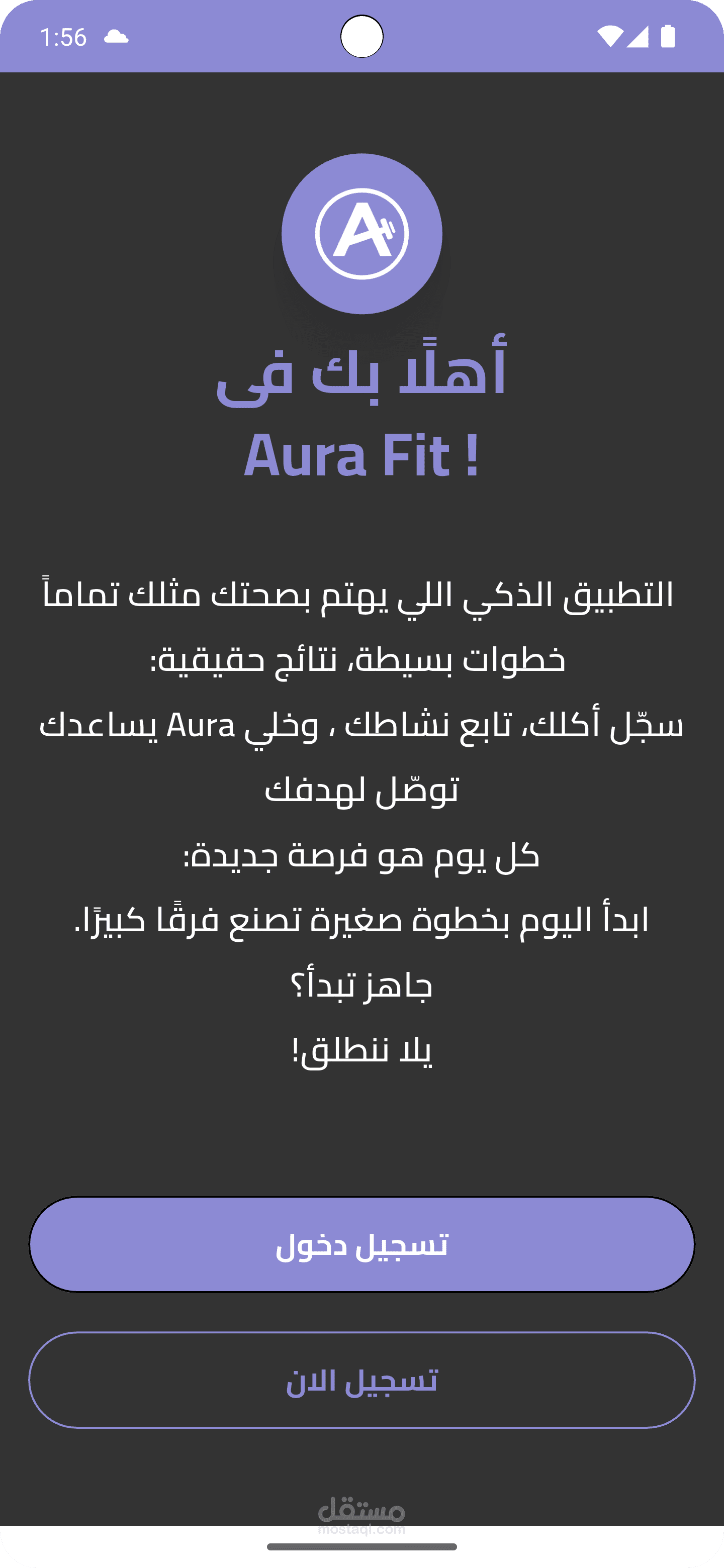 AuraFit هو تطبيق لياقة بدنية ذكي يعتمد على الذكاء الاصطناعي لمساعدة المستخدمين على بناء نمط حياة صحي بطريقة بسيطة وفعّالة.