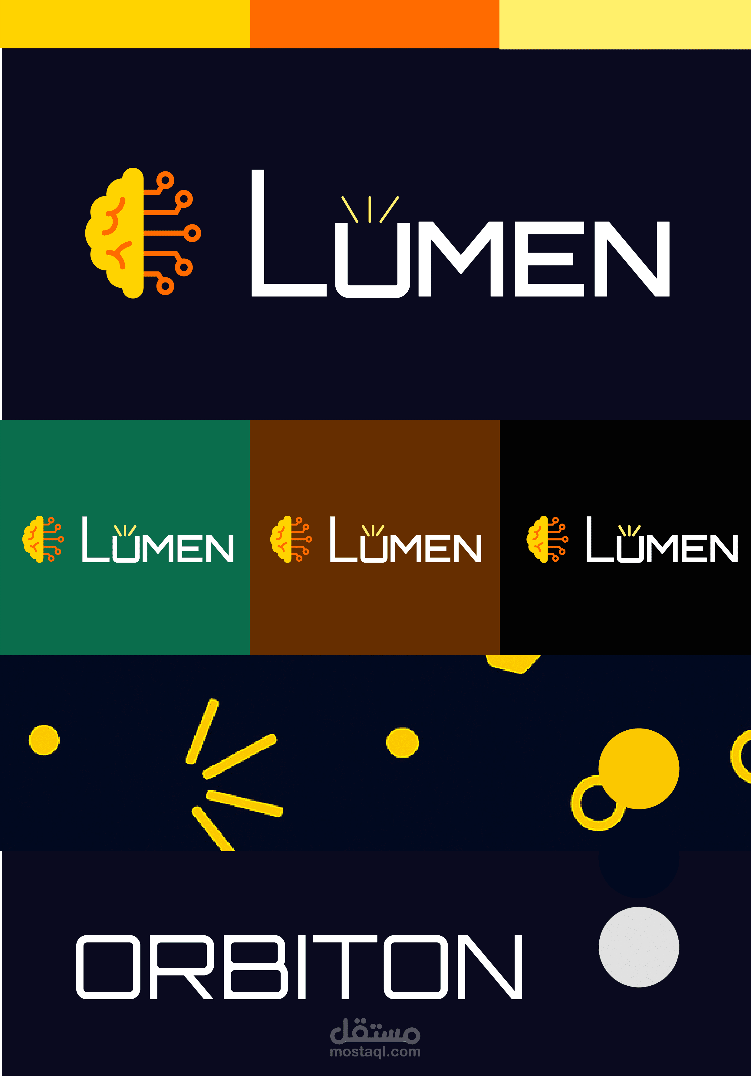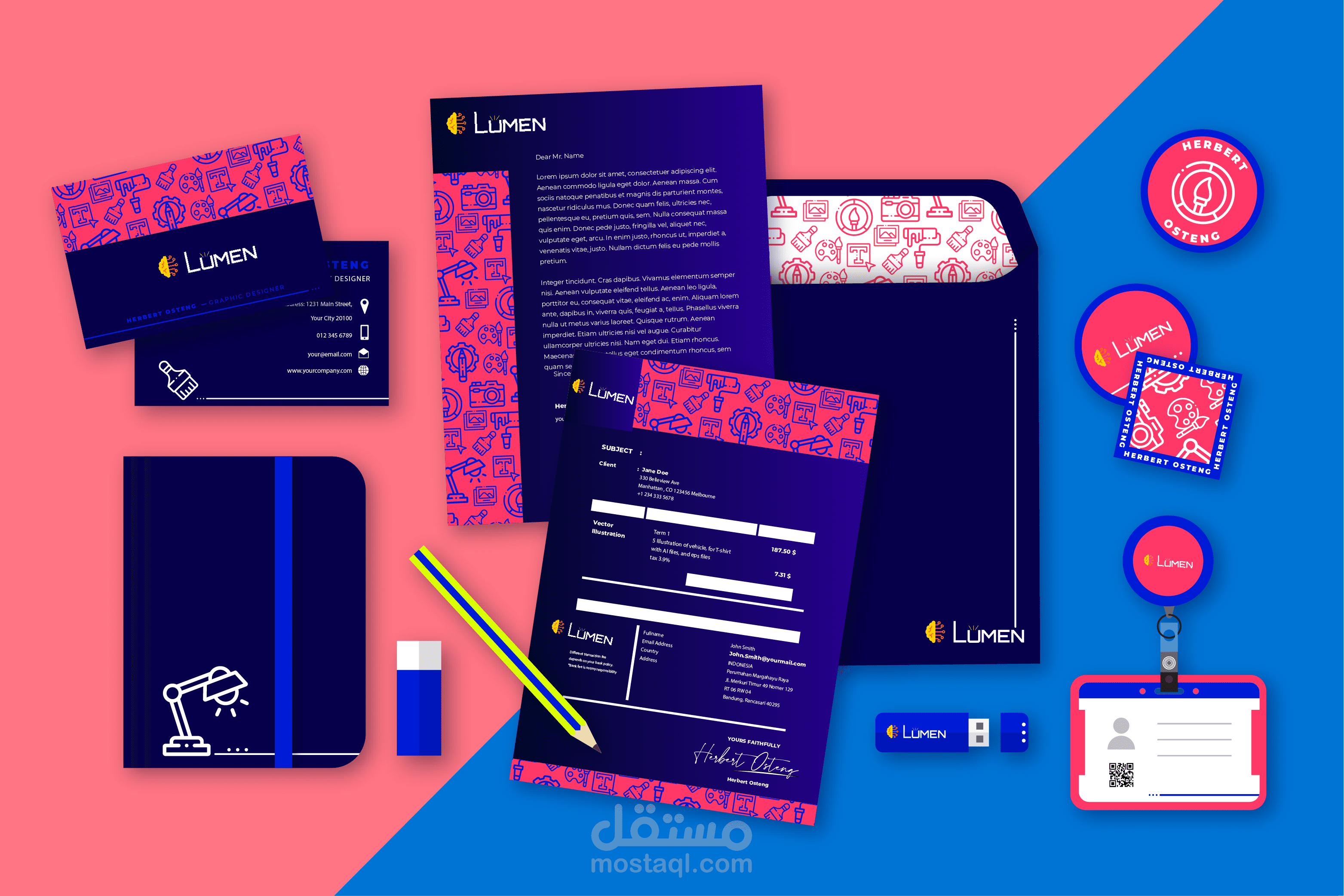 Lumen هو مشروع براند يركز على الإبداع، الوضوح، والطاقة الإيجابية. تم تصميم هويته البصرية بعناية لتوصيل رسالة العلامة التجارية بأسلوب عصري وجذاب، مع استخدام ألوان مستوحاة من الضوء والطاقة (الأصفر والذهبي) للتعبير عن التفاؤل والحيوية، وخطوط نظيفة وسهلة القراءة لتعكس الاحترافية. يشمل البراند عناصر مثل الشعاع الضوئي والرموز البسيطة التي تبرز مفهوم الإلهام والابتكار. هدف هذا البراند هو خلق تجربة بصرية متكاملة تعكس قيم Lumen: الإبداع، الوضوح، والتأثير الإيجابي، سواء على المنصات الرقمية أو في المطبوعات التسويقية."