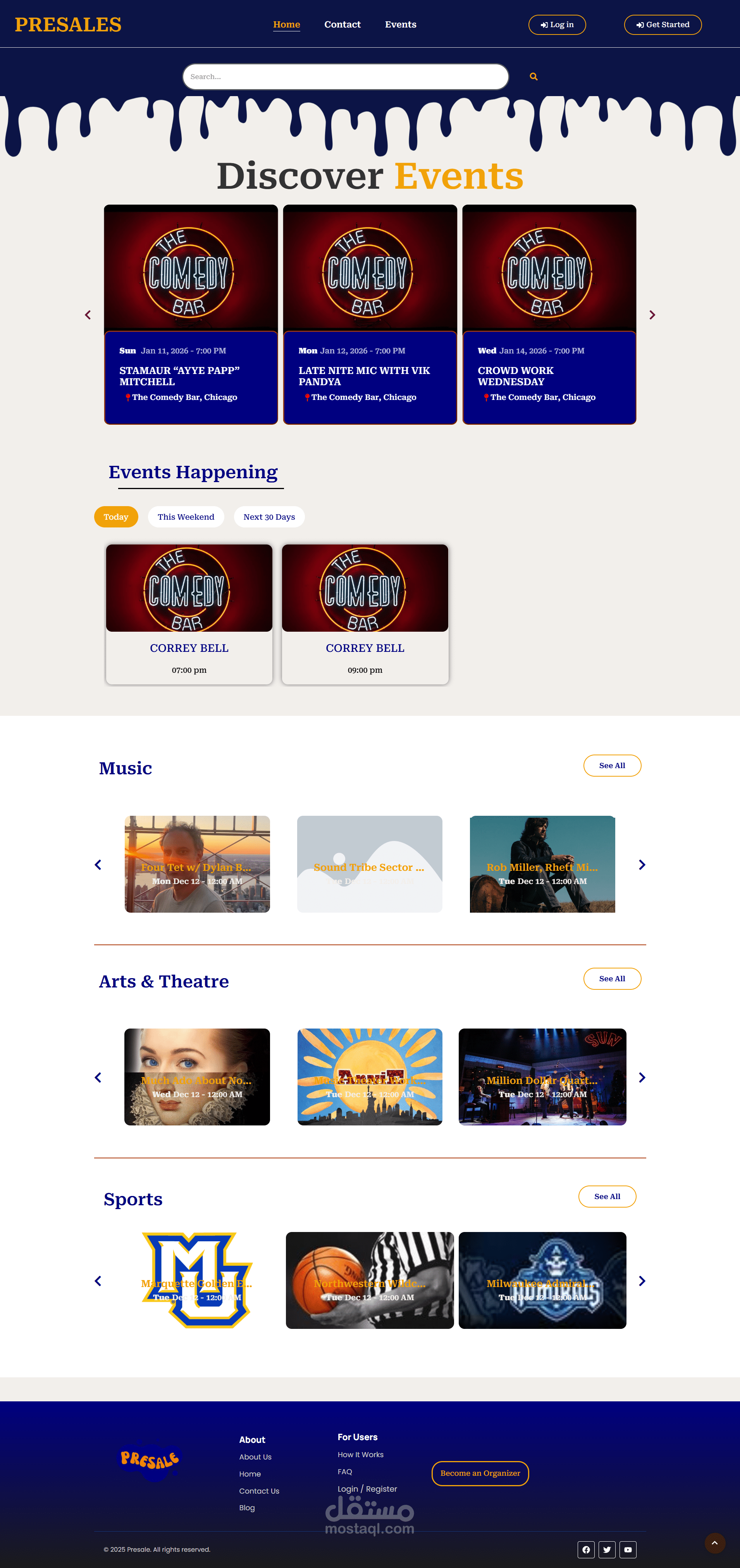 قمت بتطوير وبناء منصة ويب تفاعلية متخصصة في عرض وتسويق الحفلات والأحداث (Events & Concerts). المنصة لا تكتفي بعرض الأحداث من قبل الإدارة فقط، بل تعمل بنظام "السوق المتعدد" (Multi-Organizer System)، مما يسمح لطرف ثالث (منظمي الحفلات) بالمشاركة في إثراء المحتوى.