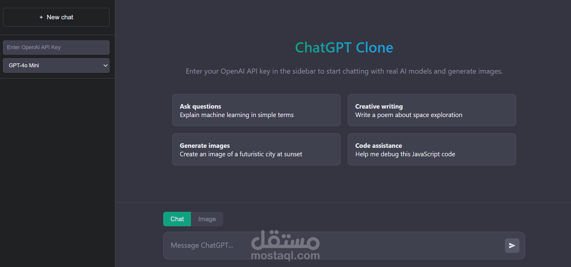 قمت بتطوير واجهة أمامية لتطبيق ChatGPT Clone يحاكي تجربة الدردشة الذكية، مع التركيز على سهولة الاستخدام وسرعة التفاعل. يوفر التطبيق واجهة محادثة عصرية تتيح للمستخدم كتابة الأسئلة واستقبال الردود بشكل منظم وسلس.