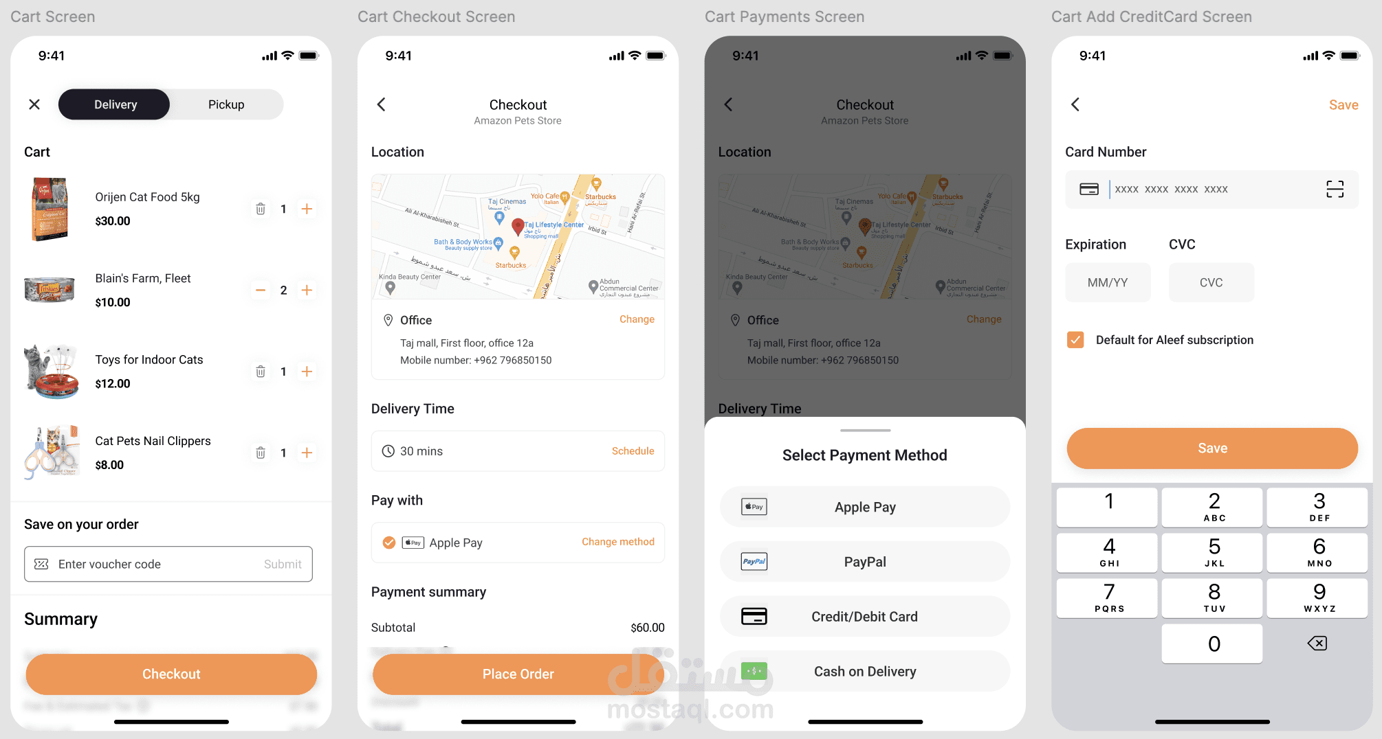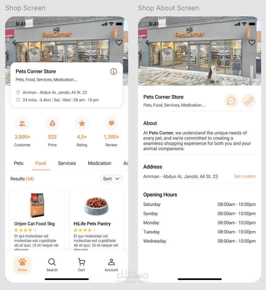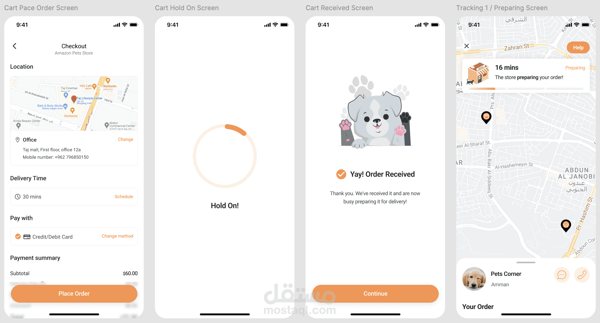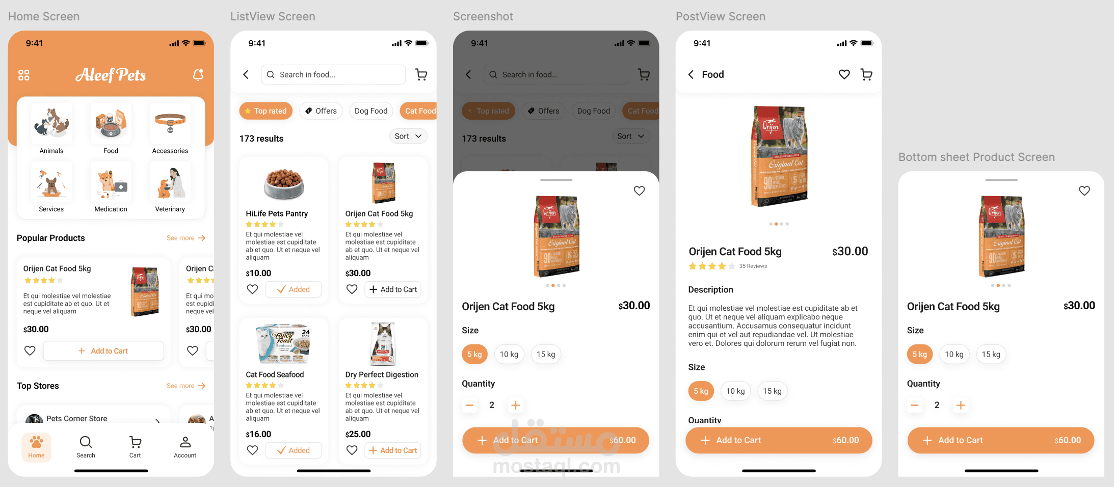 Personalization is key on the Profile Screen. Users can manage account details, track order history, and customize preferences. With the ability to set up profiles for multiple pets, Aleef ensures a tailored experience for each furry friend.