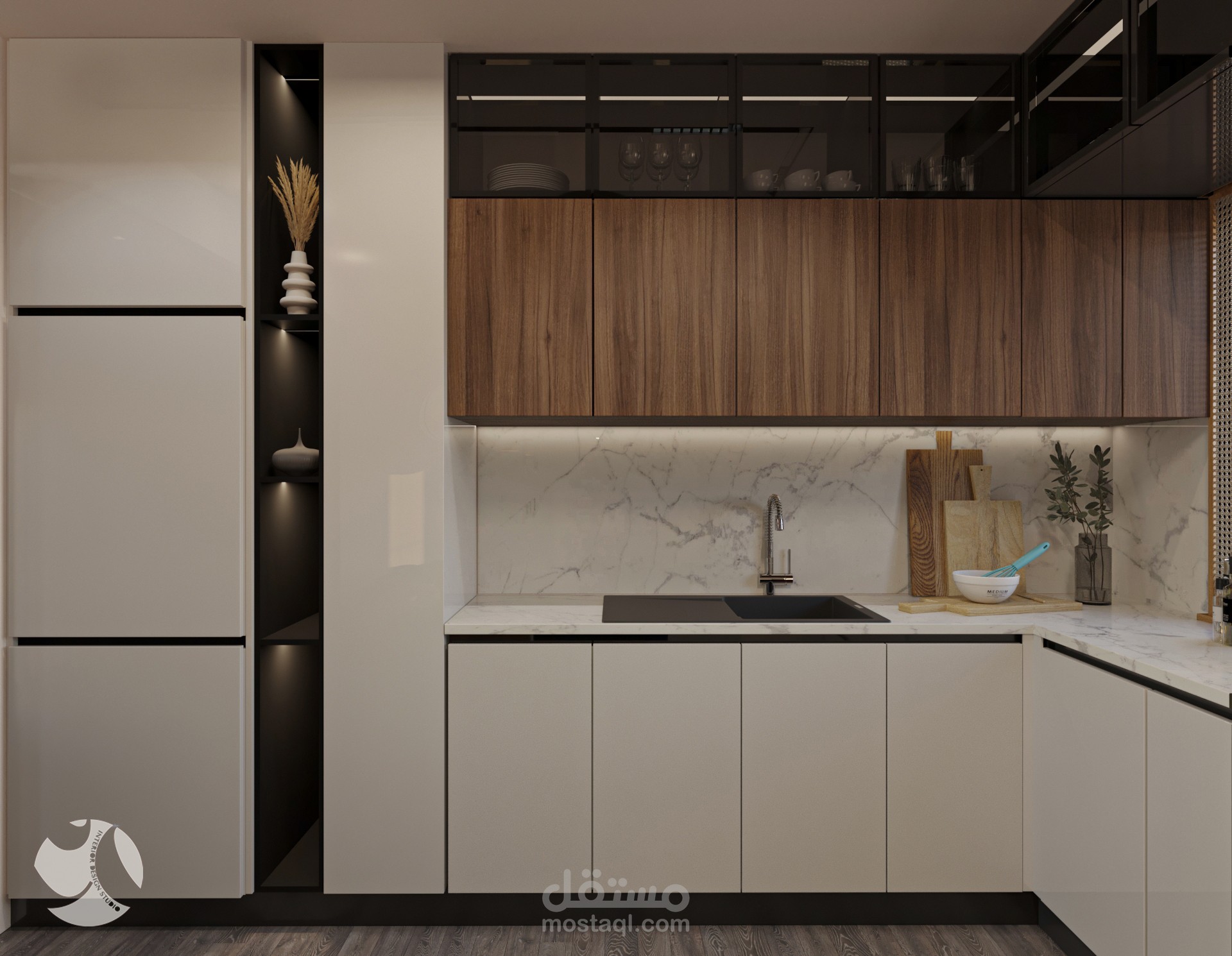 harmonious blend of modern functionality and warm aesthetics. The design pairs sleek, light-toned lower cabinets with rich, natural wood overhead units, creating a sophisticated contrast. Featuring a marble backsplash for luxury, and an integrated wooden island with rattan stools, the kitchen functions as both an efficient workspace and a welcoming social hub.