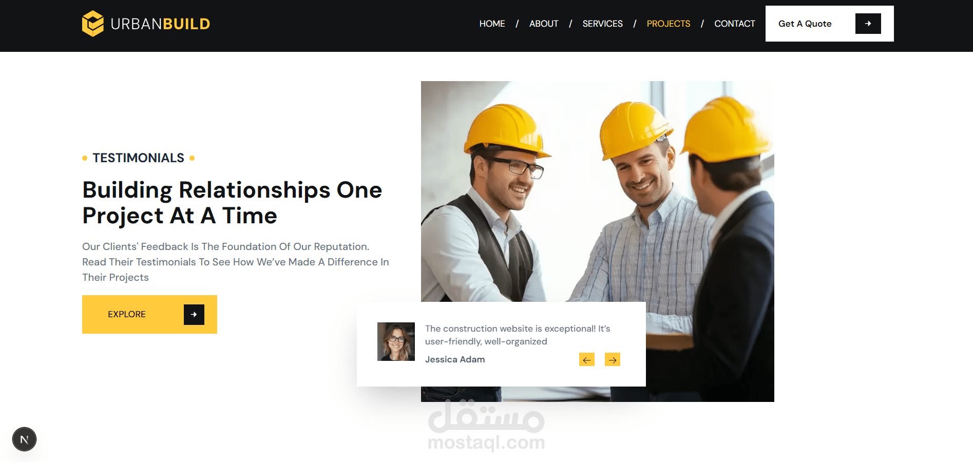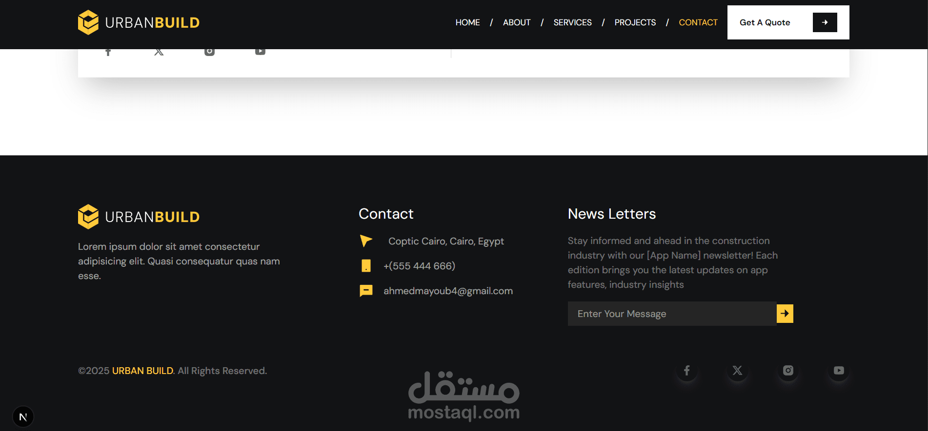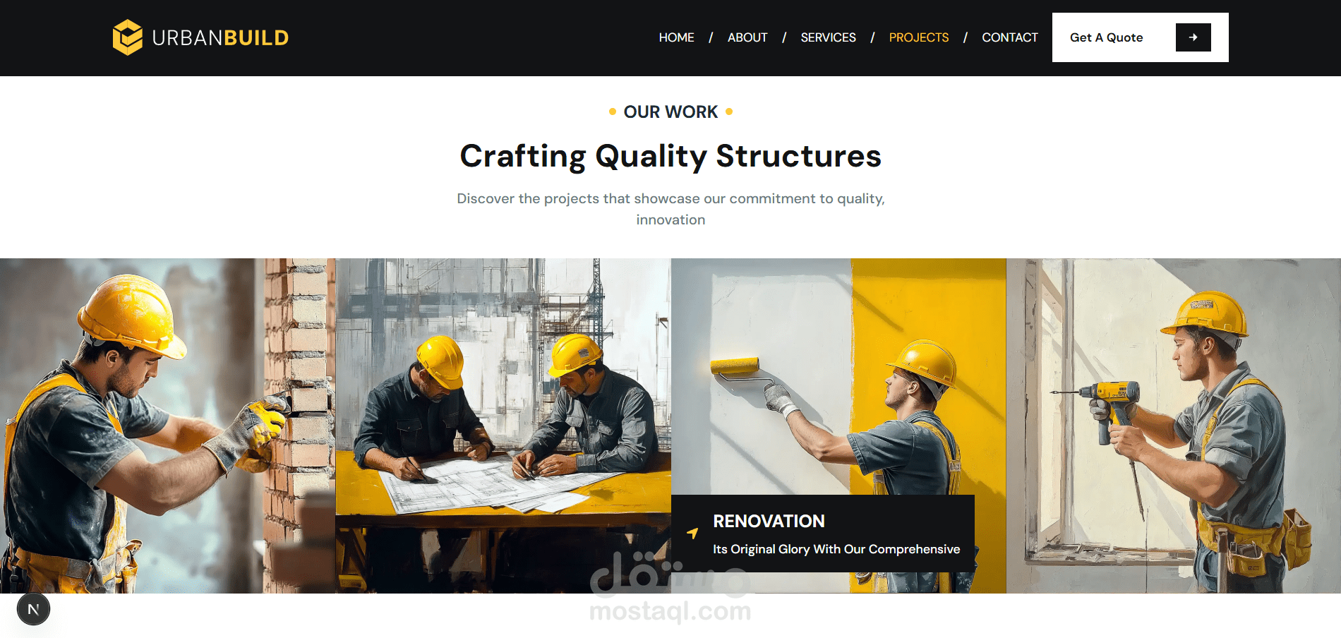 Urban Build هو موقع احترافي لشركة إنشاءات، تم تصميمه وتطويره لتقديم خدمات البناء والتشييد بأسلوب عصري يجمع بين القوة، الثقة، وسهولة الاستخدام.