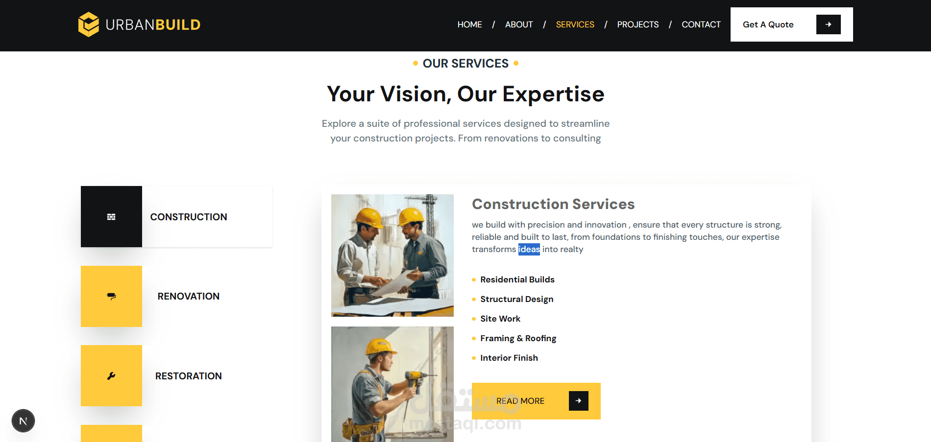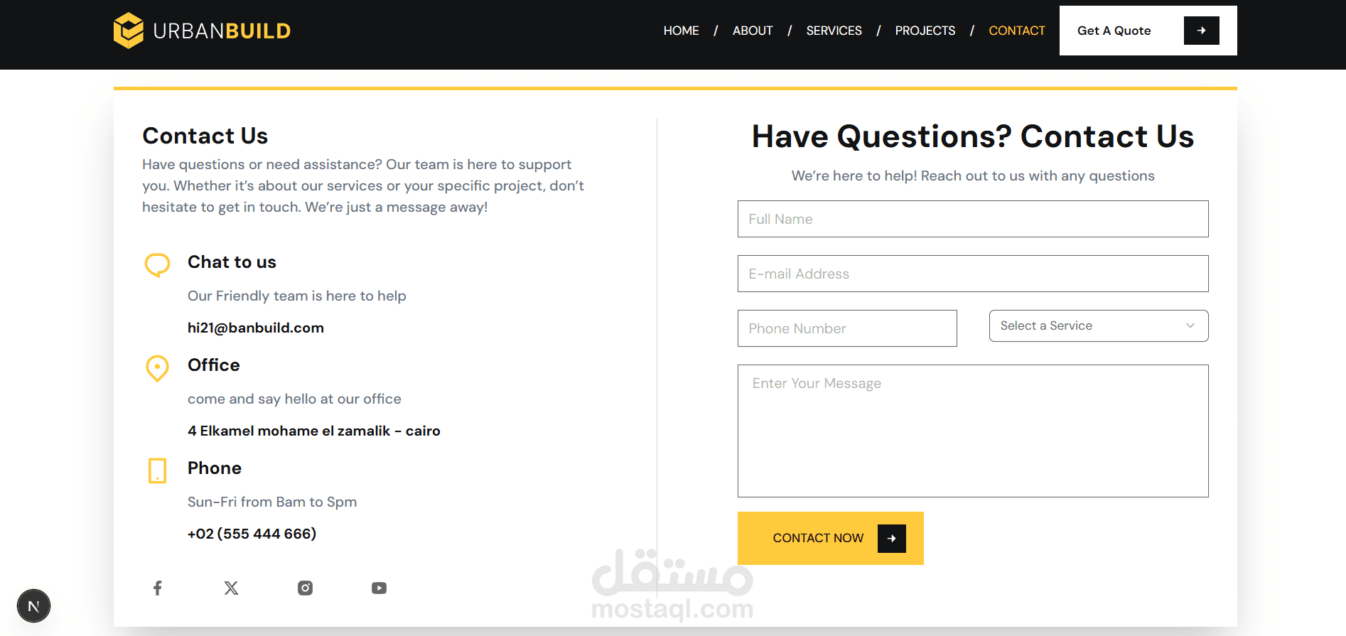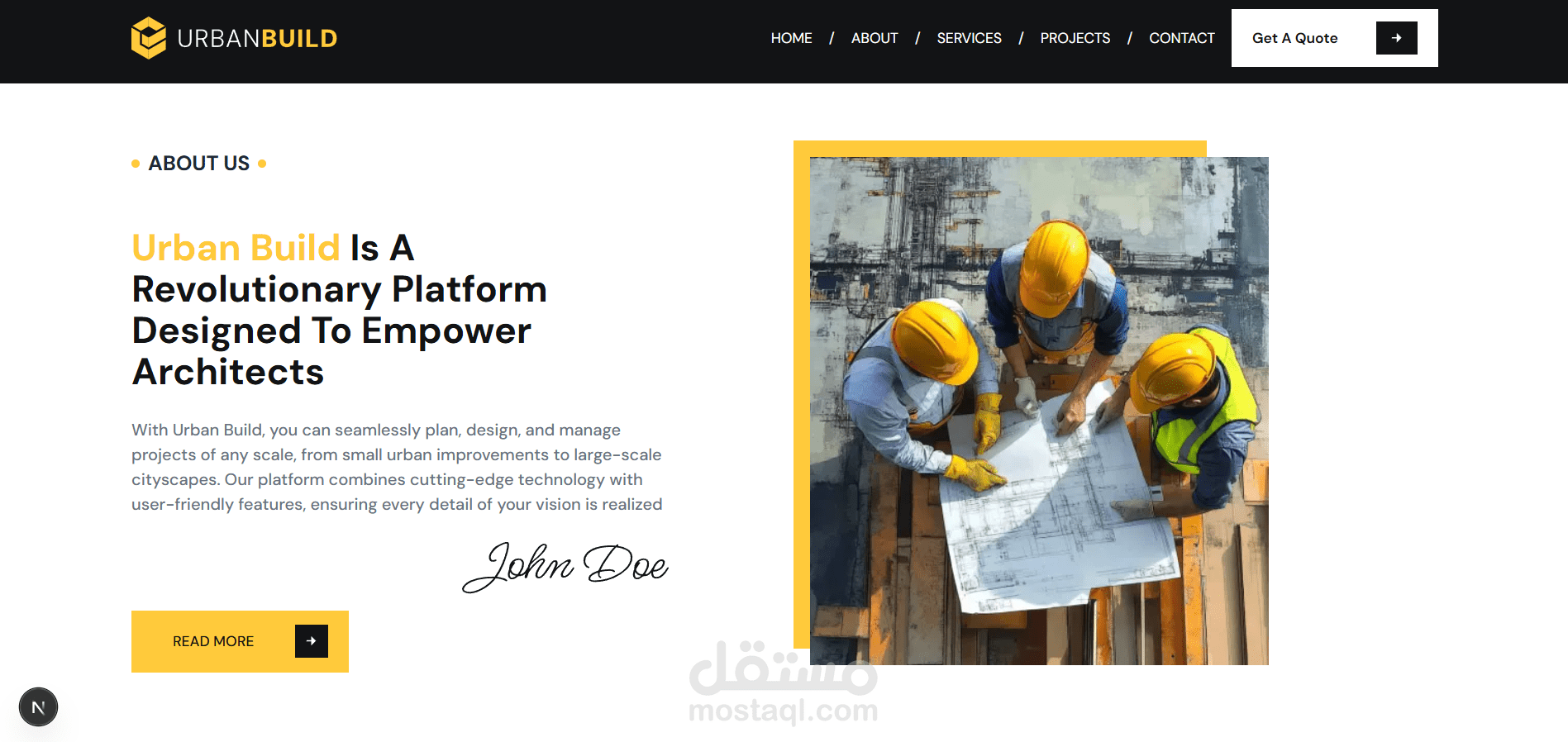 Urban Build هو موقع احترافي لشركة إنشاءات، تم تصميمه وتطويره لتقديم خدمات البناء والتشييد بأسلوب عصري يجمع بين القوة، الثقة، وسهولة الاستخدام.