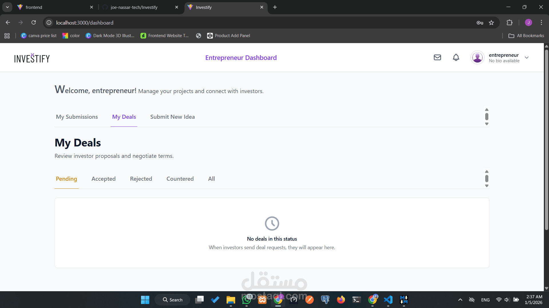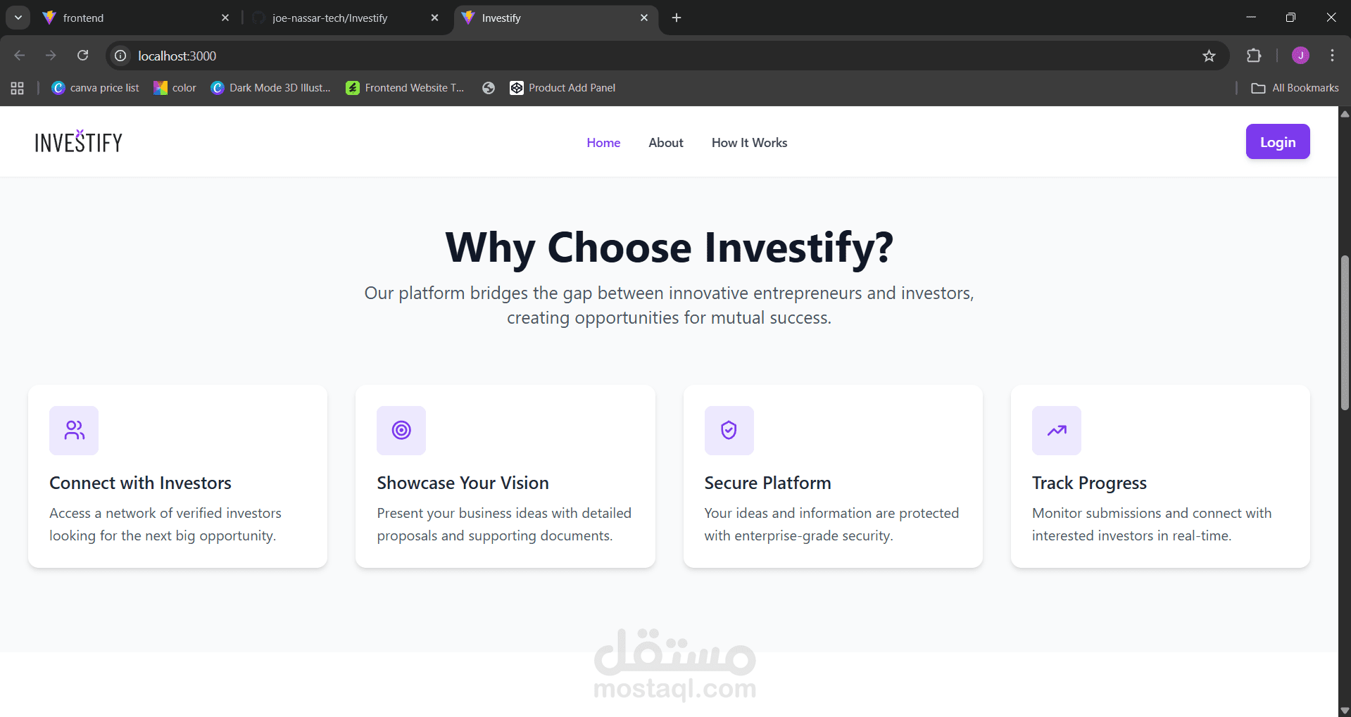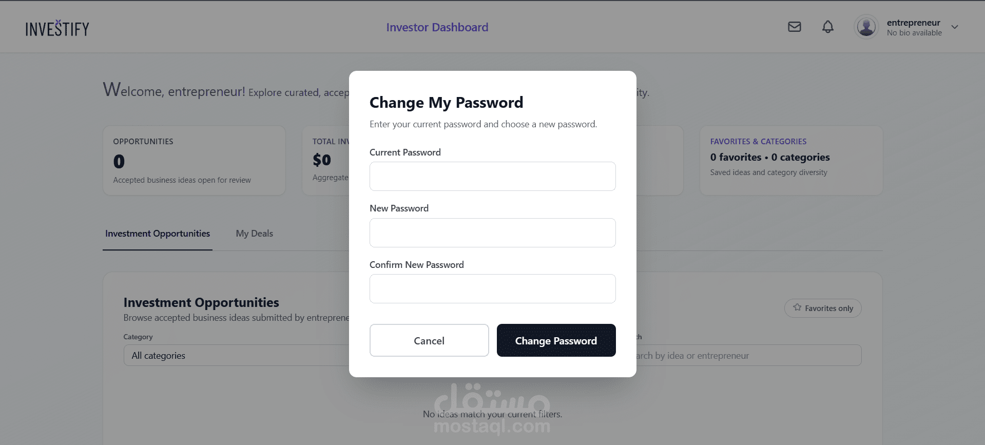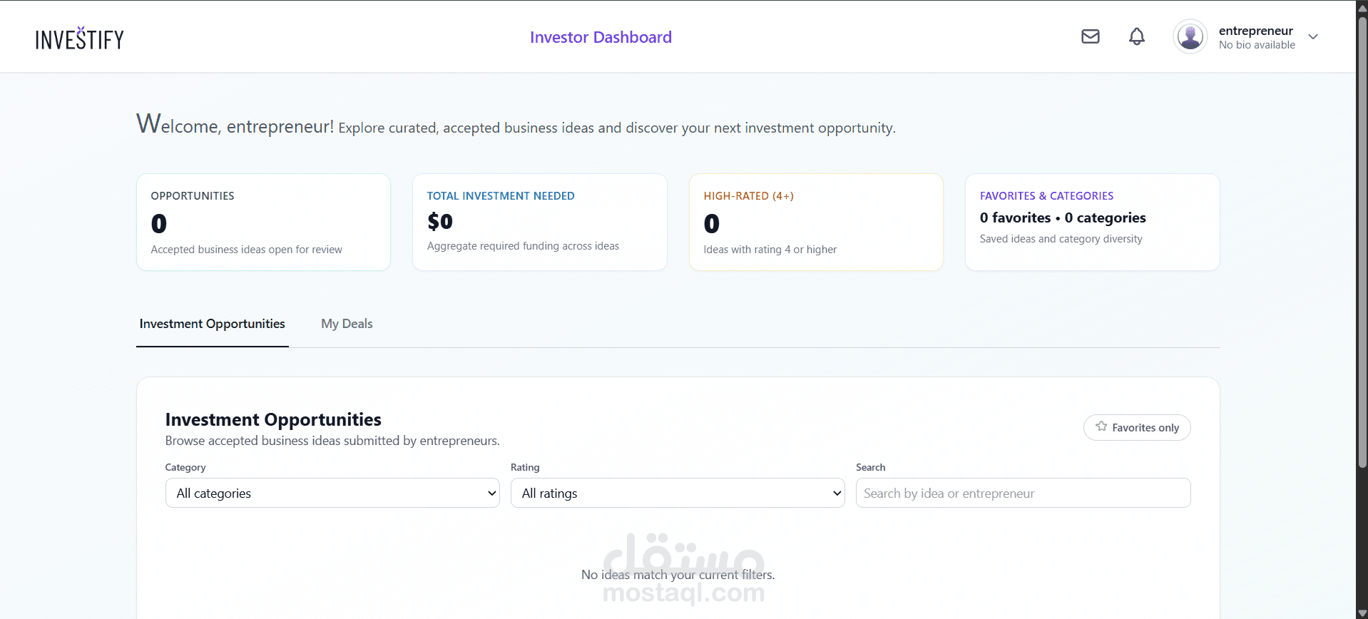 تمنحك المنصّة تجربة احترافية وآمنة لعرض المشاريع، إدارة المفاوضات الاستثمارية بسلاسة، وبناء شراكات ناجحة عبر تواصل مباشر وفوري يسرّع اتخاذ القرار ويحوّل الأفكار إلى استثمارات ملموسة.