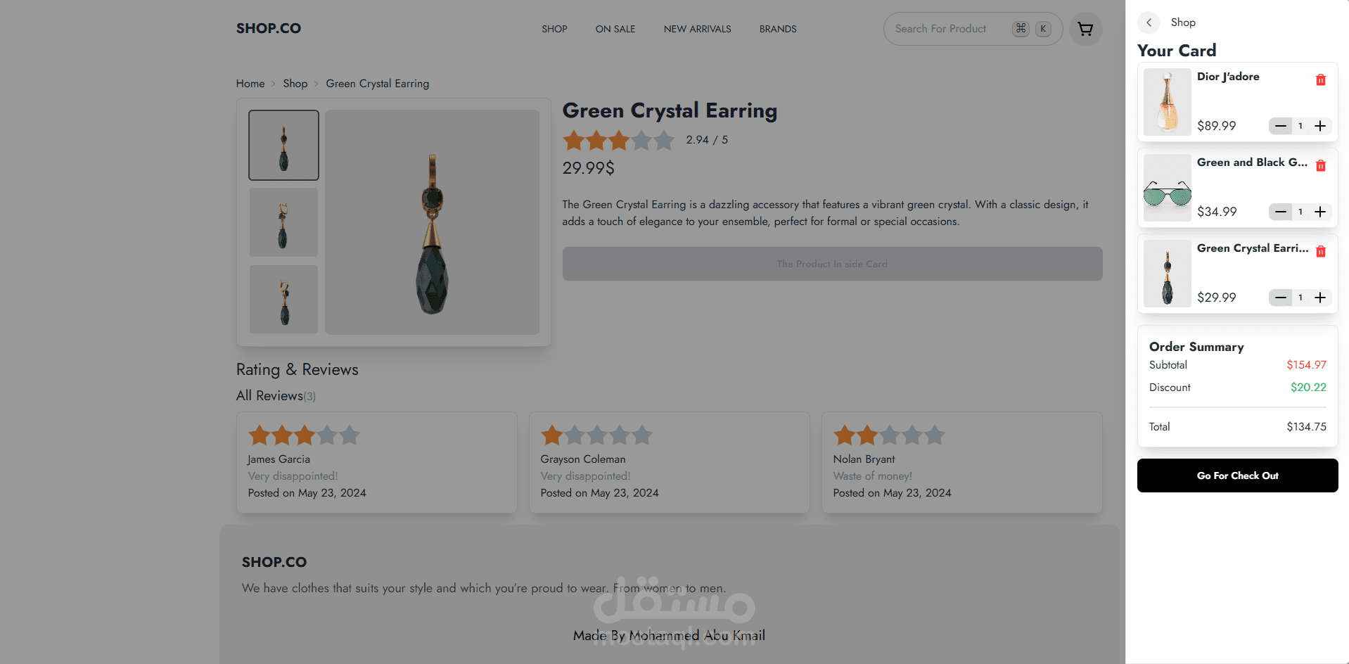 Store Shop.co هو موقع تجارة إلكترونية متجاوب مبني باستخدام React ، ويتميز بعرض المنتجات وعربة تسوق كاملة الوظائف. يمكن للمستخدمين تصفح المنتجات، إضافة أو إزالة عناصر من العربة، وعرض السعر الإجمالي بسهولة عبر واجهة نظيفة وسهلة الاستخدام.
