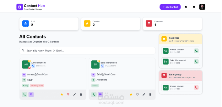 تطبيق ويب متكامل لإدارة وتنظيم جهات الاتصال بواجهة مستخدم عصرية وبسيطة. يتيح التطبيق للمستخدمين تخزين بيانات التواصل وتصنيفها والوصول إليها بسرعة وكفاءة من أي جهاز.