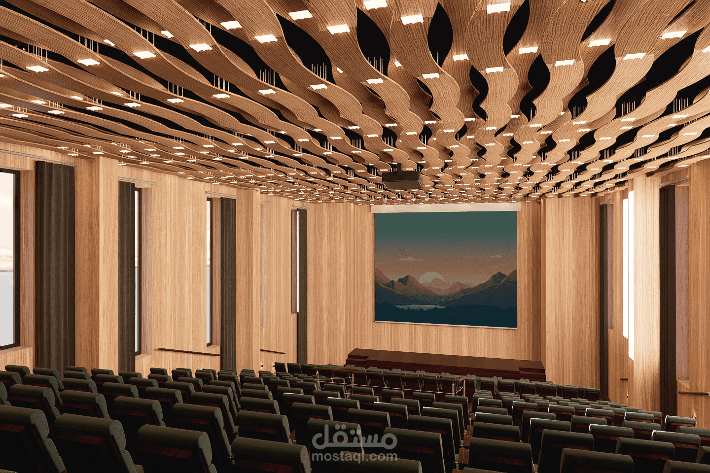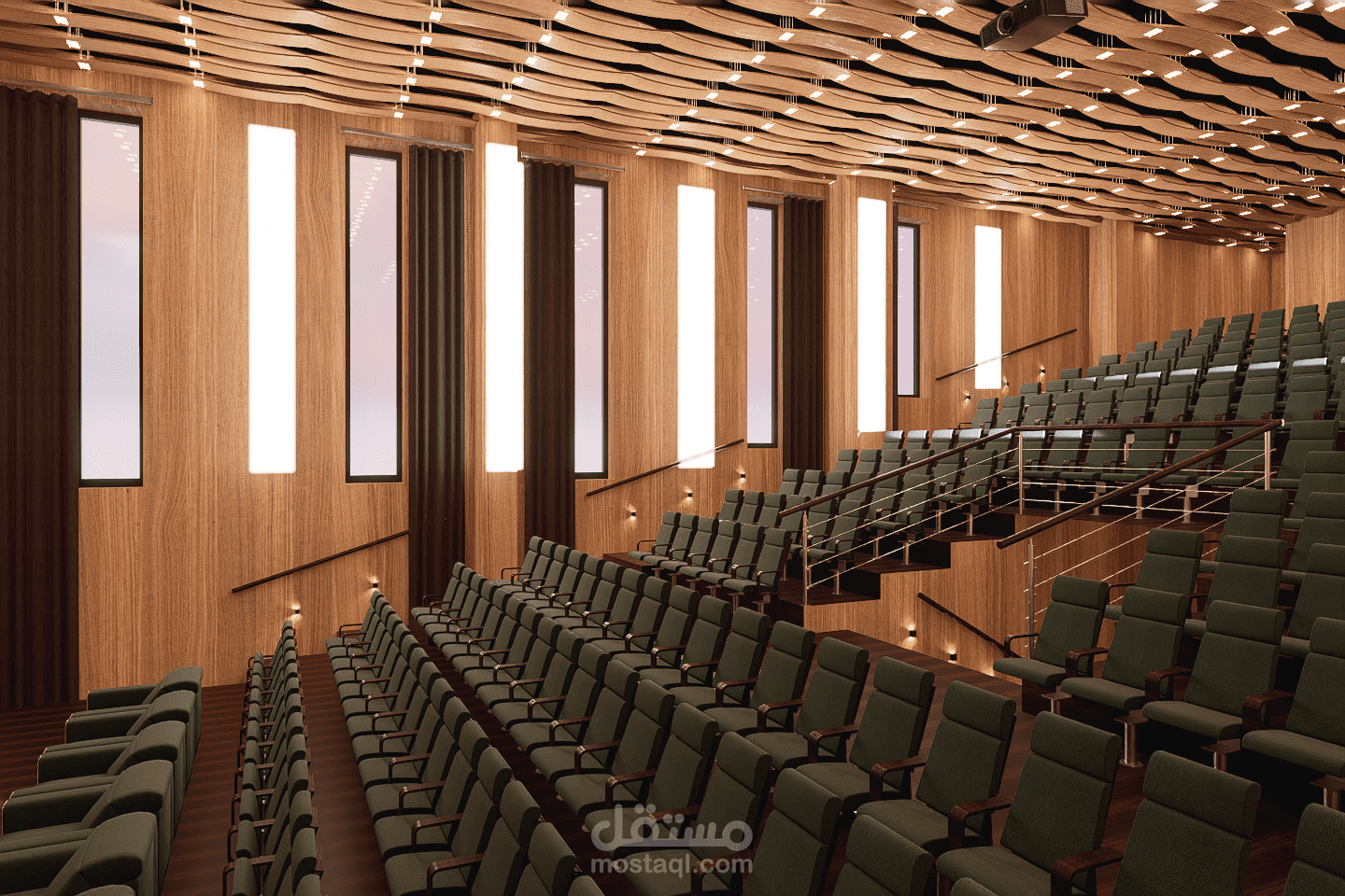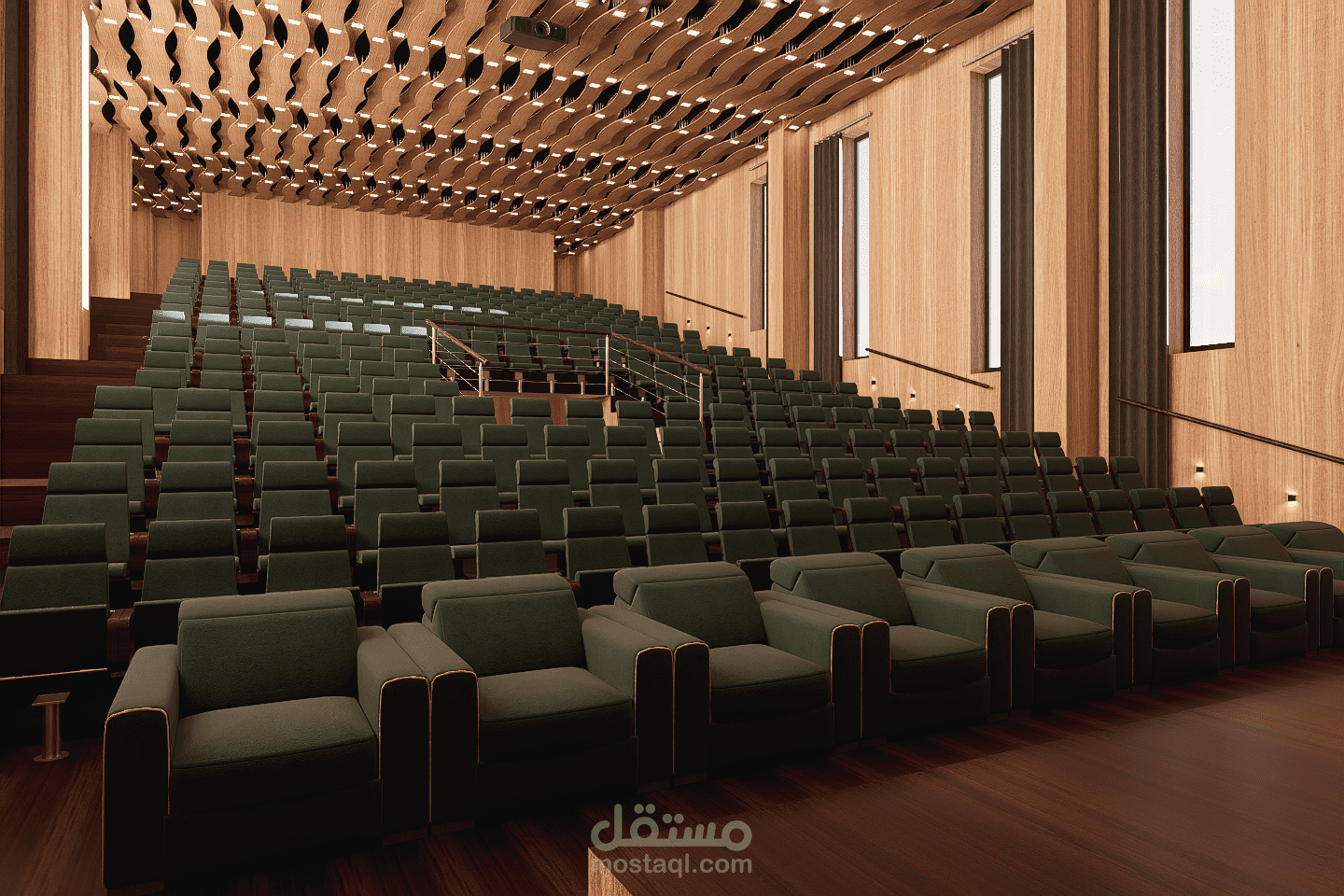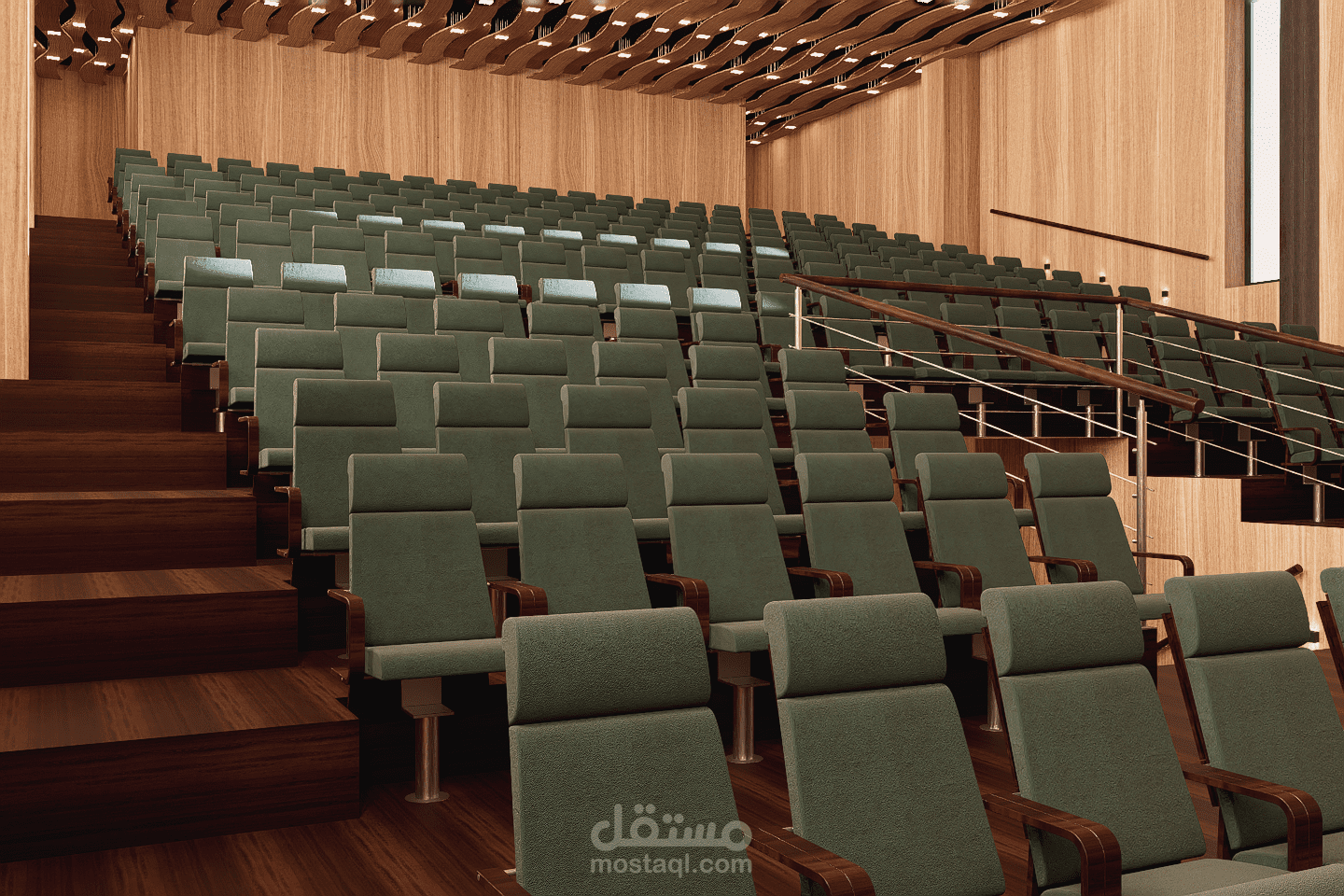This amphitheater is designed to host lectures, conferences, and official ceremonies within the school. The space ensures clear visibility, good acoustics, and comfortable seating for students and staff. Its structured and functional layout reflects the values of discipline and order. Neutral materials, controlled lighting, and a sober design create a formal environment suitable for learning and official gatherings.