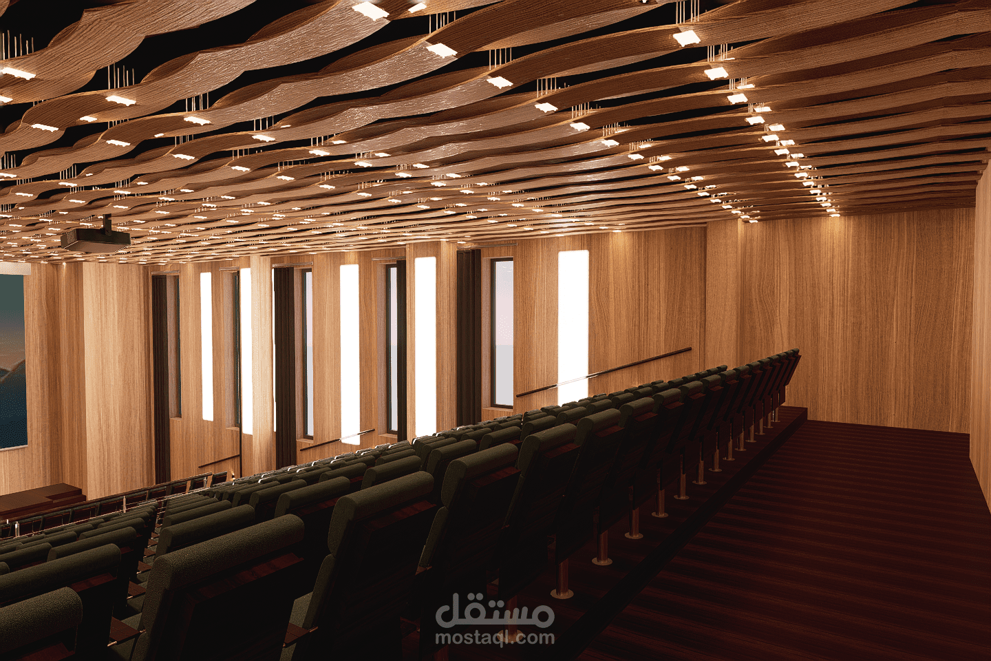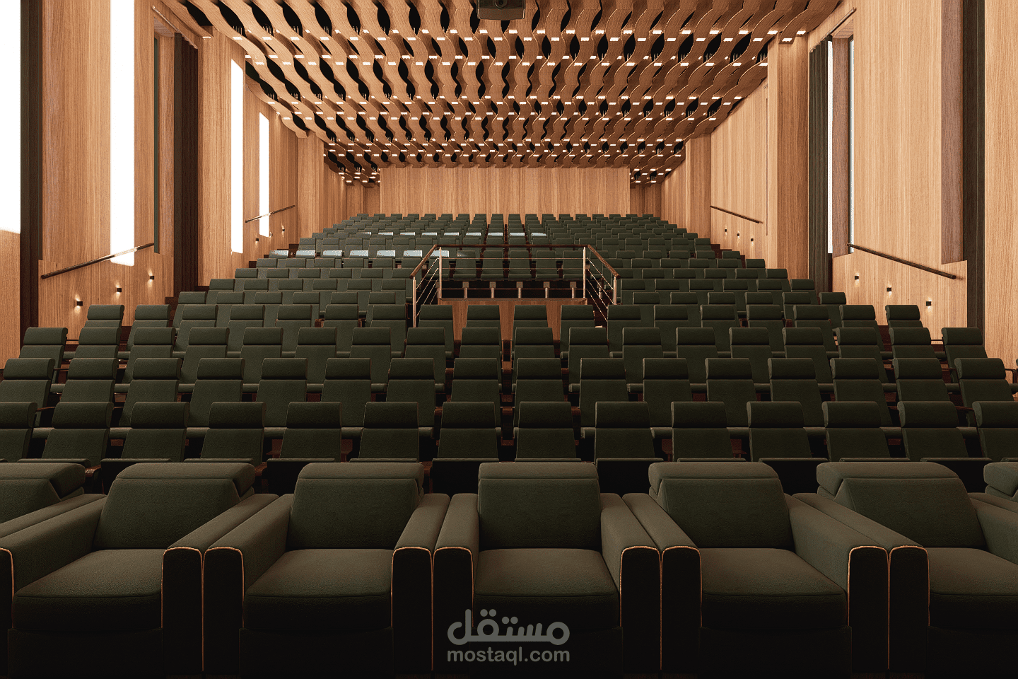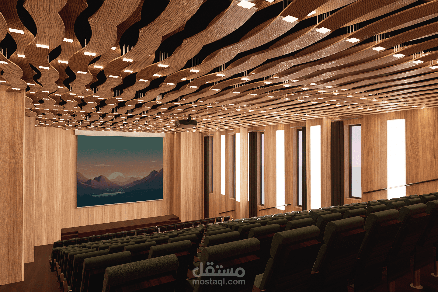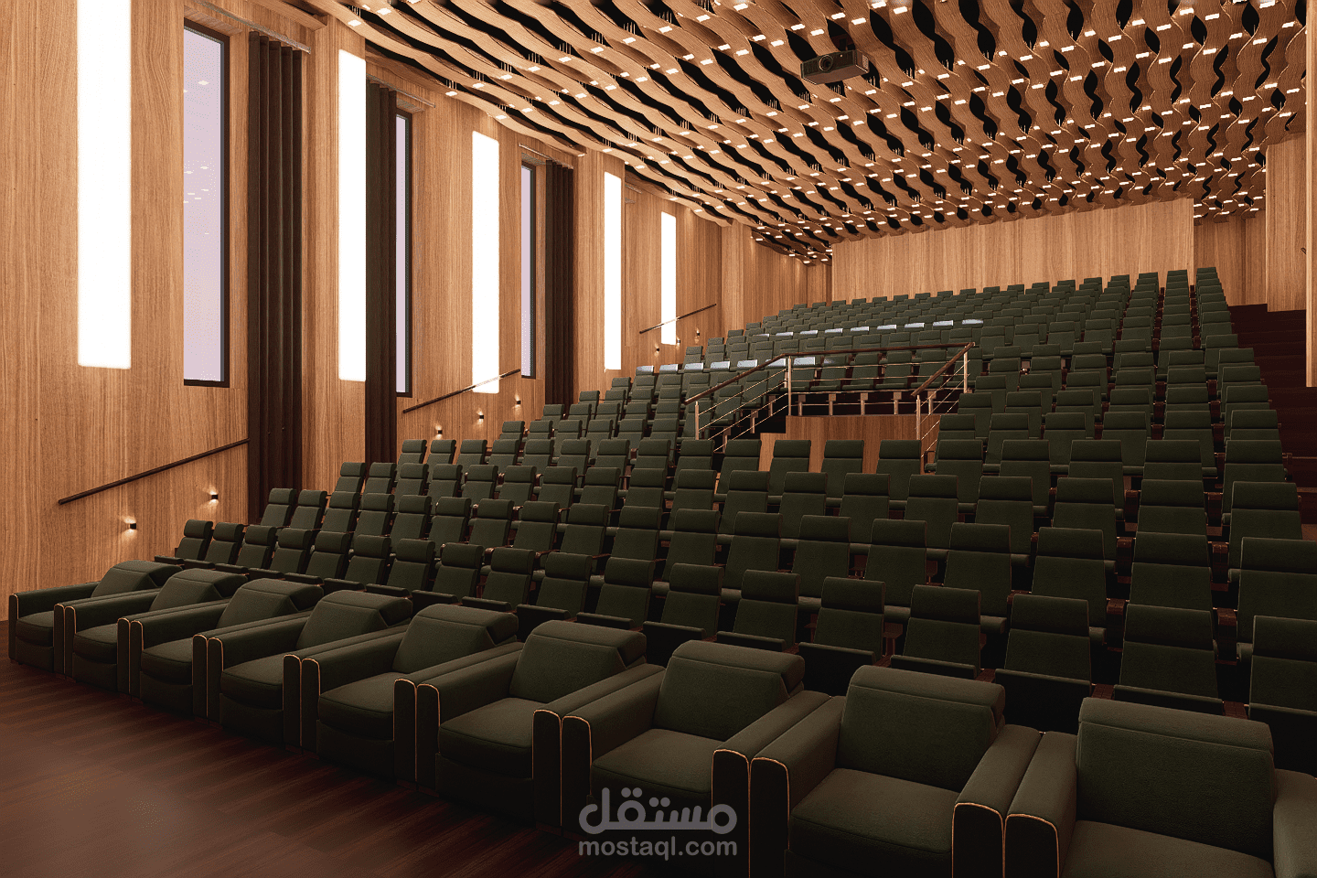 This amphitheater is designed to host lectures, conferences, and official ceremonies within the school. The space ensures clear visibility, good acoustics, and comfortable seating for students and staff. Its structured and functional layout reflects the values of discipline and order. Neutral materials, controlled lighting, and a sober design create a formal environment suitable for learning and official gatherings.