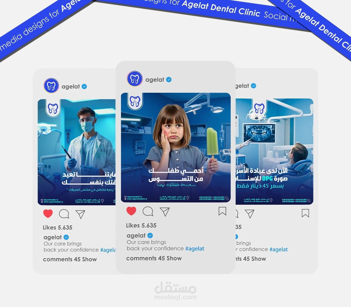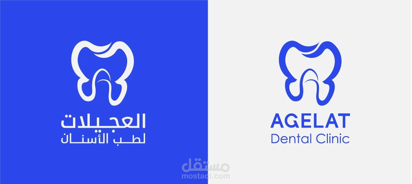 The logo blends the letter "A" with the tooth to represent "Agelat" and highlight the clinic's dental specialty. The letter "A" also symbolizes the city of Ajilat, reflecting the clinic's connection to its community. The blue color signifies confidence and cleanliness, while the clean design emphasizes professionalism and clarity. It embodies the clinic's mission of providing high-quality dental care with a strong local identity.