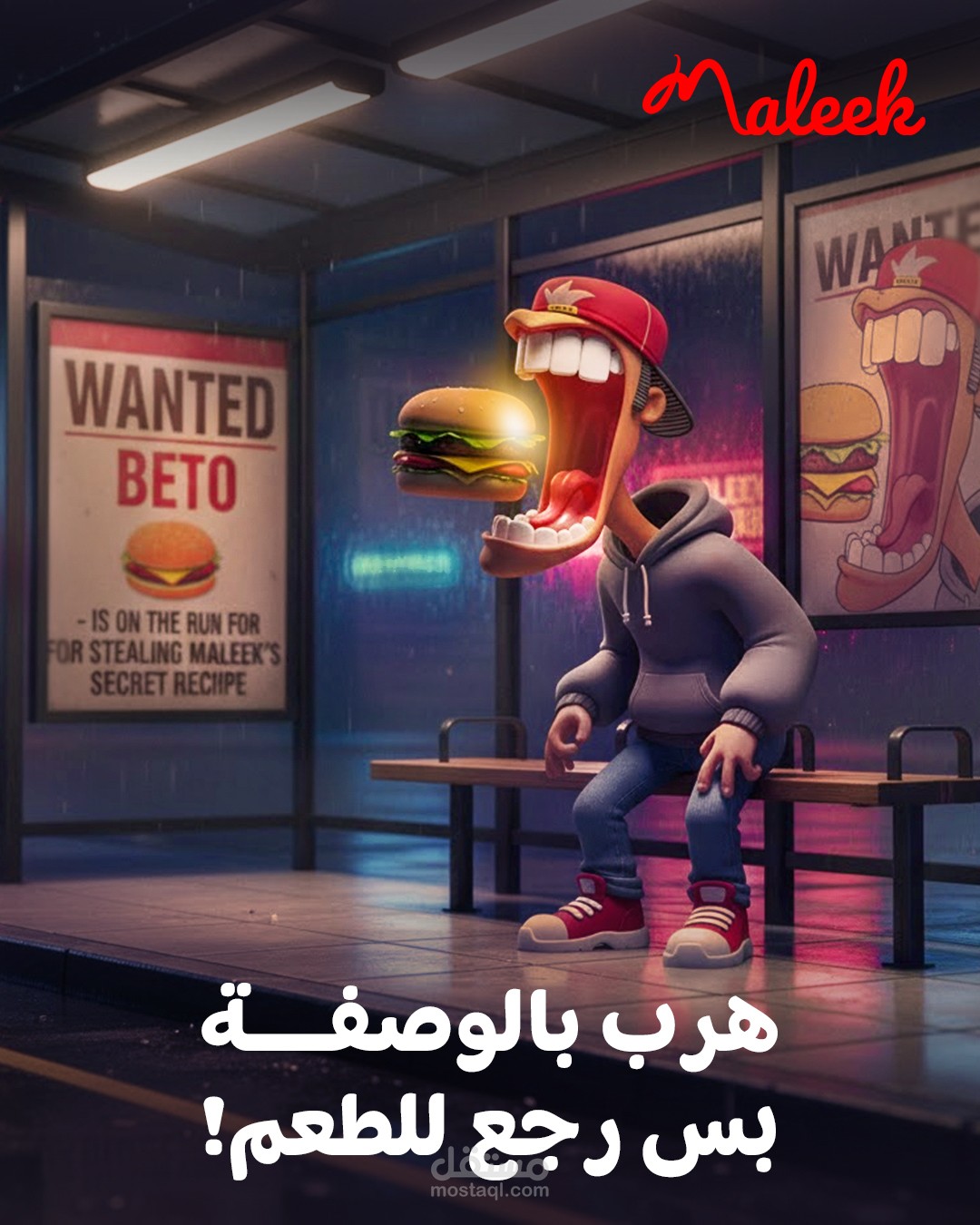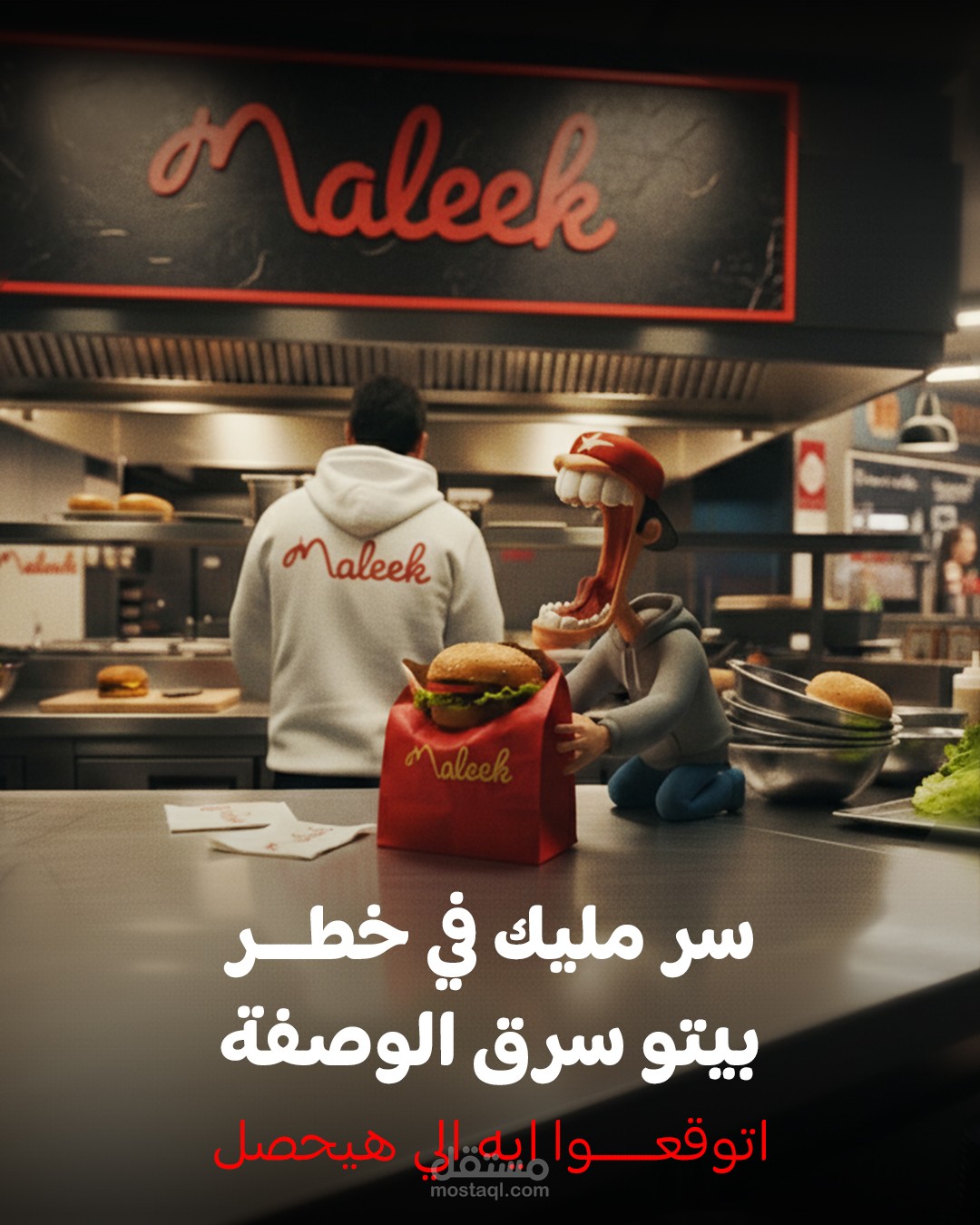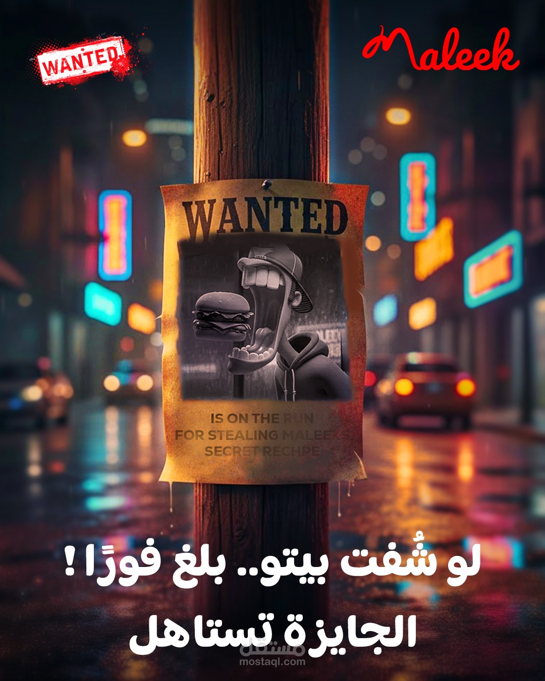 This is a comprehensive creative campaign titled 'Maleek Burger: The Story of the Stolen Secret Recipe.' It is a visual story designed to build anticipation and excitement around Maleek restaurant by introducing the character Beto, who steals the unique recipe. This visual project focuses on crafting an engaging narrative, launching 'Wanted for Justice' ads, creating suspense for the recipe's return, and culminating with a grand reopening announcement to ensure that the recipe and the secret have returned to the right place.