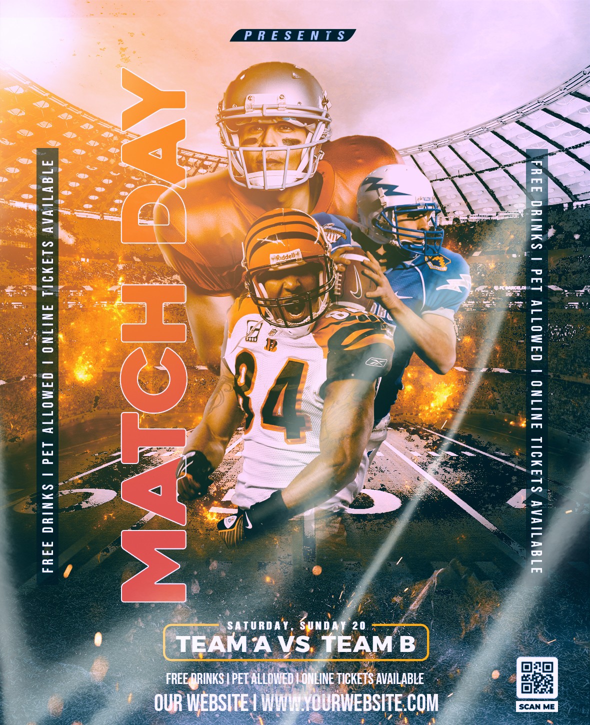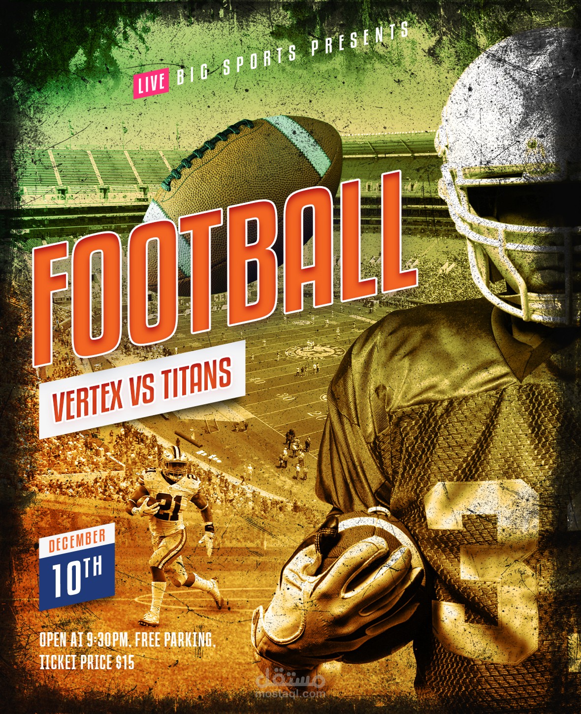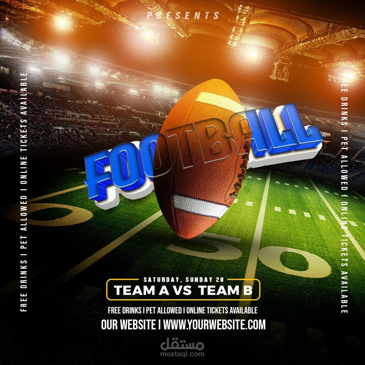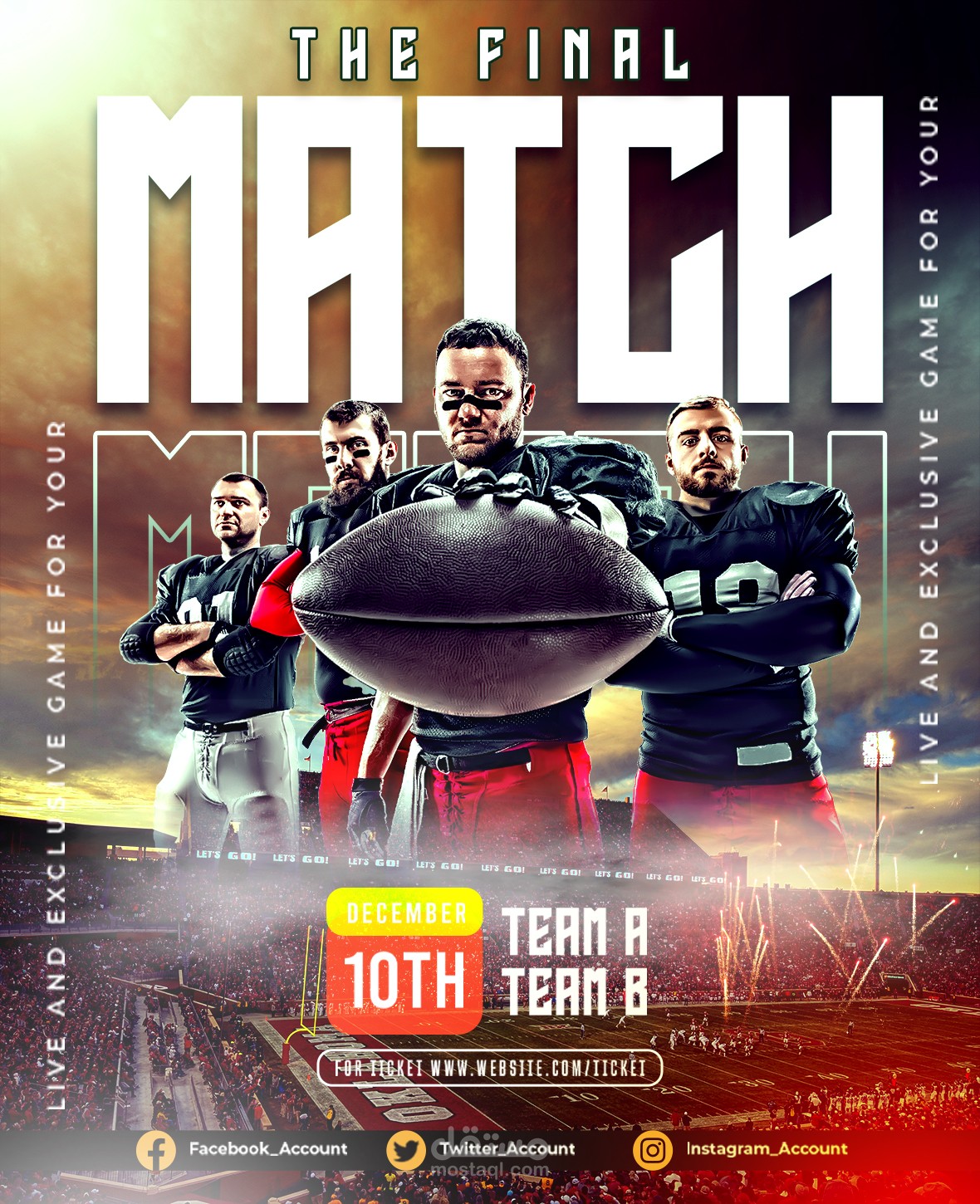 تصميم إعلان لمباراة كرة قدم بأسلوب عصري وجذاب مخصص للنشر على وسائل التواصل الاجتماعي. تم التركيز على إبراز أجواء الحماس والمنافسة الرياضية من خلال اختيار ألوان متناسقة، خط واضح، وتوزيع عناصر بصري متوازن يلفت الانتباه ويُسهّل قراءة المعلومات الأساسية للمباراة مثل الفريقين وموعد اللقاء.