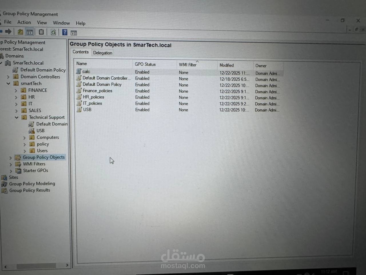 "قمت بتصميم وإدارة سياسات المجموعة (GPOs) بشكل مركزي لتشمل قيوداً أمنية محددة (مثل منع تطبيقات معينة أو تعطيل الـ USB)، مع التحقق من نجاح تطبيق هذه القيود فعلياً على أجهزة المستخدمين لضمان بيئة عمل آمنة ومنضبطة."