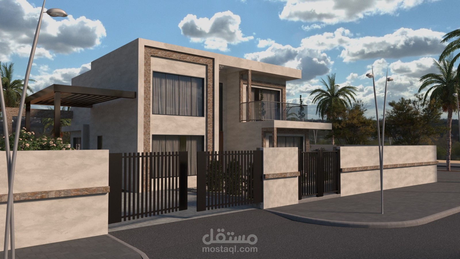 تم استخدام الحجر في الاكساء الخارجي كعنصر مميز بالاضافة الى استخدام مظلات حديدية (Pergola)