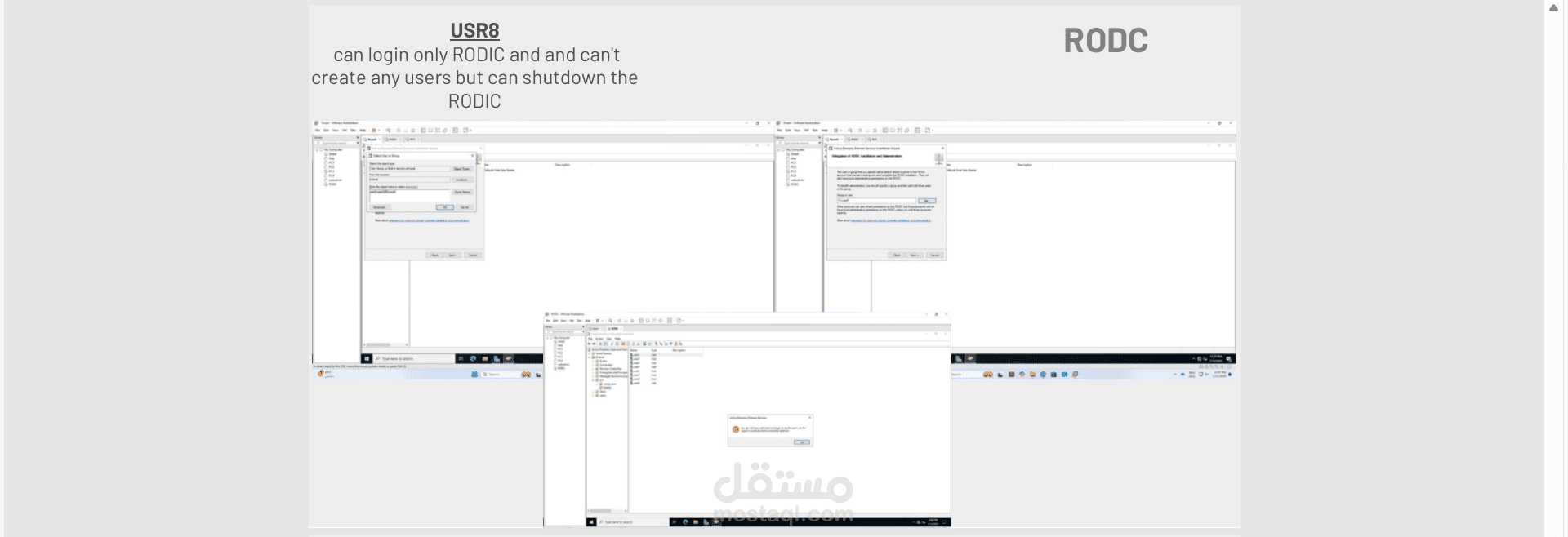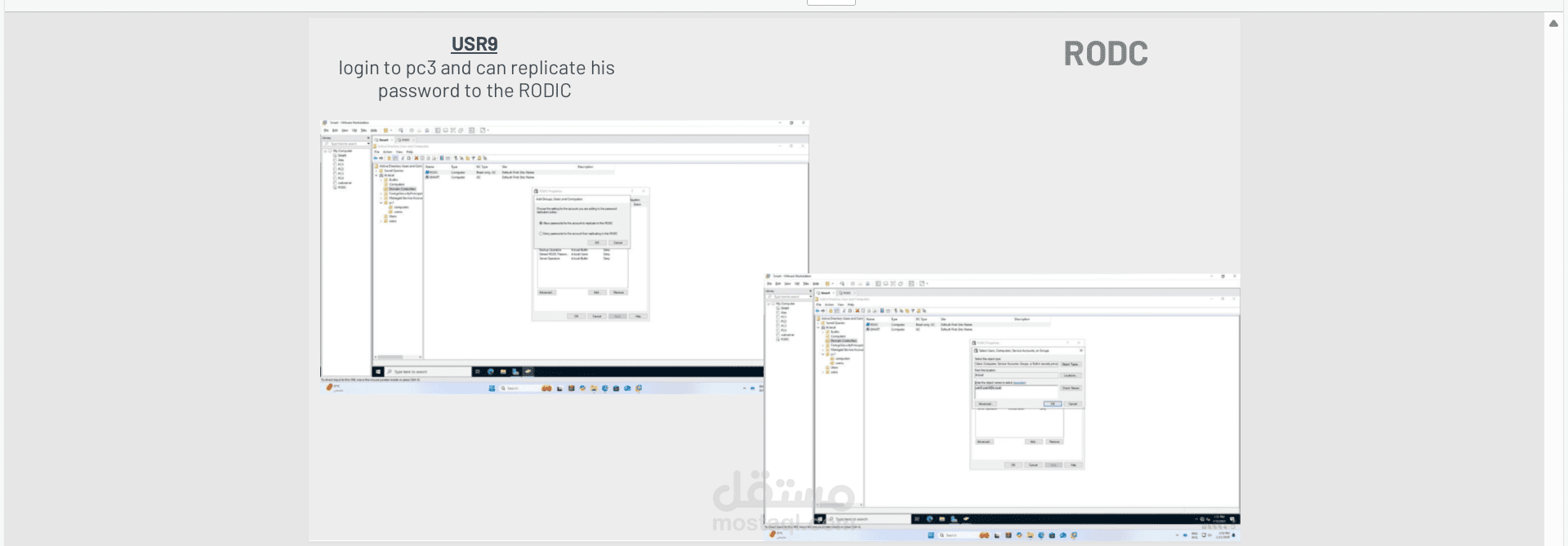 تم تنفيذ إعداد Read-Only Domain Controller (RODC) داخل بيئة الشبكة بهدف تعزيز الأمان في المواقع البعيدة وتقليل المخاطر الأمنية.