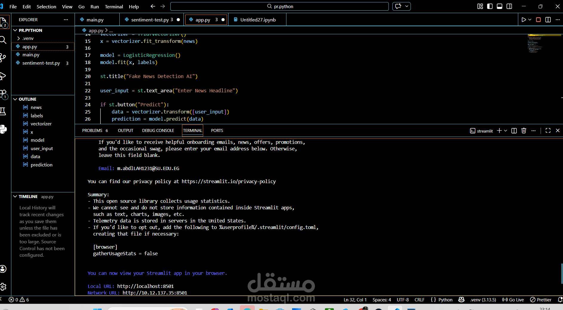 machine learning web application that detects whether a news headline is real or fake using NLP techniques and Logistic regression
