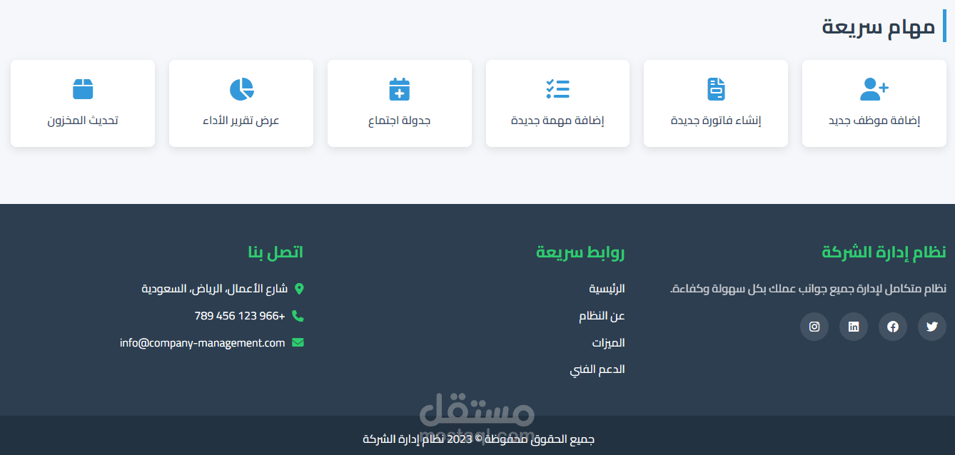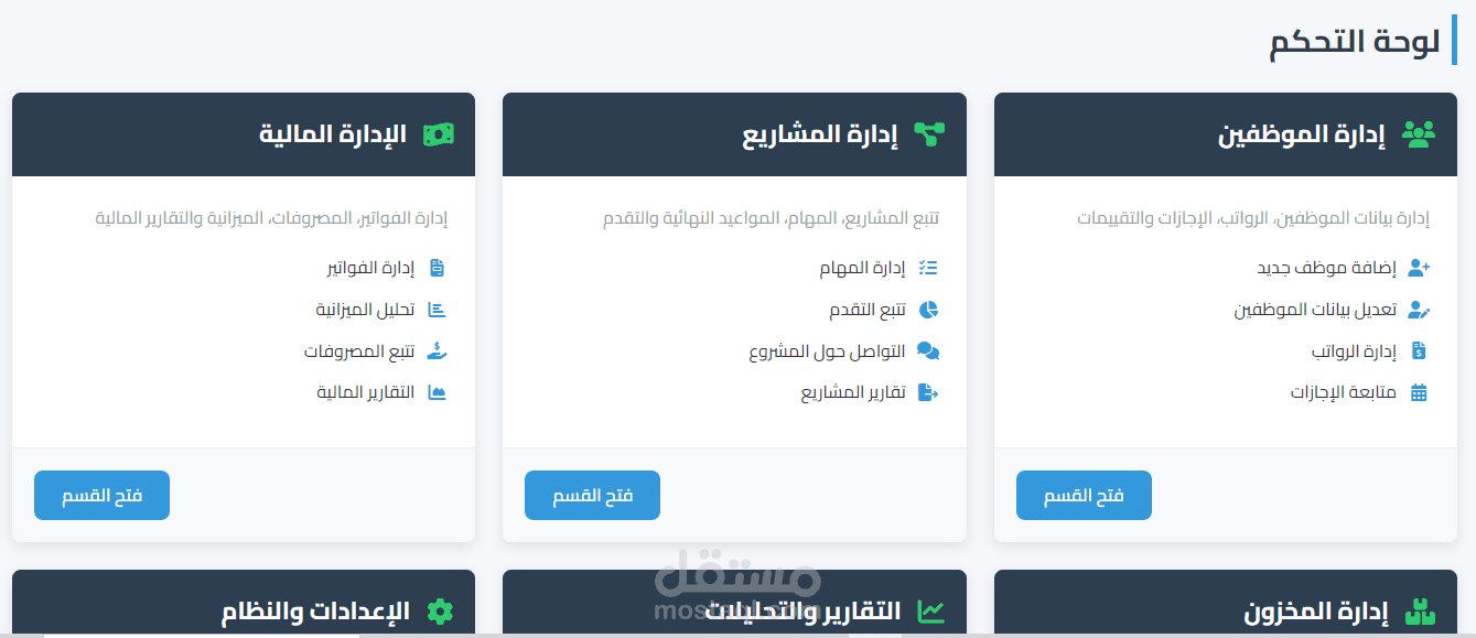 هو نظام ويب متكامل لإدارة ، يوفّر منصة واحدة للتحكم في الموظفين، المشاريع، المالية، المخزون، والتقارير. يتميز بواجهة عربية سهلة، عمل على جميع الأجهزة، وأمان عالي. يعتمد على HTML5 وCSS3 وJavaScript، مع دعم مستقبلي لـ PHP/MySQL للواجهة الخلفية.