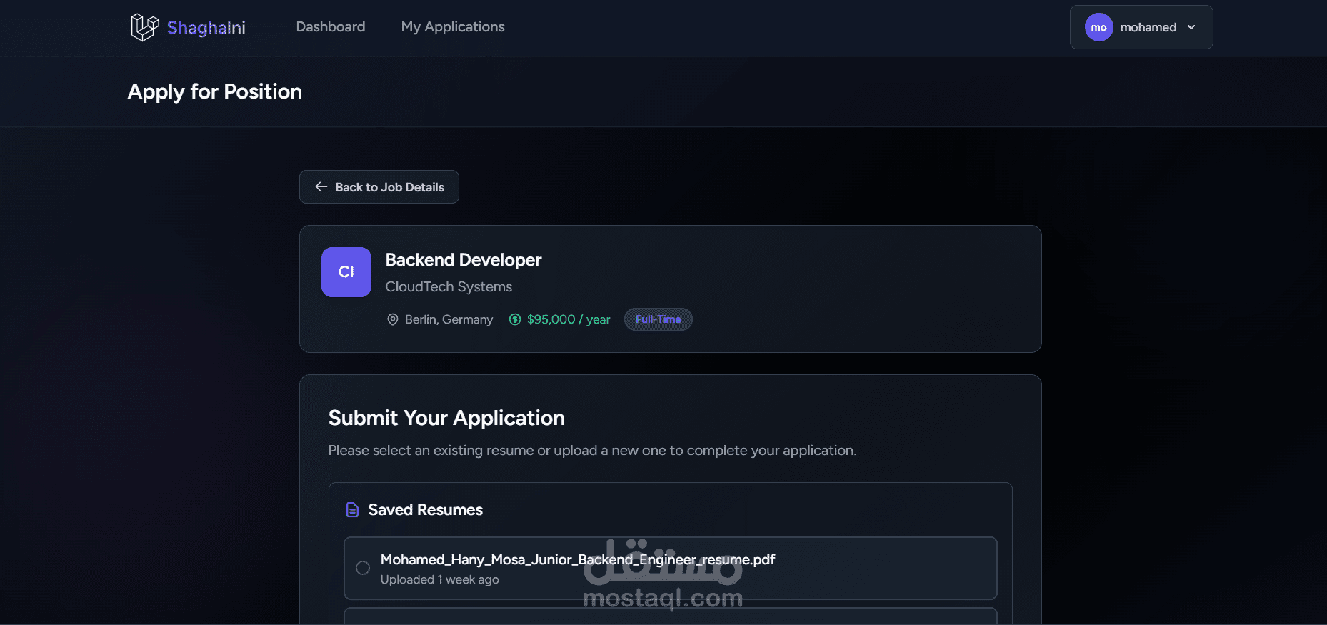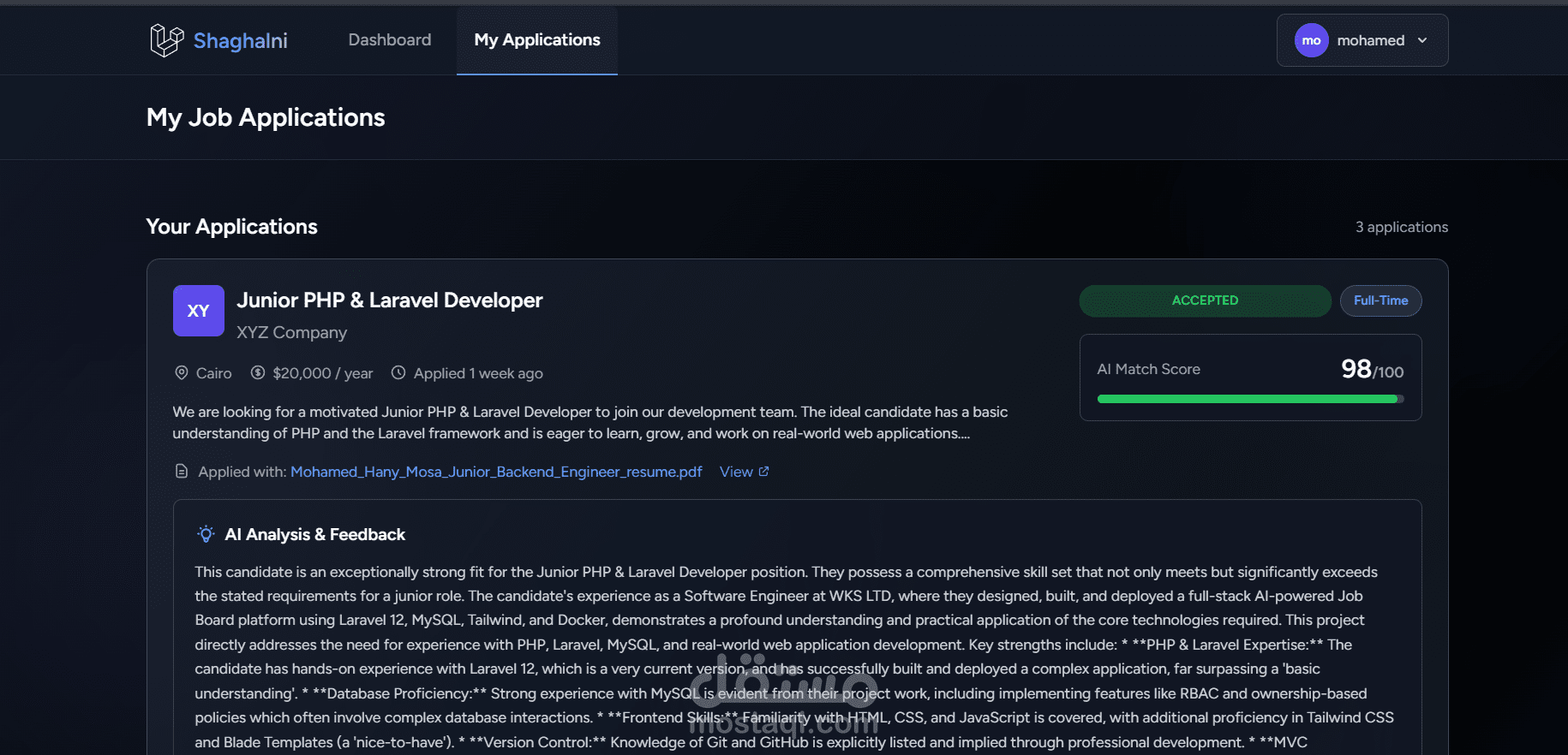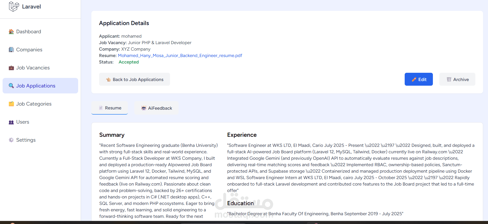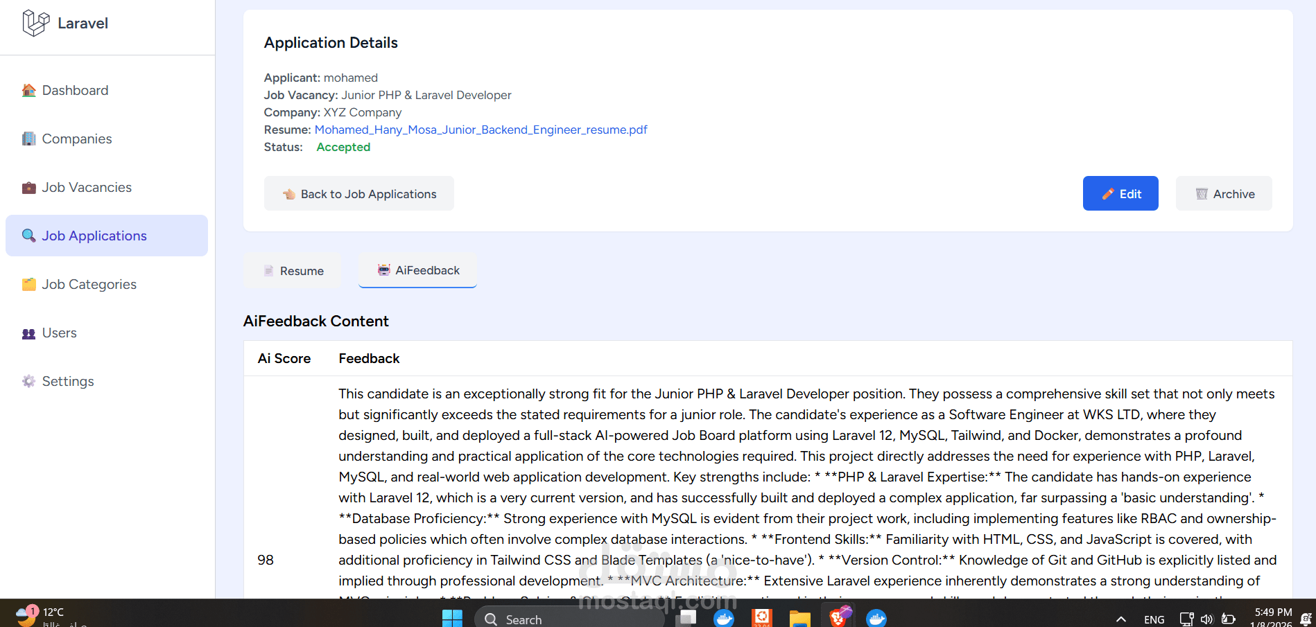 Built using Laravel with clean architecture principles. The system uses MySQL for data persistence, Supabase for cloud storage, and Docker for deployment. The AI layer processes uploaded resumes and returns scores (0–100) with feedback.