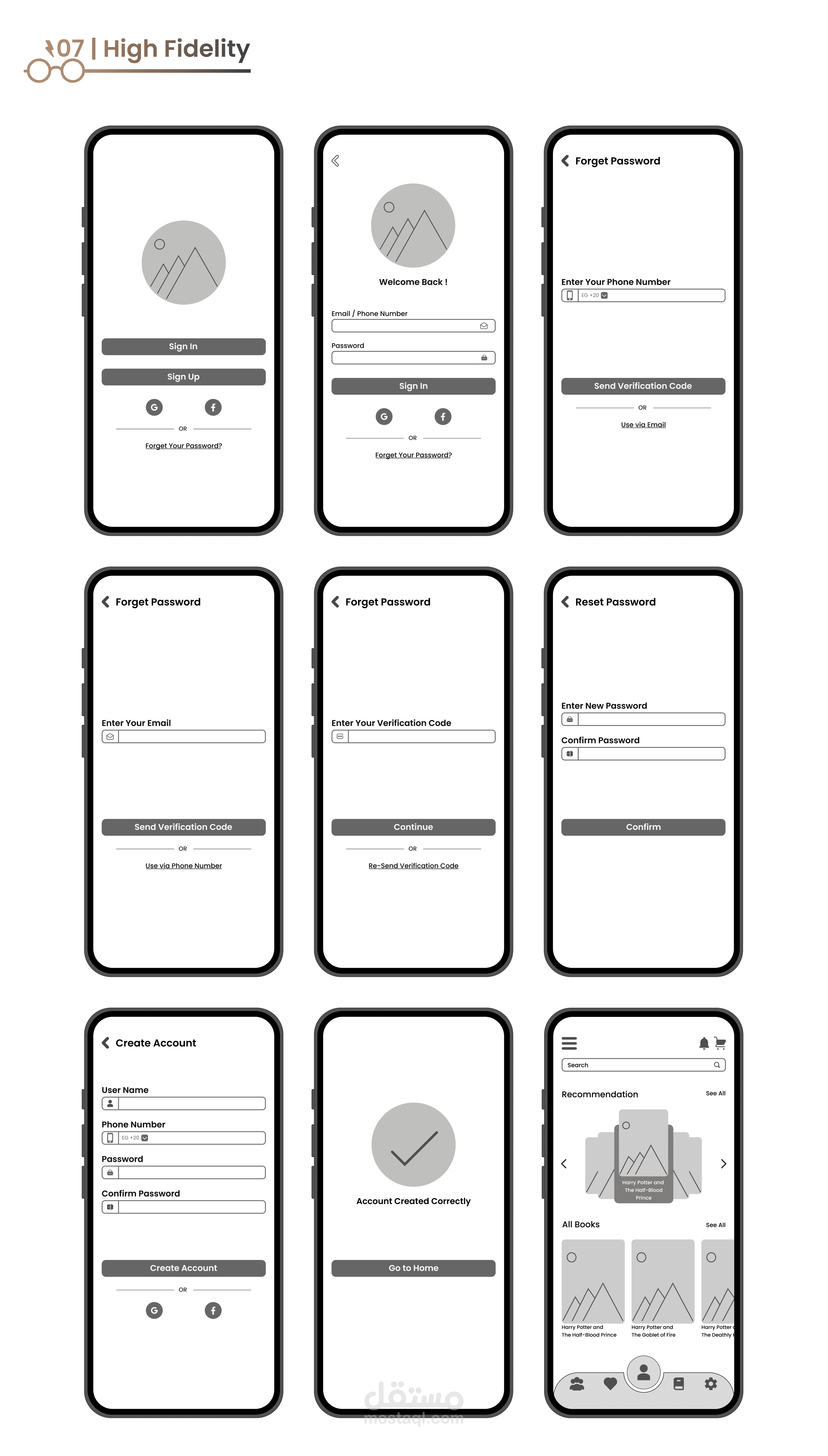 في هذا المشروع قمت بتصميم تجربة مستخدم وواجهة استخدام متكاملة لتطبيق موبايل خاص بالمكتبات وبيع الكتب الرقمية (PDF) والمطبوعة، مع التركيز على سهولة الاستخدام، الجاذبية البصرية، وتحقيق أهداف المستخدم التجارية.