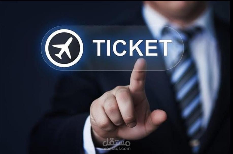 الصورة بتوضح رجل لابس بدلة رسمية، ممدِّد يده وكأنه يضغط على زر افتراضي مكتوب عليه TICKET وبجواره أيقونة طائرة ✈️.