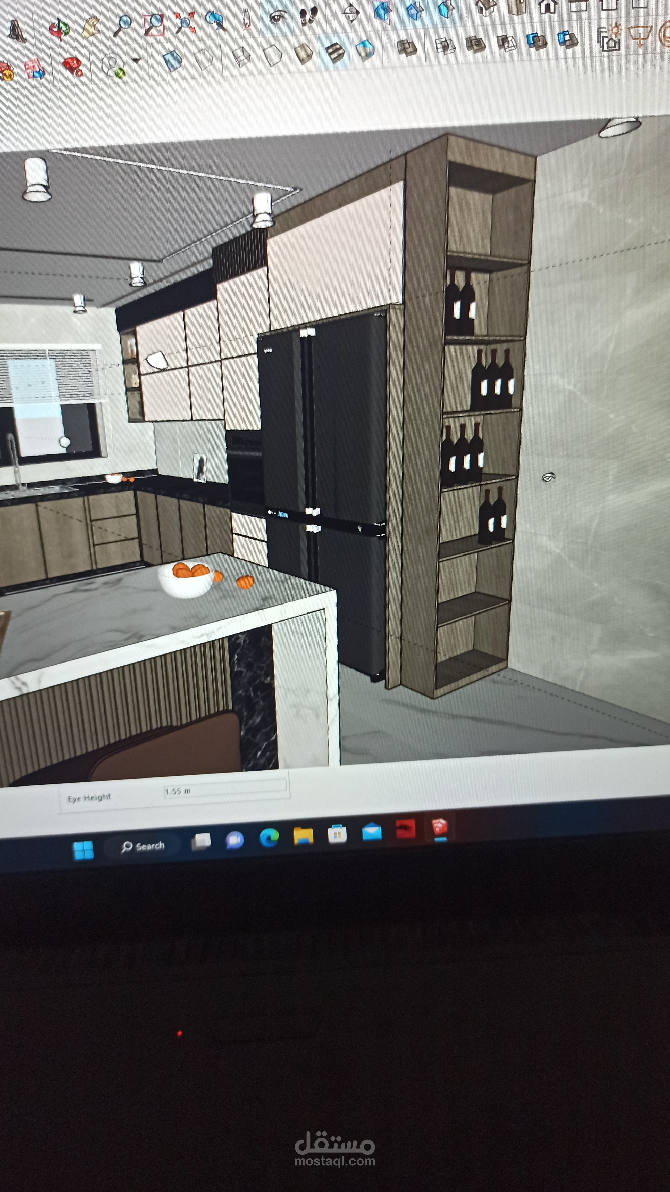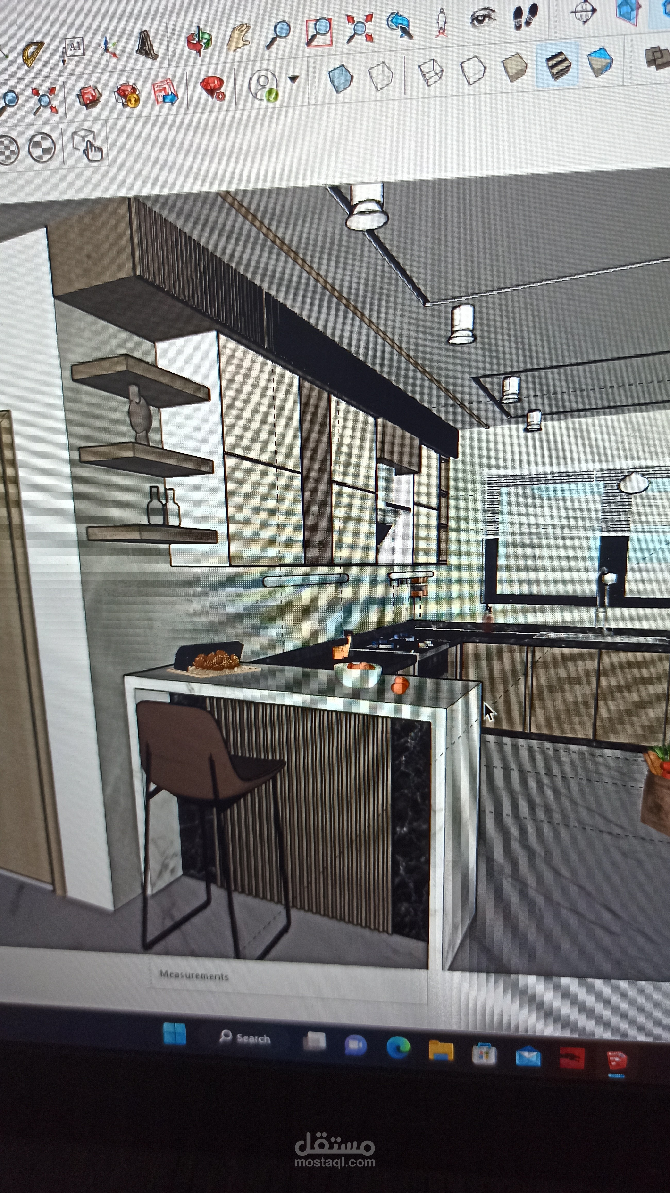 عبارة عن تصميم داخلي لمطبخ على الطراز المودرن ، تم رسمه باستخدام الاتوكاد ثم تم رفع العمل (مودلنق) باستخدام السكتش اب و بعد ذلك إخراجه لاحقا...