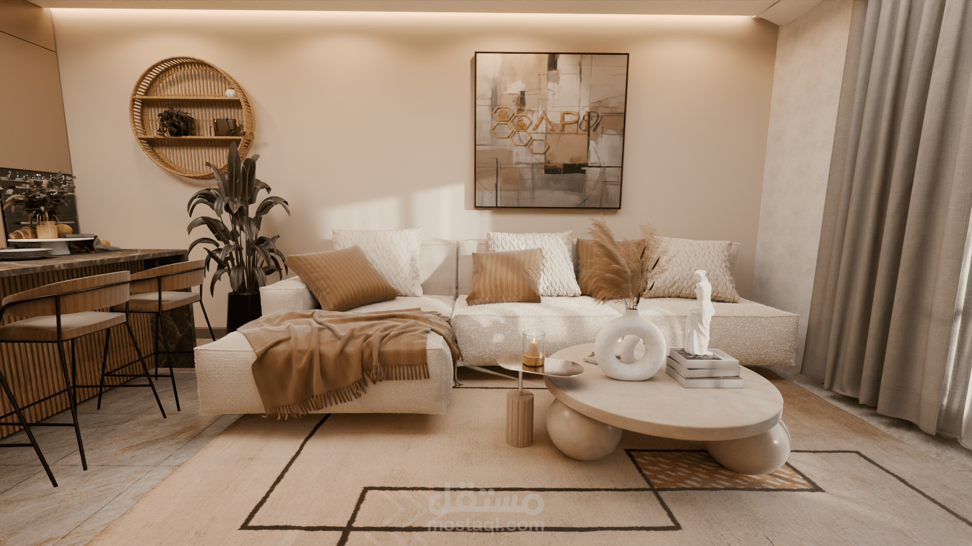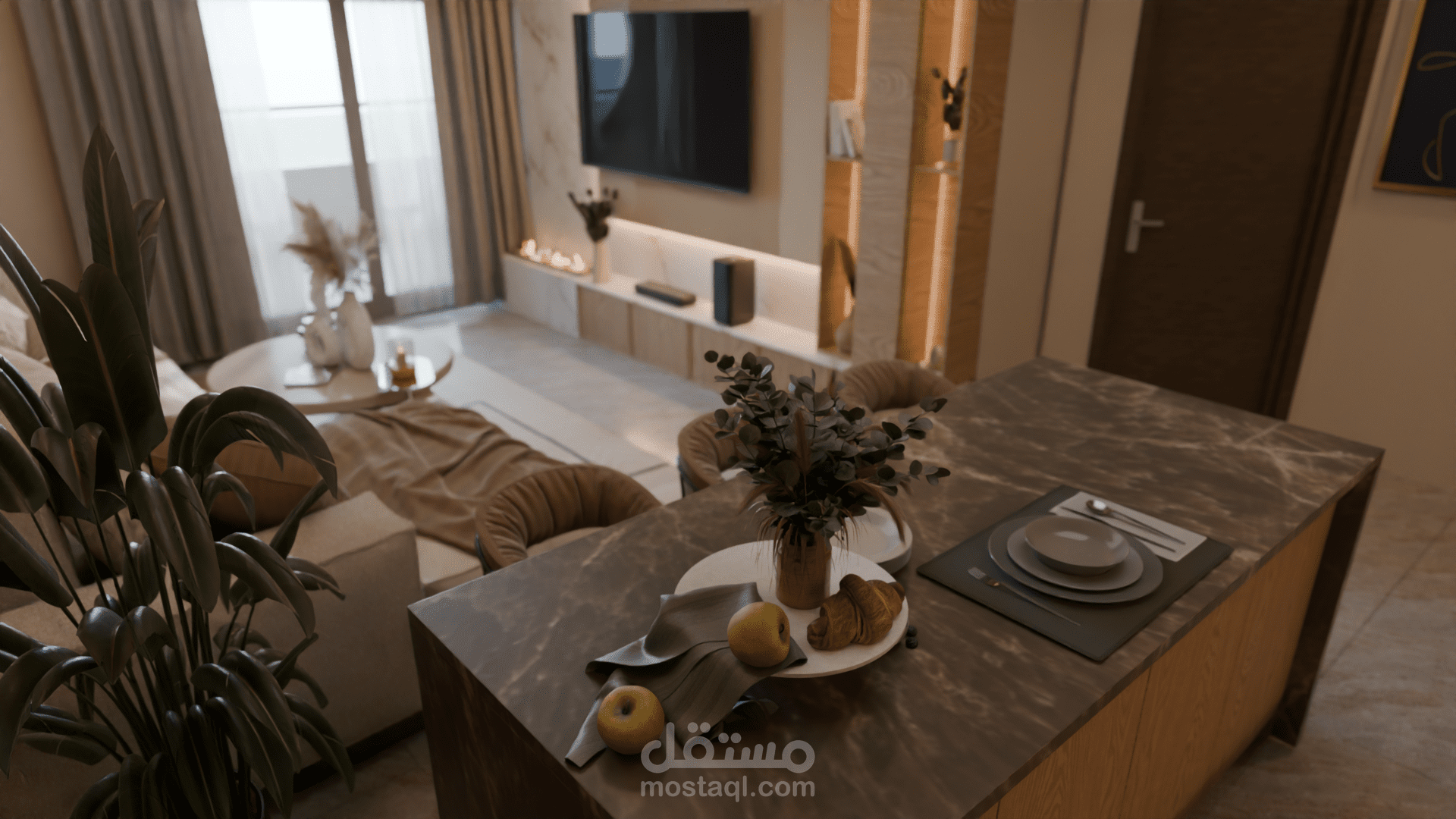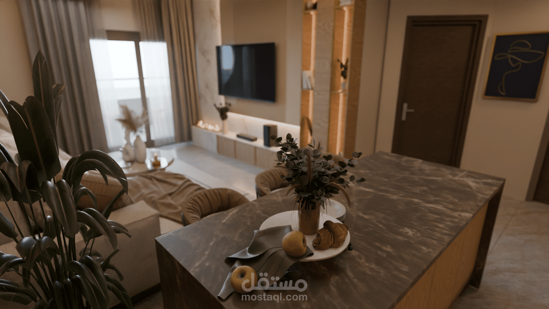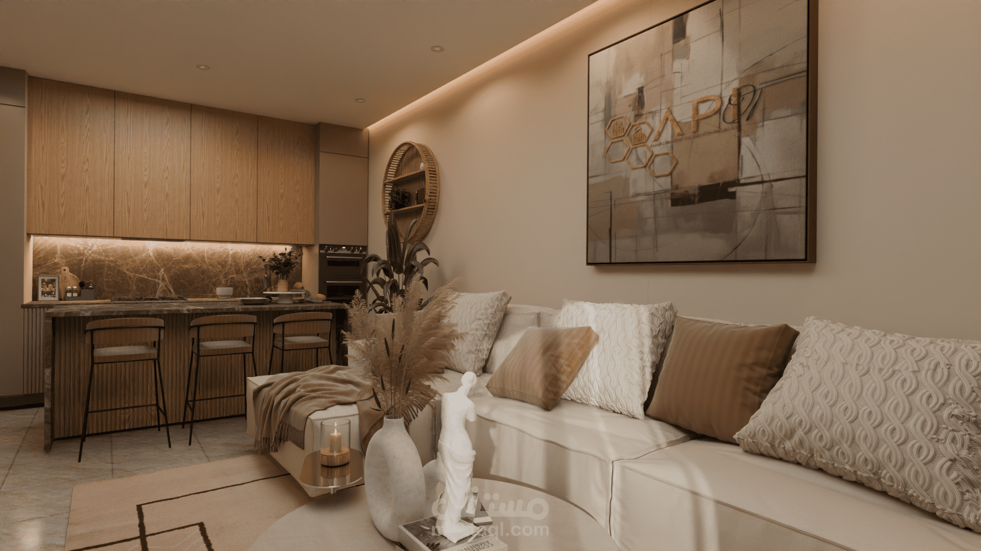 التصميم يضم صالونًا مع مطبخ مفتوح في فضاء واحد متناسق. الصالون يتميز بألوان دافئة ومحايدة مع أثاث بسيط وخطوط ناعمة، جدار تلفاز بإضاءة مخفية ونباتات داخلية تضيف لمسة طبيعية وهادئة. المطبخ مفتوح على الصالون ويتضمن جزيرة مركزية بسطح رخامي داكن وخزائن خشبية عصرية بدون تفاصيل كثيرة، ما يعزز الإحساس بالترتيب والفخامة. الستايل العام هو Modern Contemporary مع لمسة Japandi، يعتمد على البساطة، المواد الطبيعية، الإضاءة الهادئة، وخلق جو مريح وأنيق في نفس الوقت