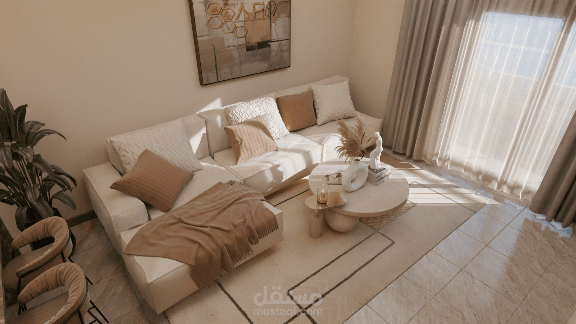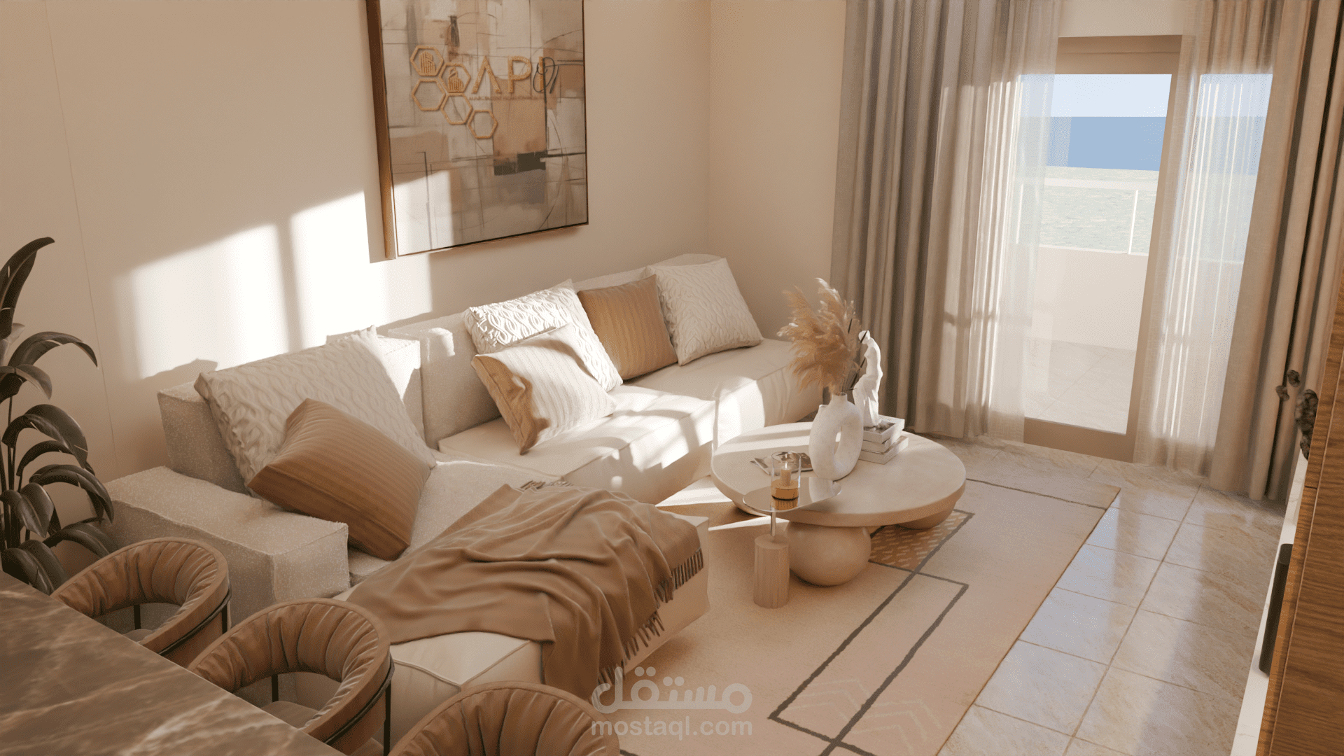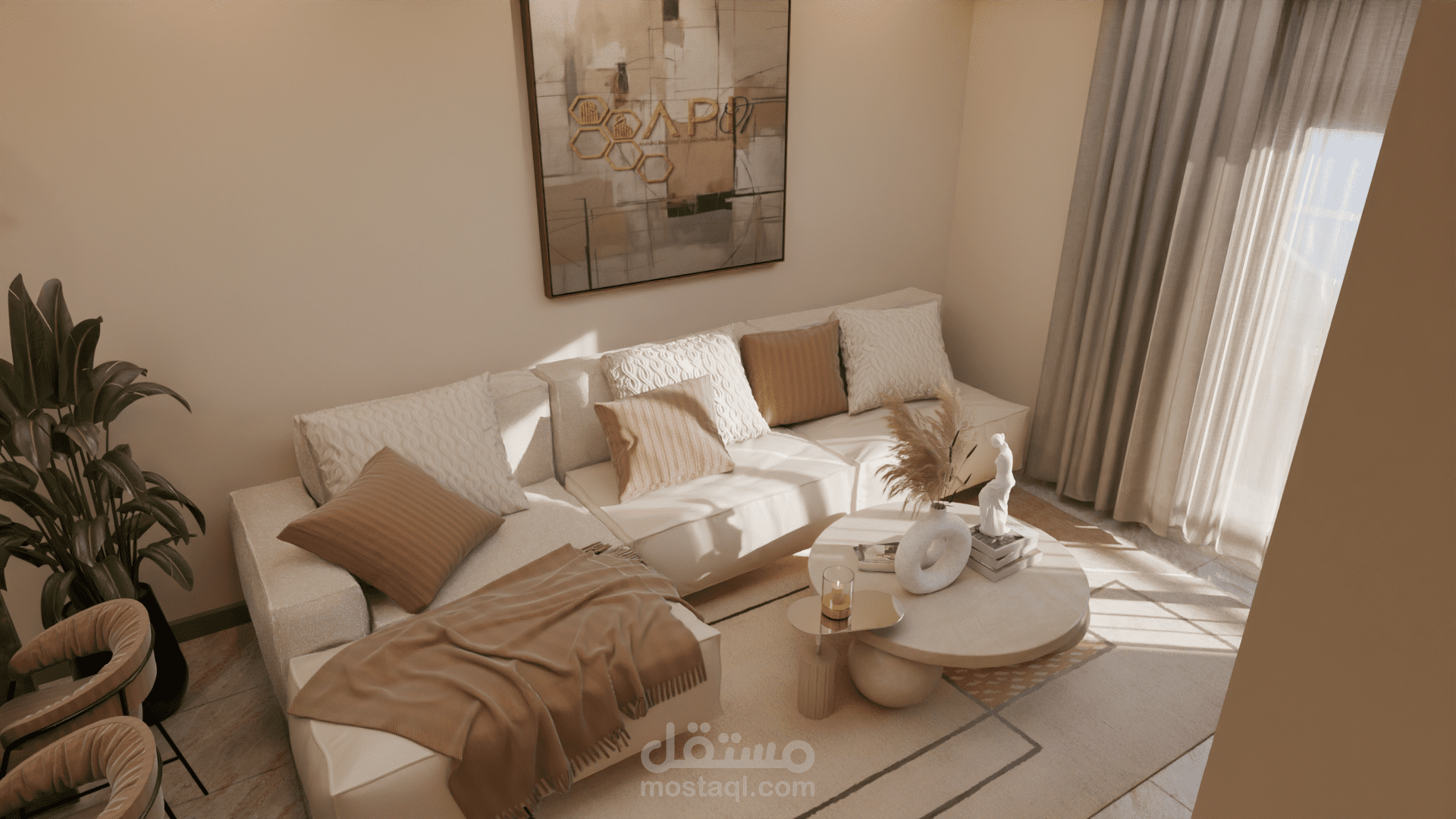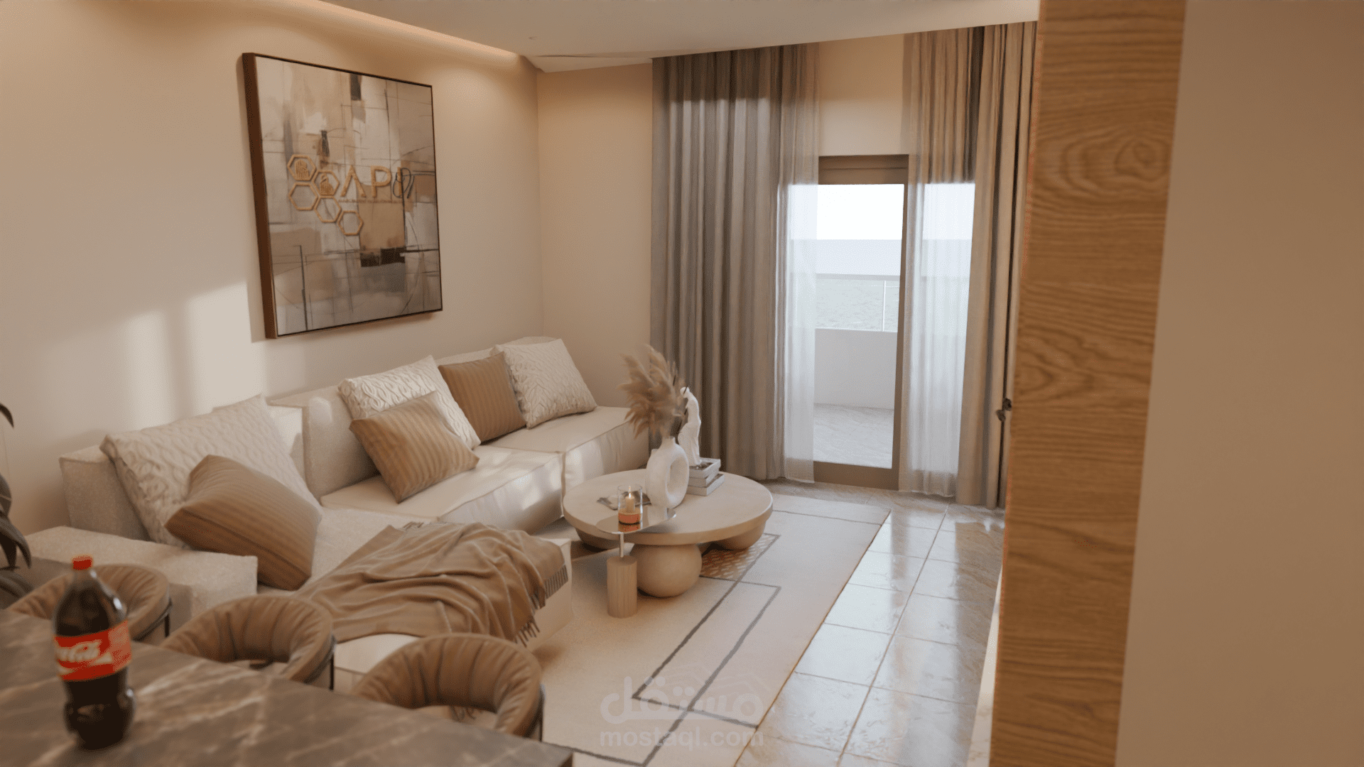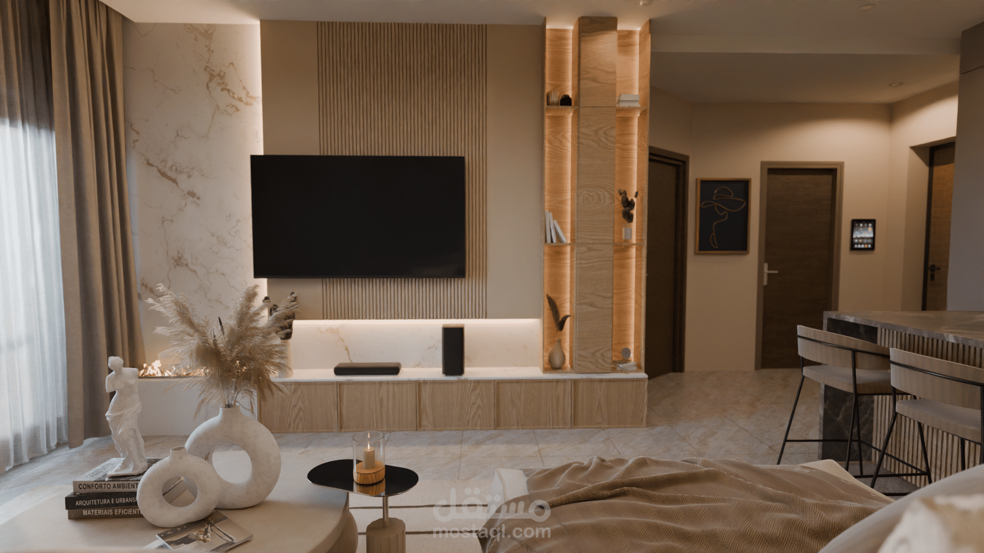 التصميم يضم صالونًا مع مطبخ مفتوح في فضاء واحد متناسق. الصالون يتميز بألوان دافئة ومحايدة مع أثاث بسيط وخطوط ناعمة، جدار تلفاز بإضاءة مخفية ونباتات داخلية تضيف لمسة طبيعية وهادئة. المطبخ مفتوح على الصالون ويتضمن جزيرة مركزية بسطح رخامي داكن وخزائن خشبية عصرية بدون تفاصيل كثيرة، ما يعزز الإحساس بالترتيب والفخامة. الستايل العام هو Modern Contemporary مع لمسة Japandi، يعتمد على البساطة، المواد الطبيعية، الإضاءة الهادئة، وخلق جو مريح وأنيق في نفس الوقت