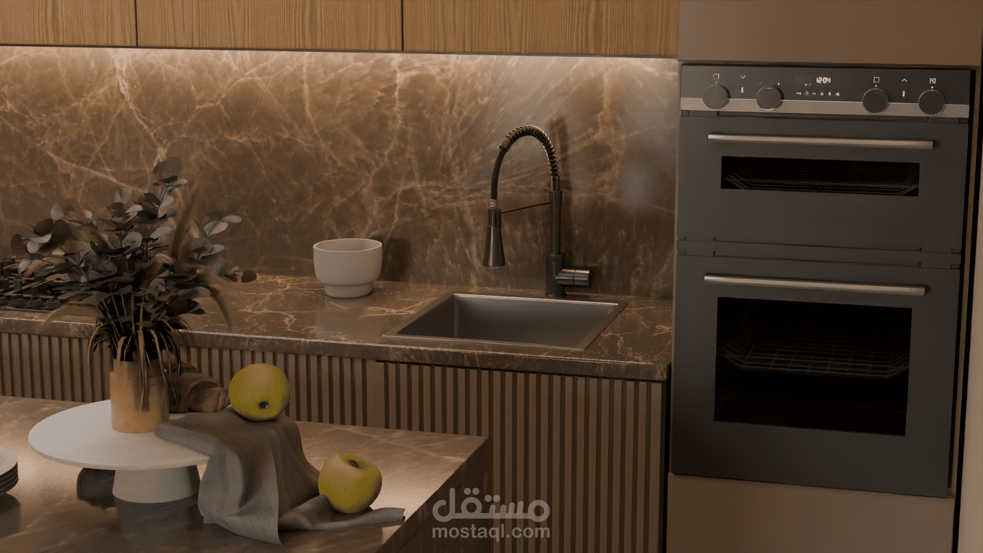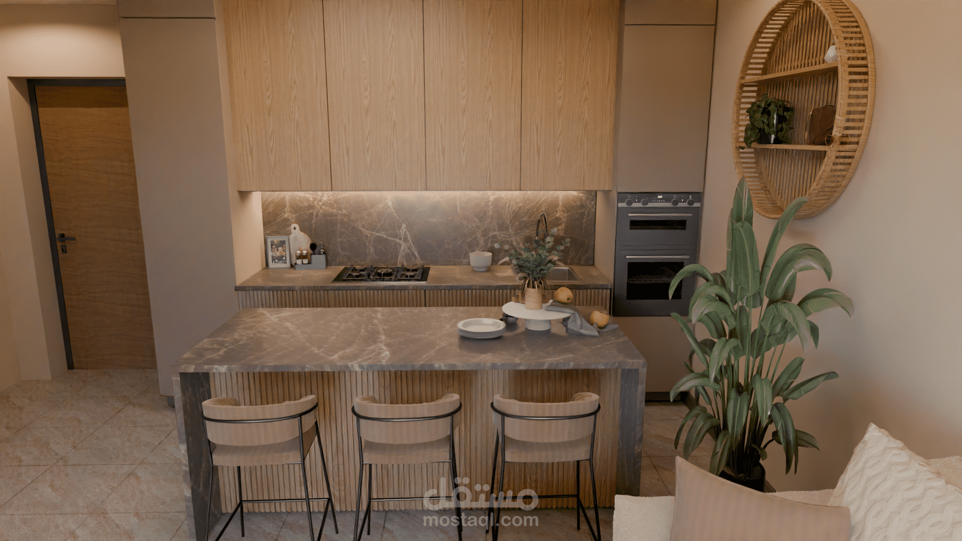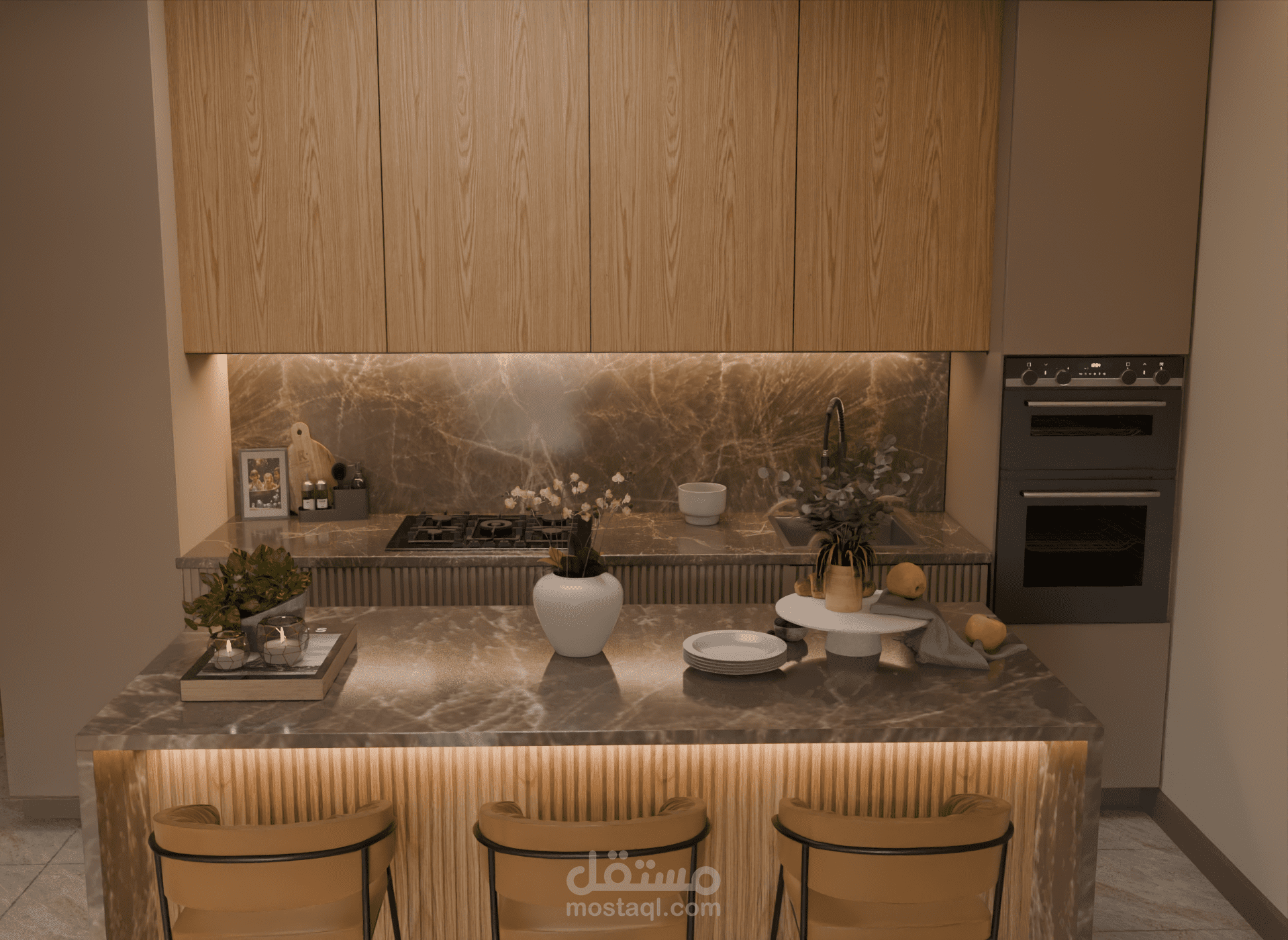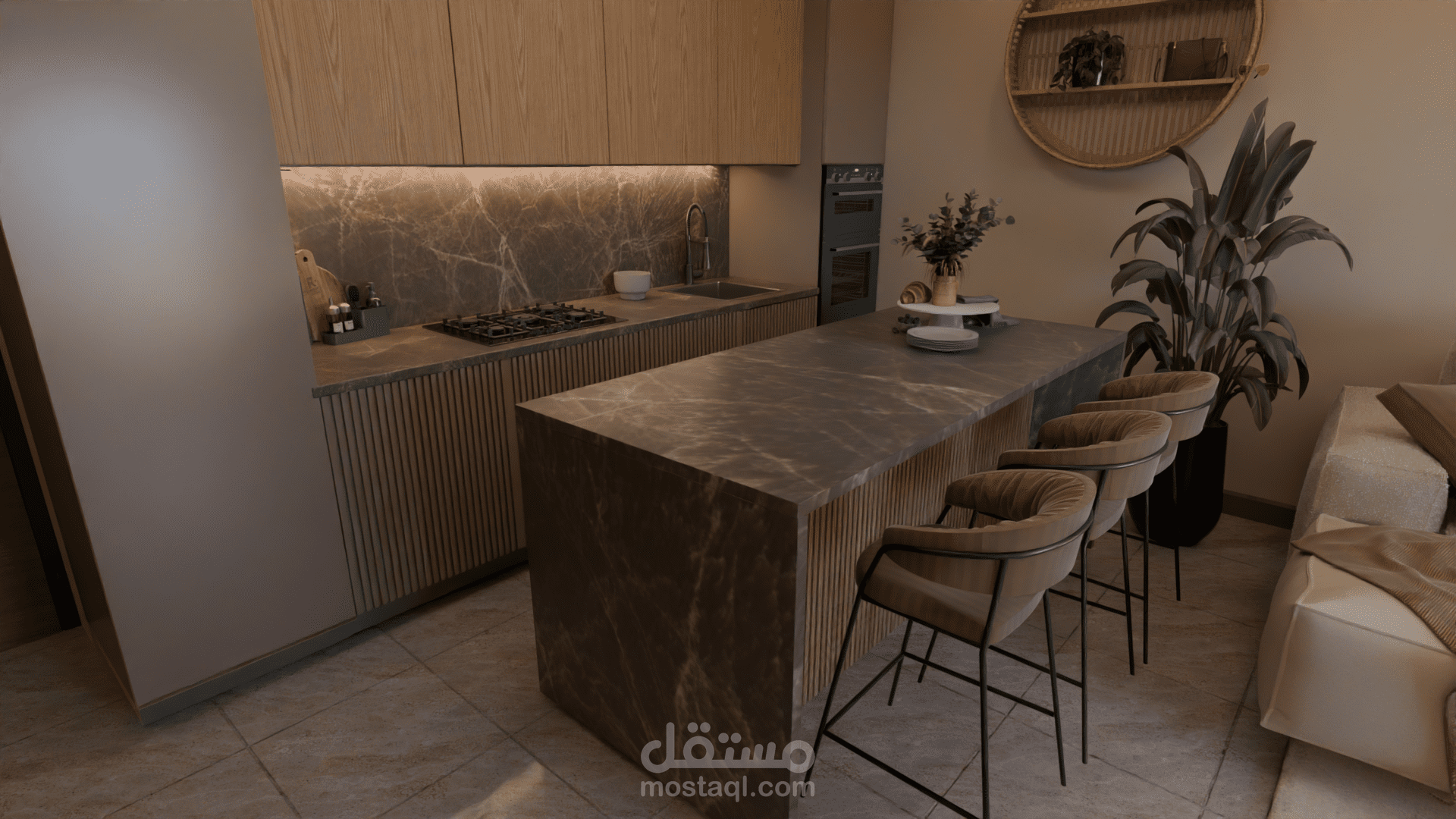 تم توظيف الإضاءة غير المباشرة بذكاء شديد، حيث تعمل خطوط الـ LED المخفية تحت الخزائن وأسفل سطح الجزيرة على إبراز التفاصيل المضلعة للخشب ومنح الرخام بريقاً يضفي عمقاً واتساعاً على المكان. التصميم يعتمد فلسفة "الخزائن المدمجة" (Built-in) التي تخفي الأجهزة الكهربائية وتجعل المطبخ يبدو كقطعة أثاث فنية متصلة بالصالة، مع استخدام لوحة ألوان ترابية هادئة تجمع بين "البيج" و"التوب" لتوفير أجواء مريحة وعصرية في آن واحد.
