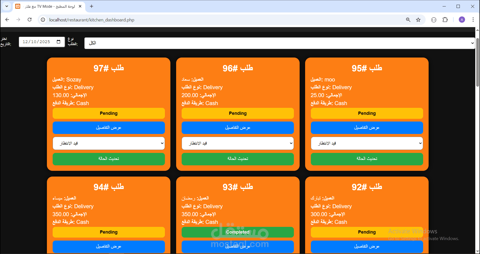 * شاشة الدليفري وتتبع الطلبات