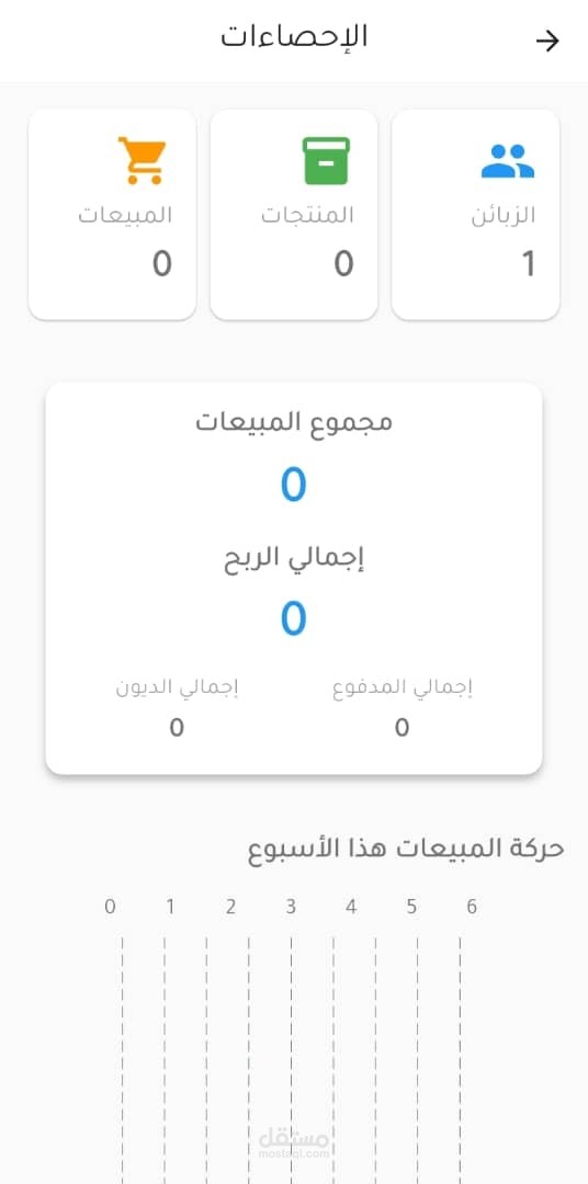 - **الإحصائيات العامة**: عدد العملاء، المنتجات، المبيعات اليومية