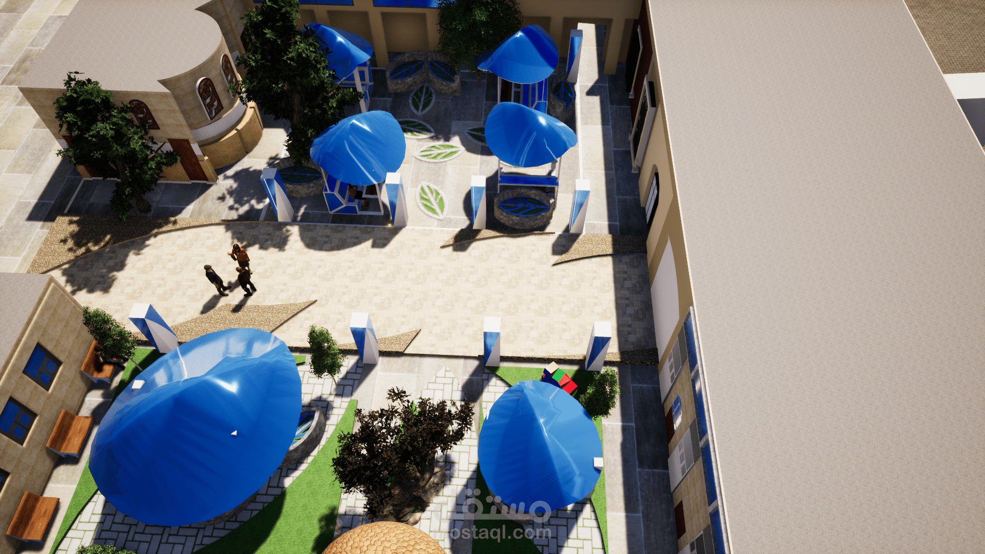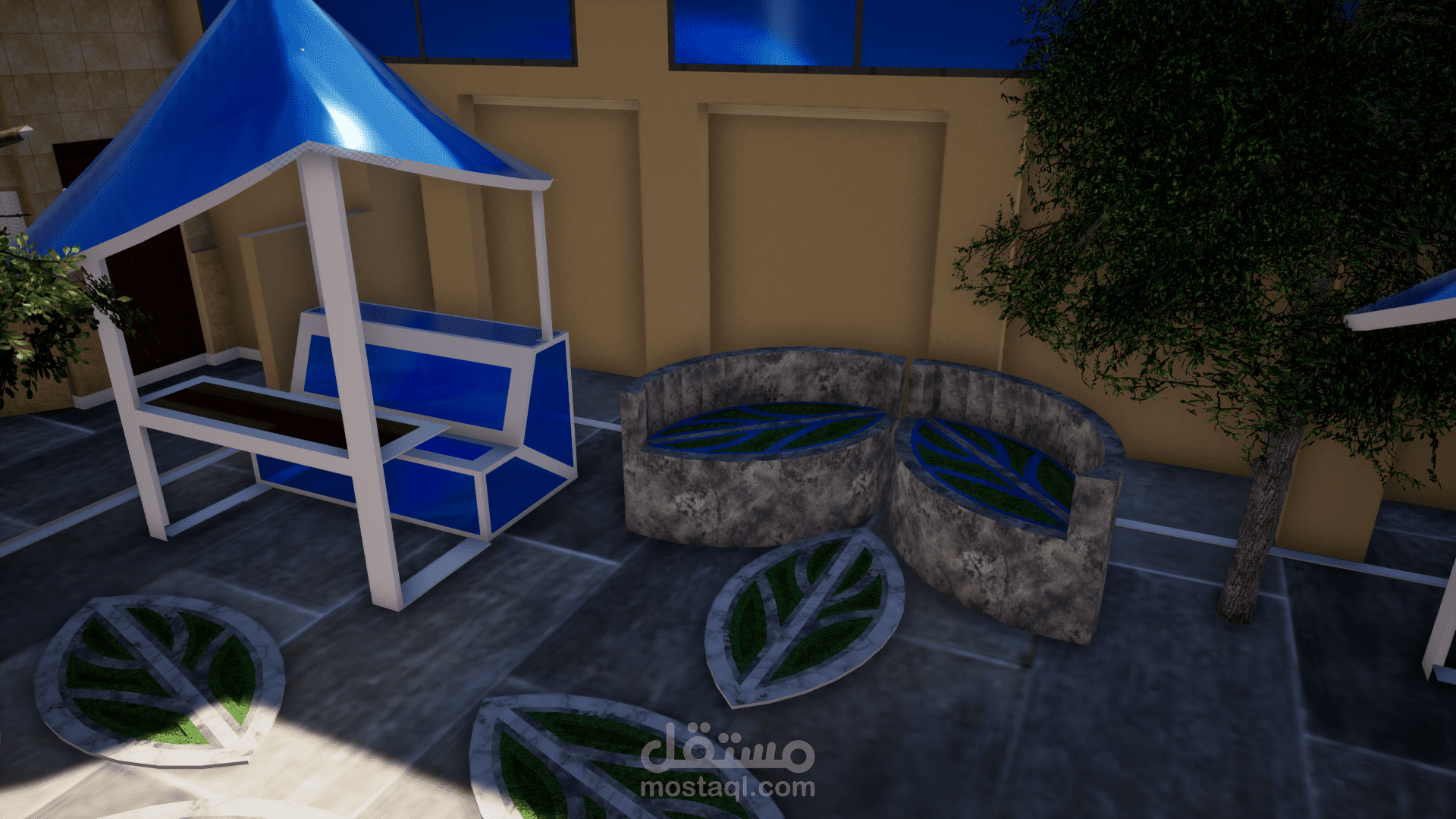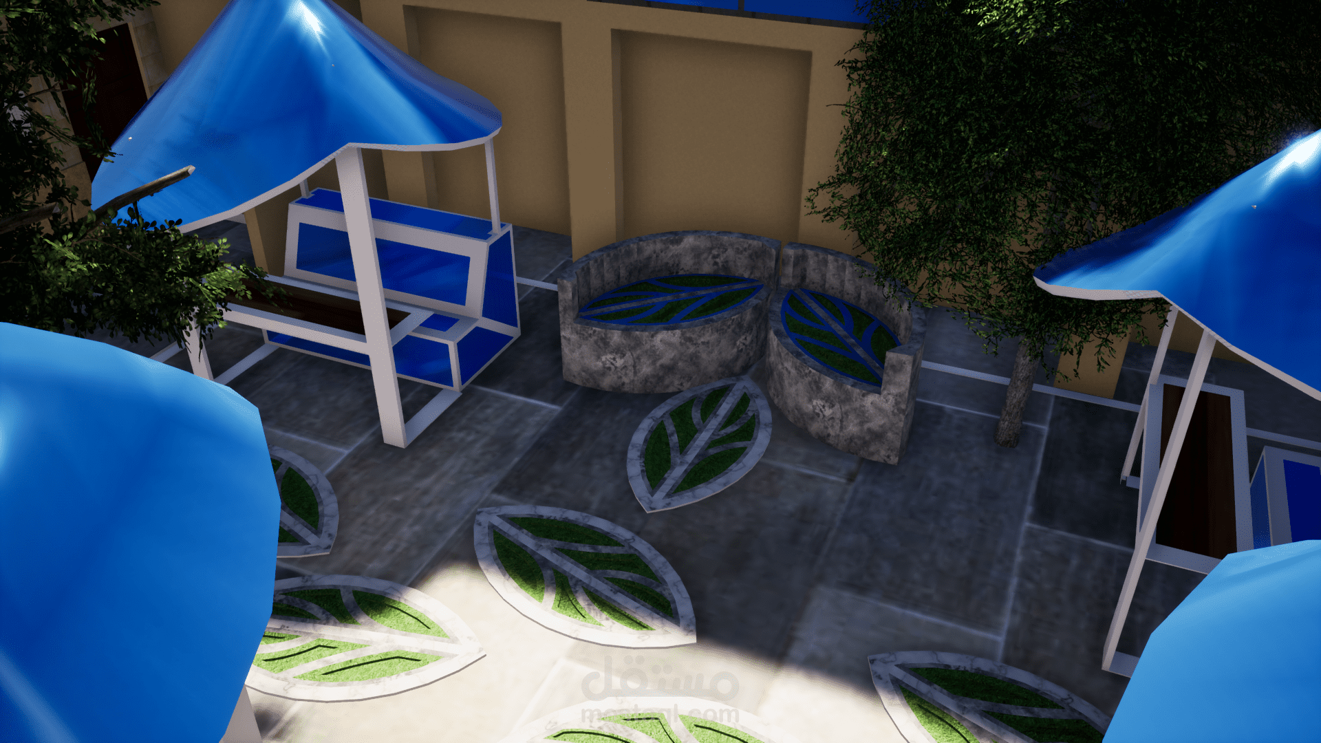 في هذا المشروع، قمتُ بتصميم ساحة خارجية تفاعلية تعتمد على دمج الأشكال الهندسية المستوحاة من الطبيعة (مثل أوراق الشجر) مع عناصر الظلال العصرية. ركزتُ في العمل على خلق توازن بصري بين المساحات الخضراء ومناطق الجلوس، مع استخدام SketchUp لبناء النماذج بدقة عالية و V-Ray للرندر لإظهار تداخل الخامات والشفافية في التصميم. العمل مدروس هندسياً ليكون قابلاً للتنفيذ كلياً، مع مراعاة أبعاد راحة المستخدم وتوزيع الإضاءة الطبيعية.