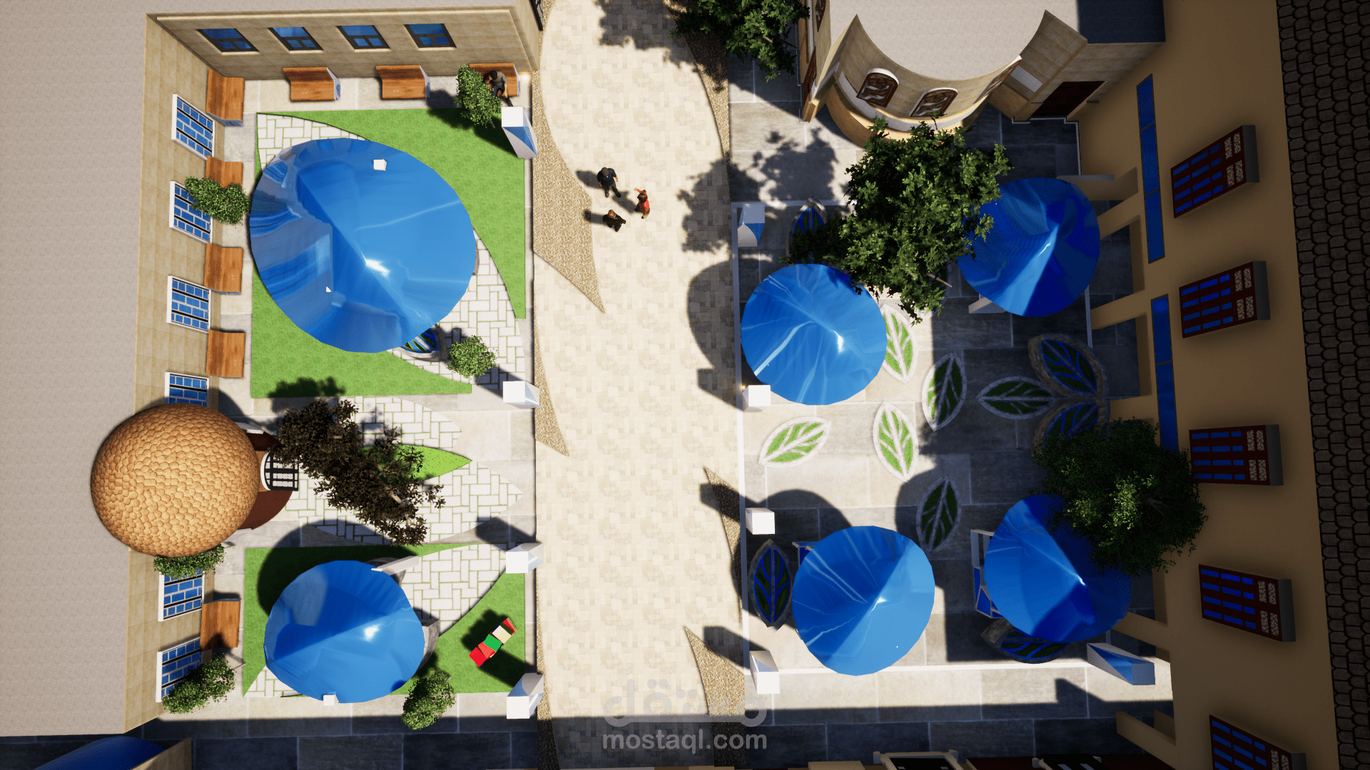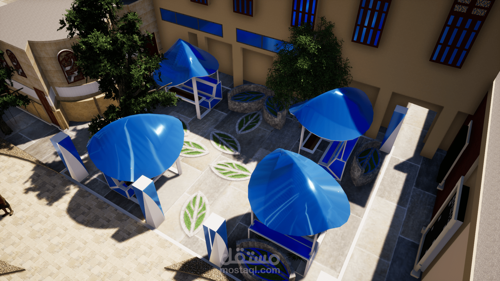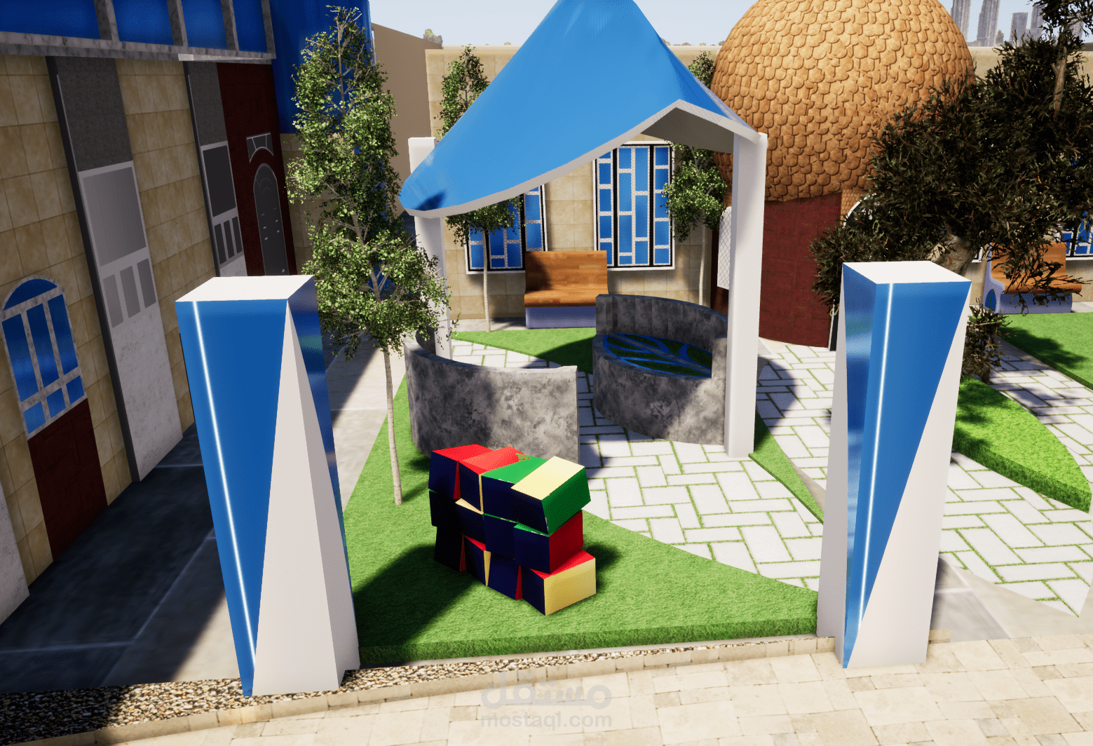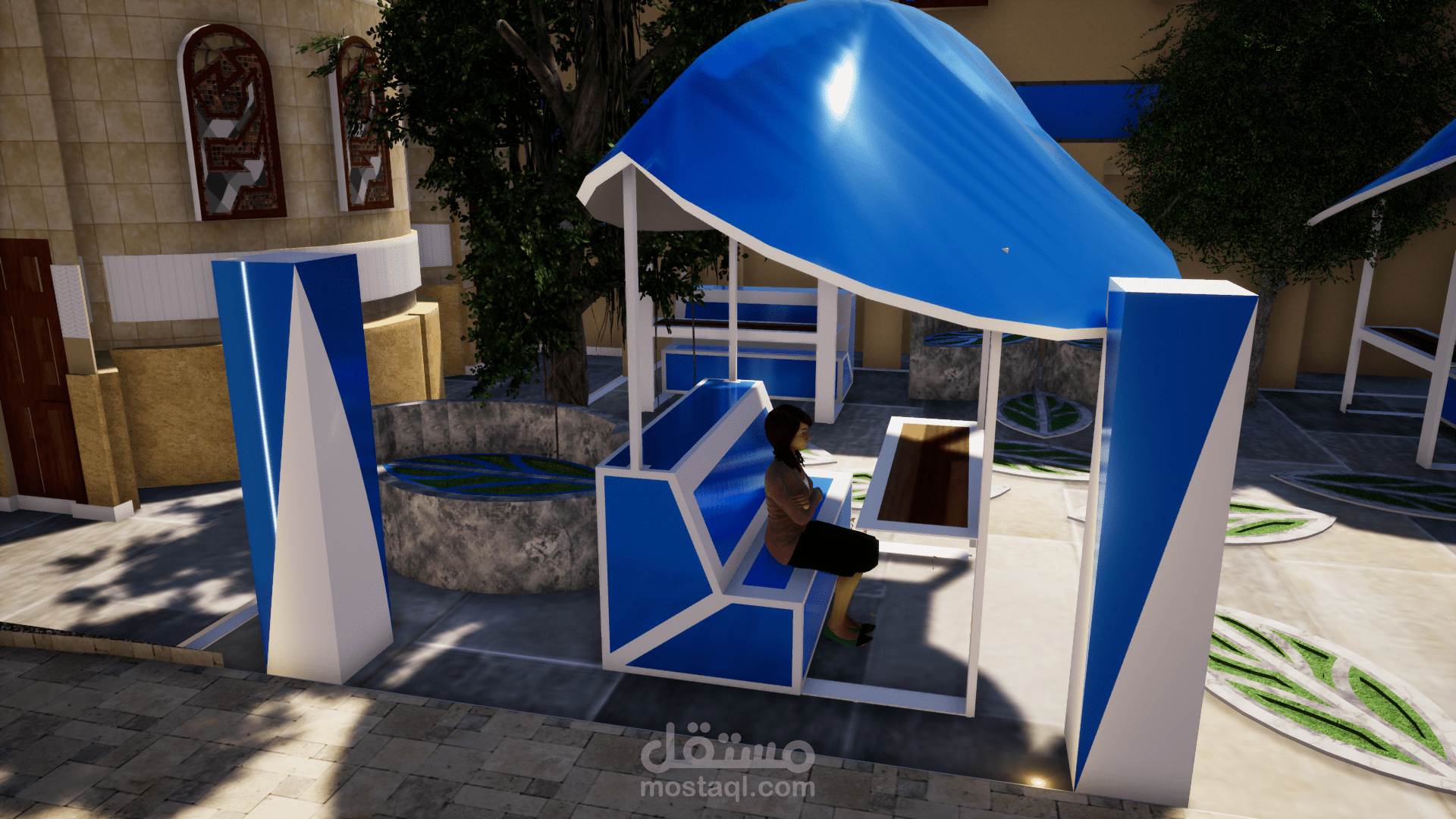 في هذا المشروع، قمتُ بتصميم ساحة خارجية تفاعلية تعتمد على دمج الأشكال الهندسية المستوحاة من الطبيعة (مثل أوراق الشجر) مع عناصر الظلال العصرية. ركزتُ في العمل على خلق توازن بصري بين المساحات الخضراء ومناطق الجلوس، مع استخدام SketchUp لبناء النماذج بدقة عالية و V-Ray للرندر لإظهار تداخل الخامات والشفافية في التصميم. العمل مدروس هندسياً ليكون قابلاً للتنفيذ كلياً، مع مراعاة أبعاد راحة المستخدم وتوزيع الإضاءة الطبيعية.