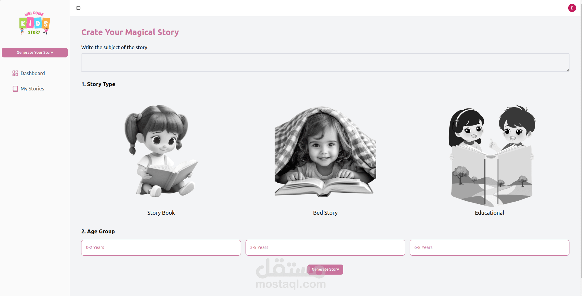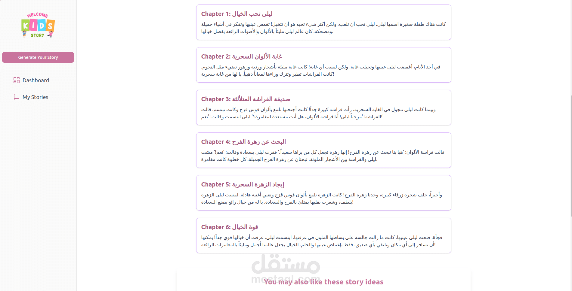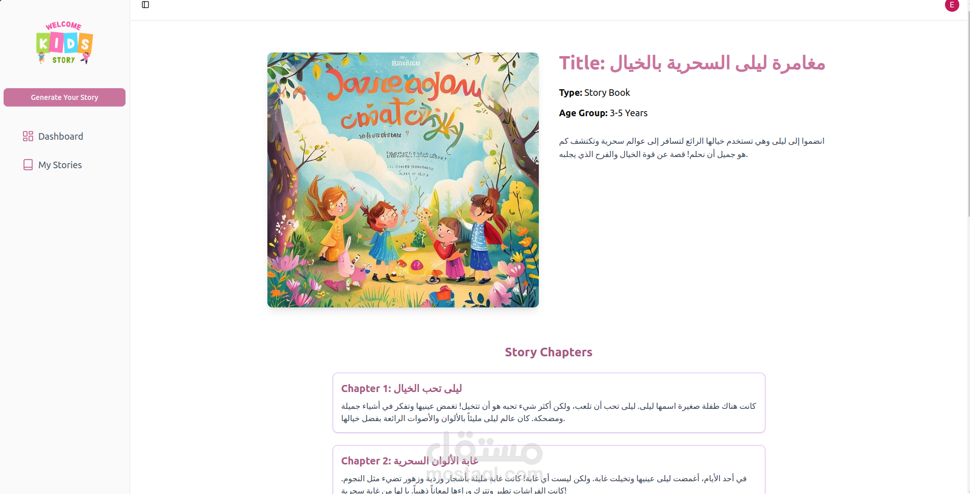 تطبيق ويب تفاعلي يستخدم الذكاء الاصطناعي لإنشاء قصص أطفال مخصصة بناءً على مدخلات المستخدم. يمكن للمستخدمين تخصيص القصة باختيار عمر الطفل، ونوع القصة المفضل (مثل: قصة ما قبل النوم، تعليمية، مغامرات)، والشخصيات الرئيسية، والمواضيع. دوري: تطوير شامل، هندسة سريعة لتوليد القصص بالذكاء الاصطناعي، واجهة المستخدم.