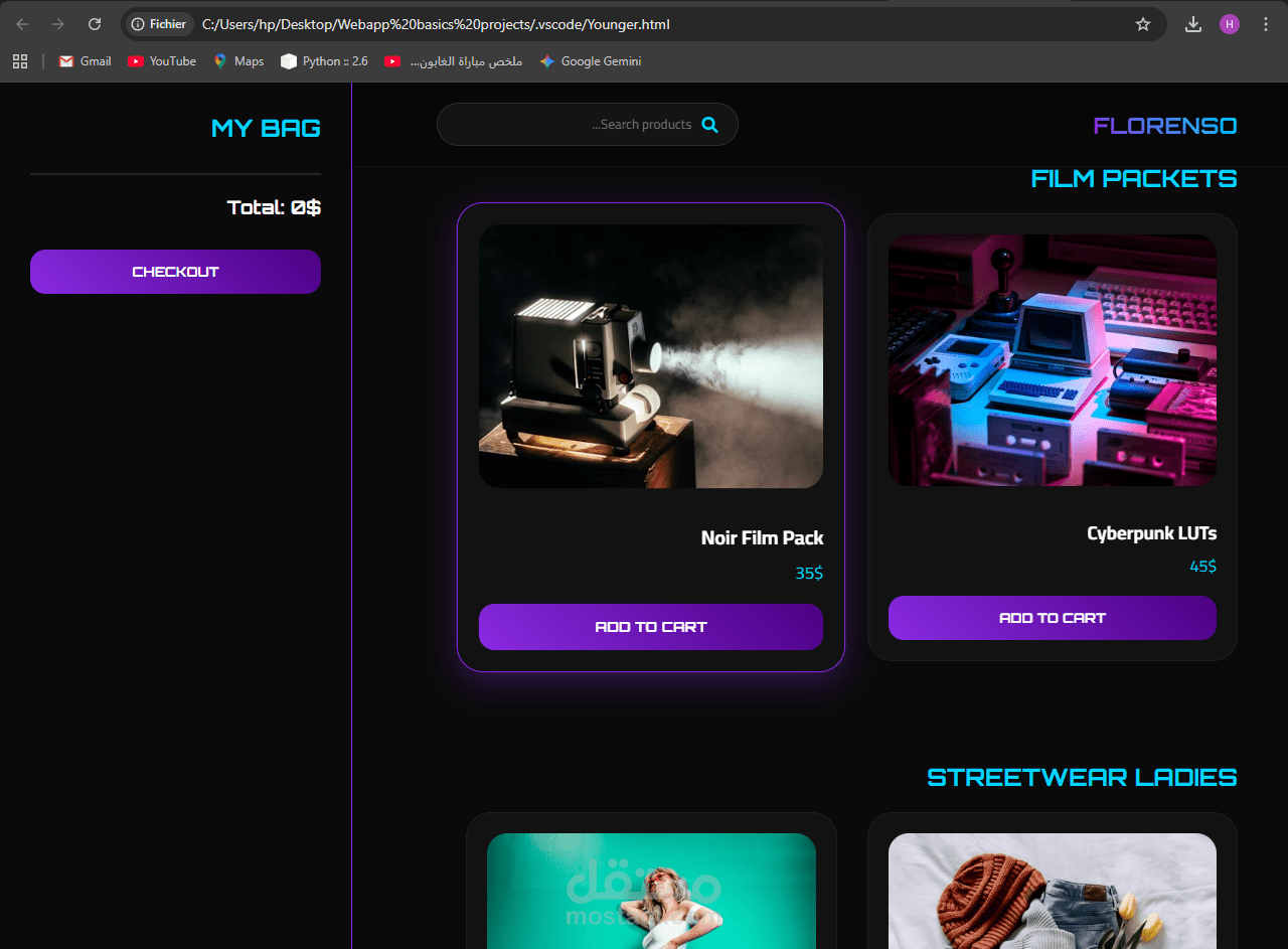 مشروع Florenso Dark Edition هو تجسيد للأناقة الرقمية الحديثة. تم تصميم الواجهة لتناسب الجيل الجديد من المتسوقين الذين يبحثون عن الغموض والقوة في التصميم. يعتمد المشروع على اللون الأسود العميق (Deep Black) مع تداخلات لونية من الأرجواني النيوني (Neon Purple) والأزرق السماوي (Cyan)، مما يخلق تبايناً بصرياً مذهلاً يريح العين ويوجه الانتباه مباشرة نحو المنتجات.