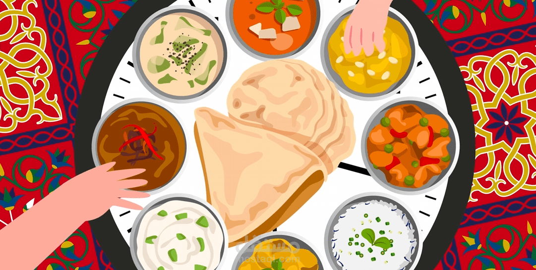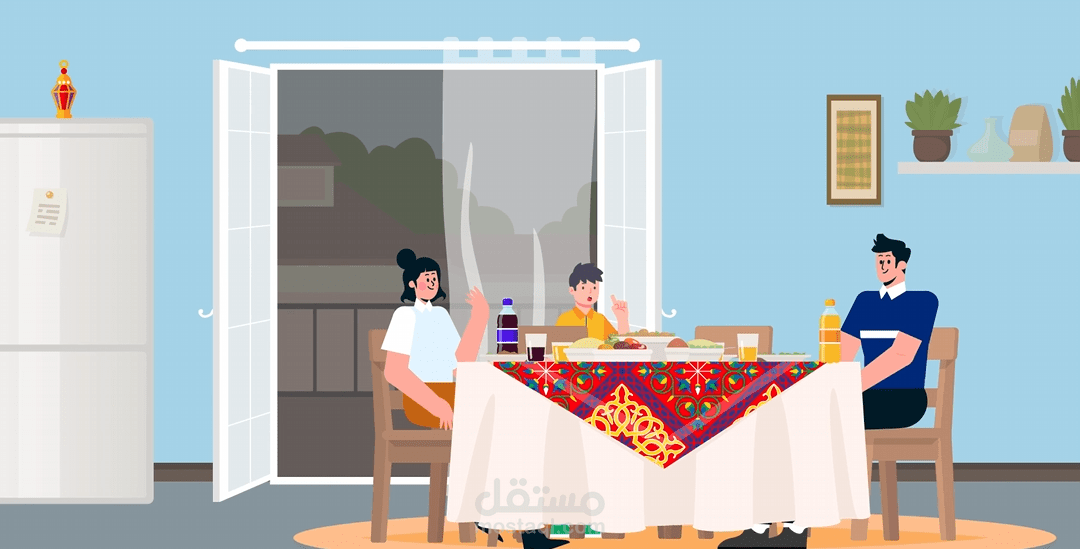 الصورة 05: يبدأ المشهد باستعراض مائدة الطعام (الإفطار أو السحور)، مما يشير إلى أجواء شهر رمضان وتجمع العائلة.