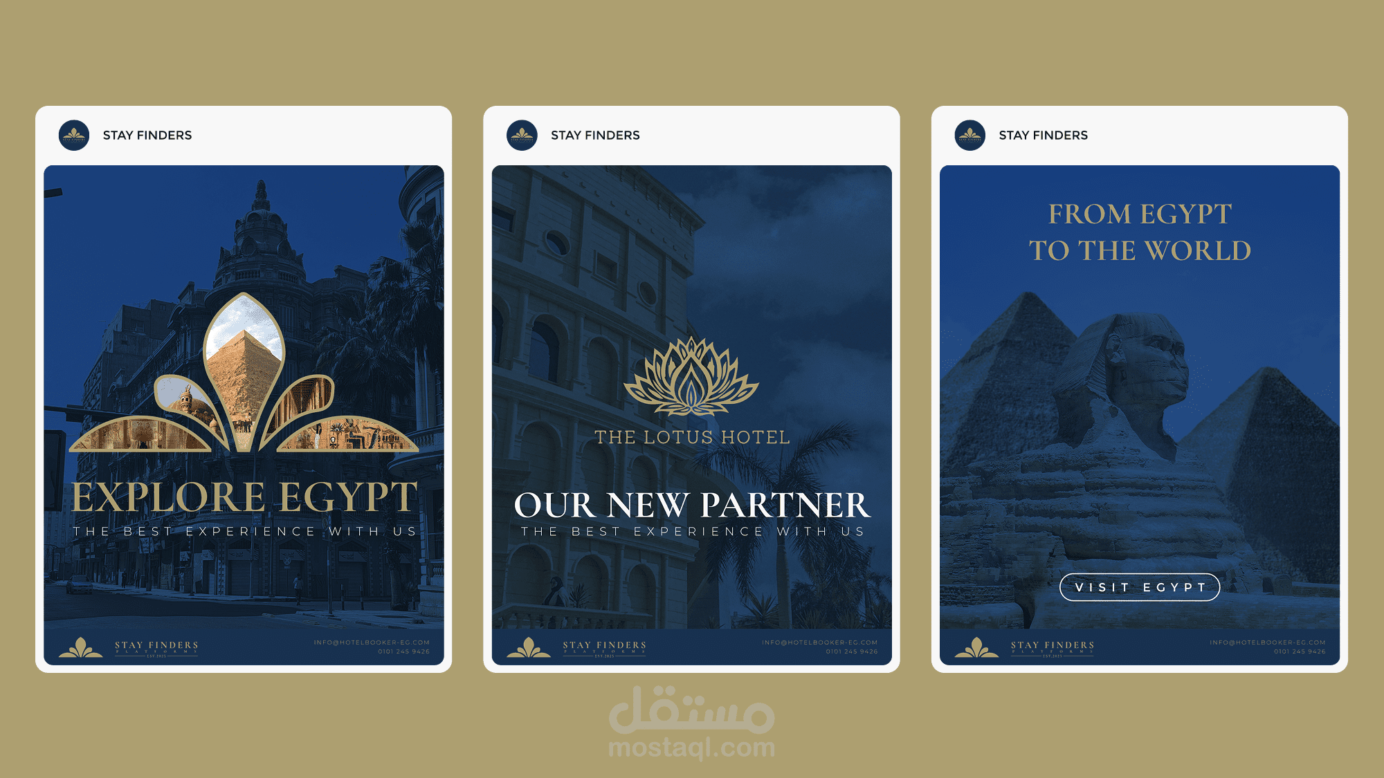 صممت هوية بصرية متكاملة وفاخرة لمنصة "Stay Finders Platforms"، علامة تجارية ذكية في الضيافة تربط المسافرين بإقامات موثوقة في مصر والعالم العربي (بوتيك، نزل عائلية، منتجعات فاخرة). الهوية ثنائية اللغة، تجمع الحداثة بالتراث المصري لتعزيز السياحة عبر منصة تقنية محلية.