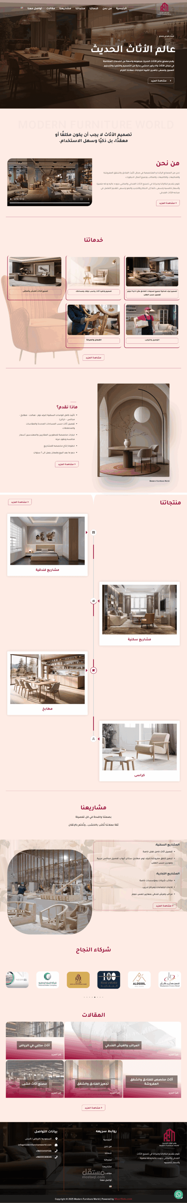 The Modern Furniture World website features an elegant design that reflects luxury and professionalism in the world of furniture and interior design. The main pages include: Home, About Us, Services, Products, Projects, Articles, and Contact Us, making navigation organized and simple. The user experience is smooth, allowing visitors to clearly discover the company’s identity and services, while showcasing projects and products in a modern style that emphasizes quality and precision. Additionally, the Contact page is designed to make it easy for customers to reach out and build trust with the brand.