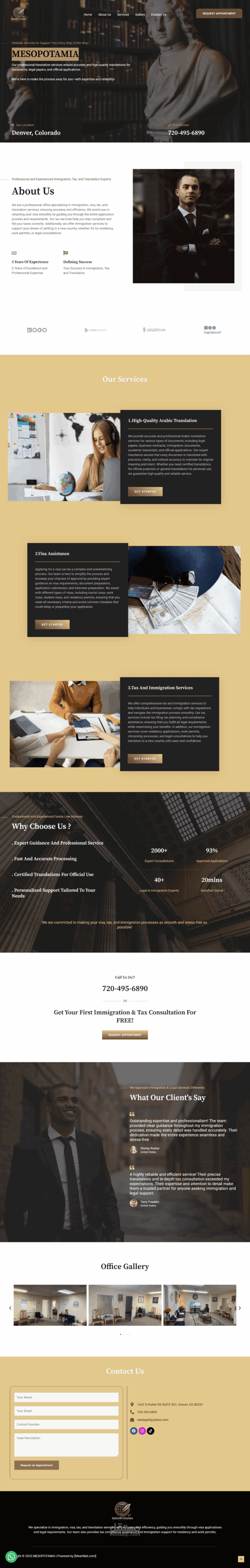 Mesopotamia Solutions is a professional services office based in Denver, Colorado, specializing in providing comprehensive solutions in immigration, visas, taxation, and certified translation. The website is designed as a single-page layout, making it easy for visitors to access all information quickly and efficiently.