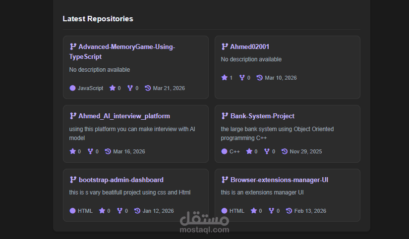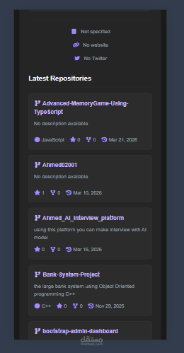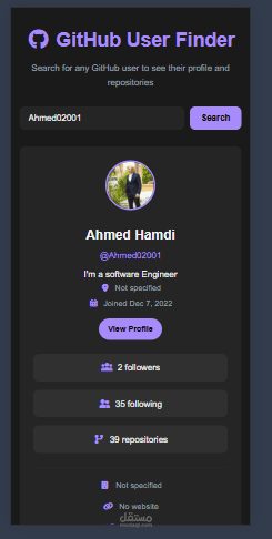 وهو ايضا تطبيق ويب متكامل يتيح للمستخدمين البحث عن أي حساب على منصة GitHub والحصول على تفاصيل دقيقة وشاملة حول المستخدم في واجهة واحدة. يتميز المشروع بتصميم عصري (Dark Mode) يركز على تجربة المستخدم وسرعة استجابة البيانات.
