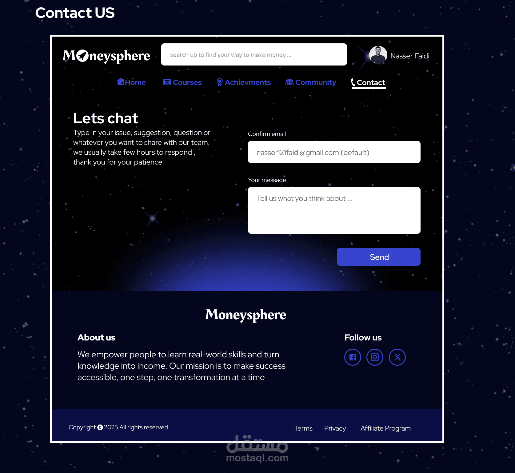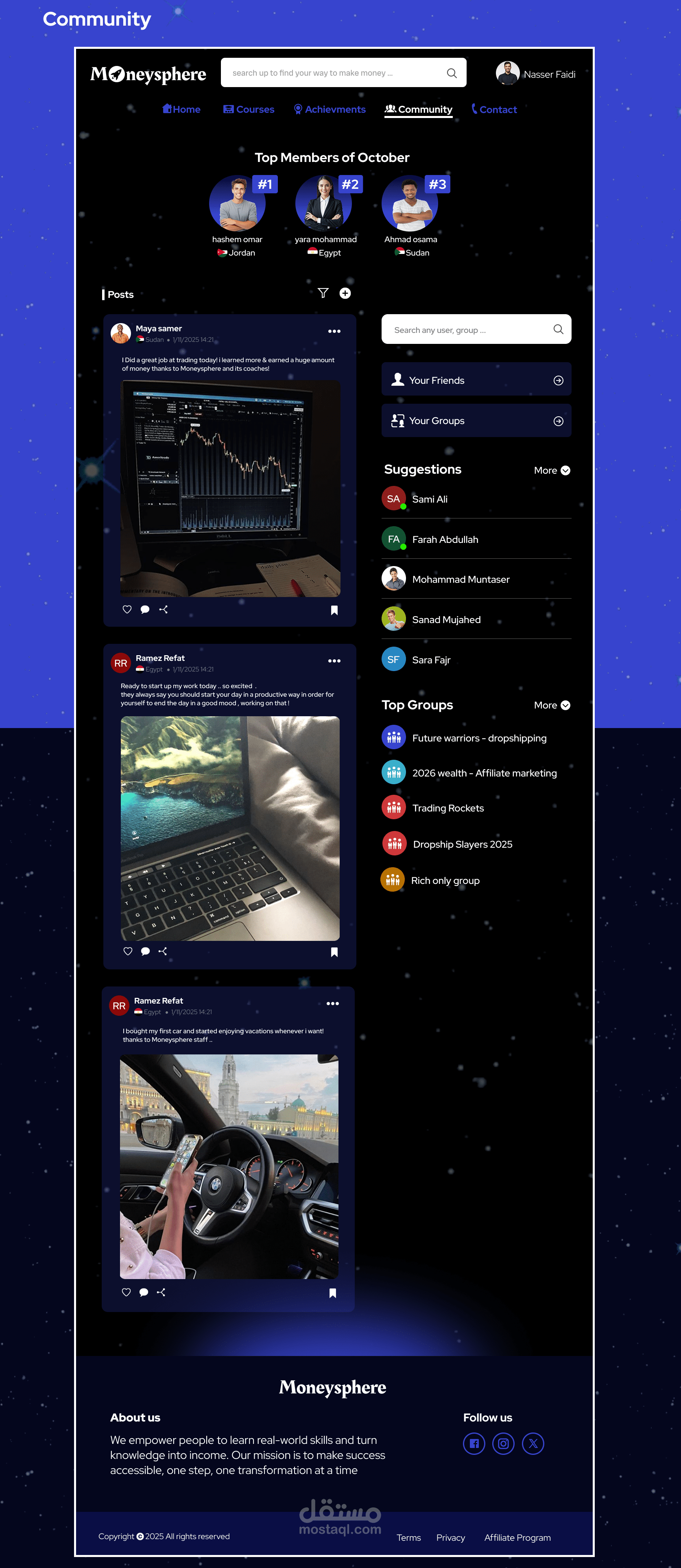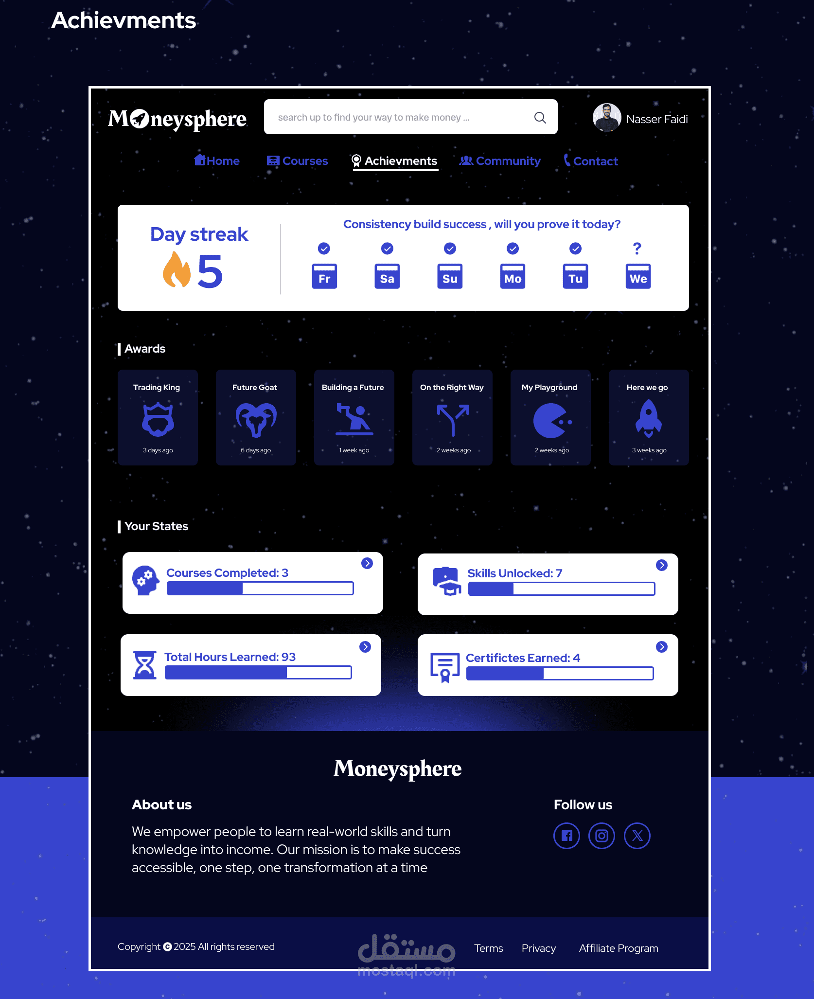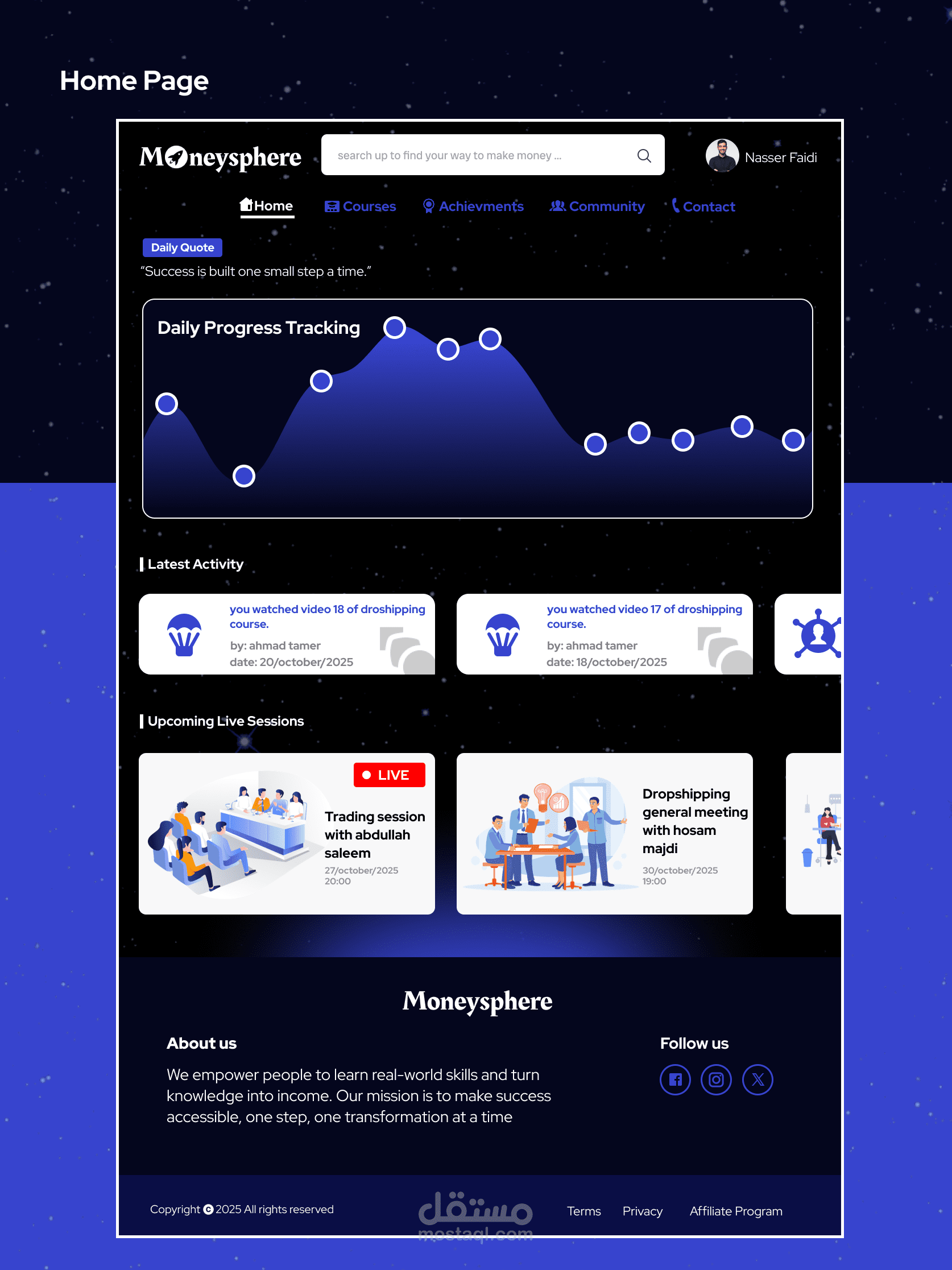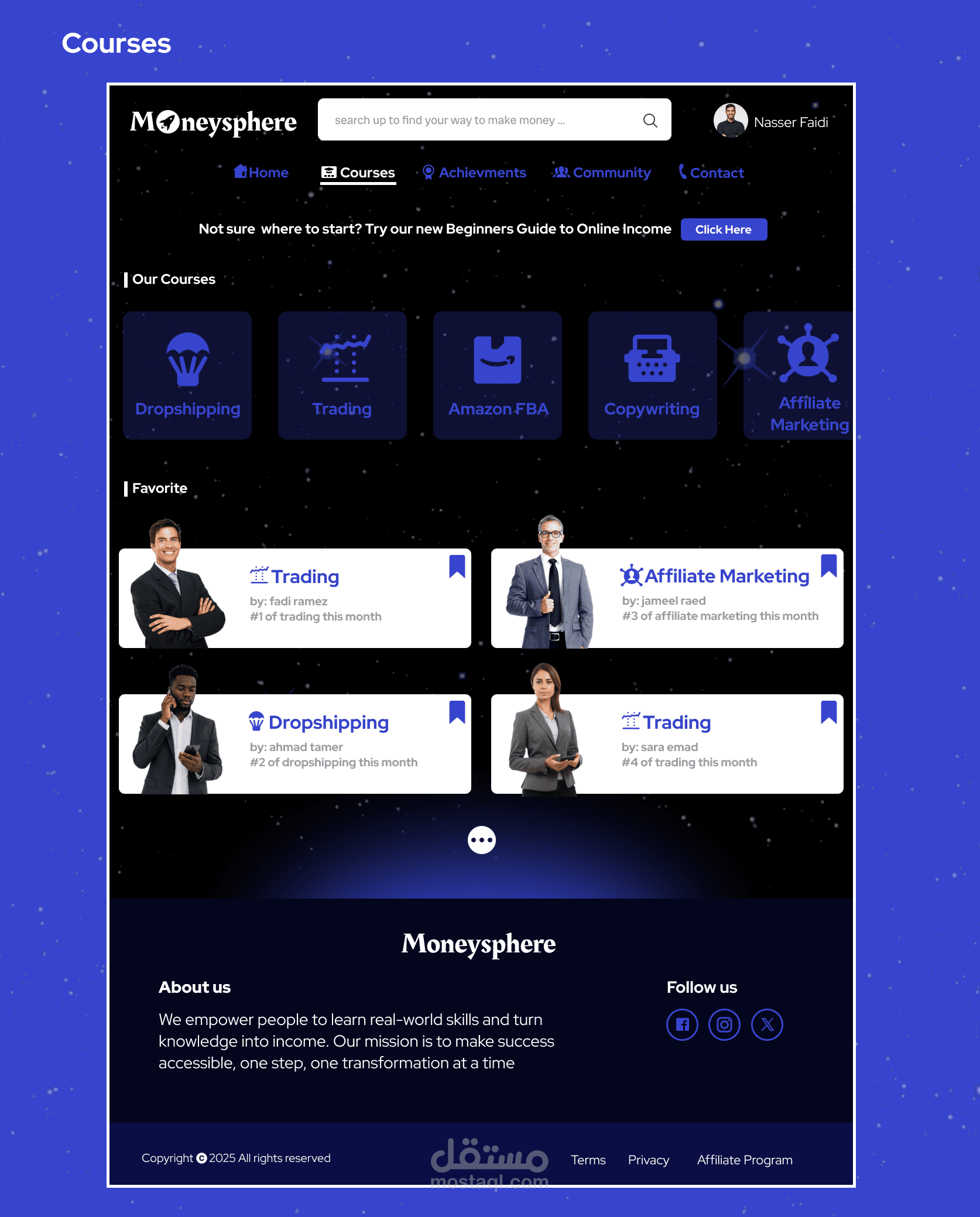 Moneysphere هو منصة تساعد الناس في كسب الاموال رقميًا ، حيث انه يوفر مجموعة دورات تعليمية وطرق تتبع لتقدم المستخدم ويوفر تواصل واشتراكات مع المعلمين وعدة مزايا اخرى.